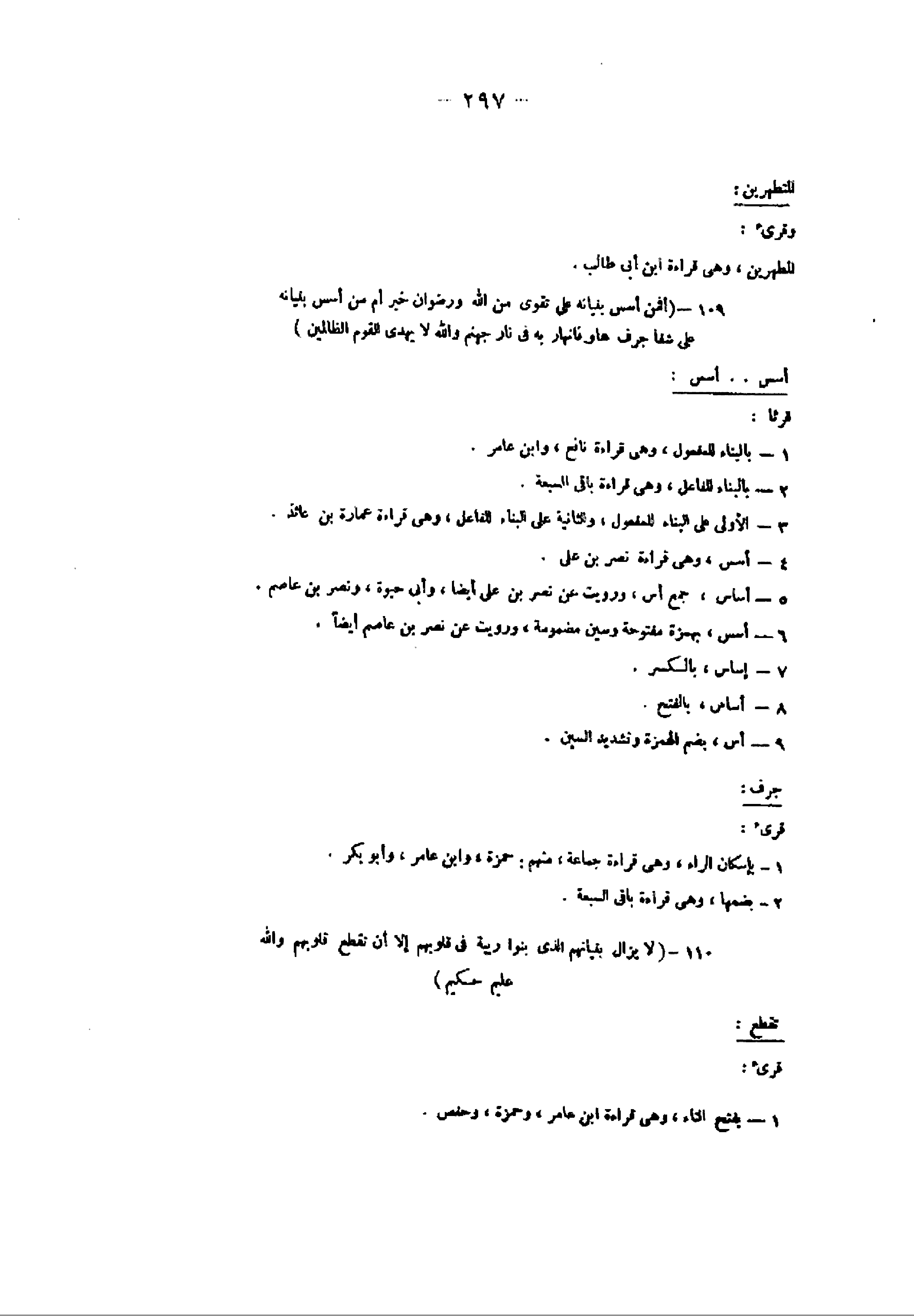 109- (أَفَمَنْ أَسَّسَ بُنْيانَهُ عَلى تَقْوى مِنَ اللَّهِ وَرِضْوانٍ خَيْرٌ أَمْ مَنْ أَسَّسَ بُنْيانَهُ عَلى شَفا جُرُفٍ هارٍ فَانْهارَ بِهِ فِي نارِ جَهَنَّمَ وَاللَّهُ لا يَهْدِي الْقَوْمَ الظَّالِمِينَ) أسس.. أسس: