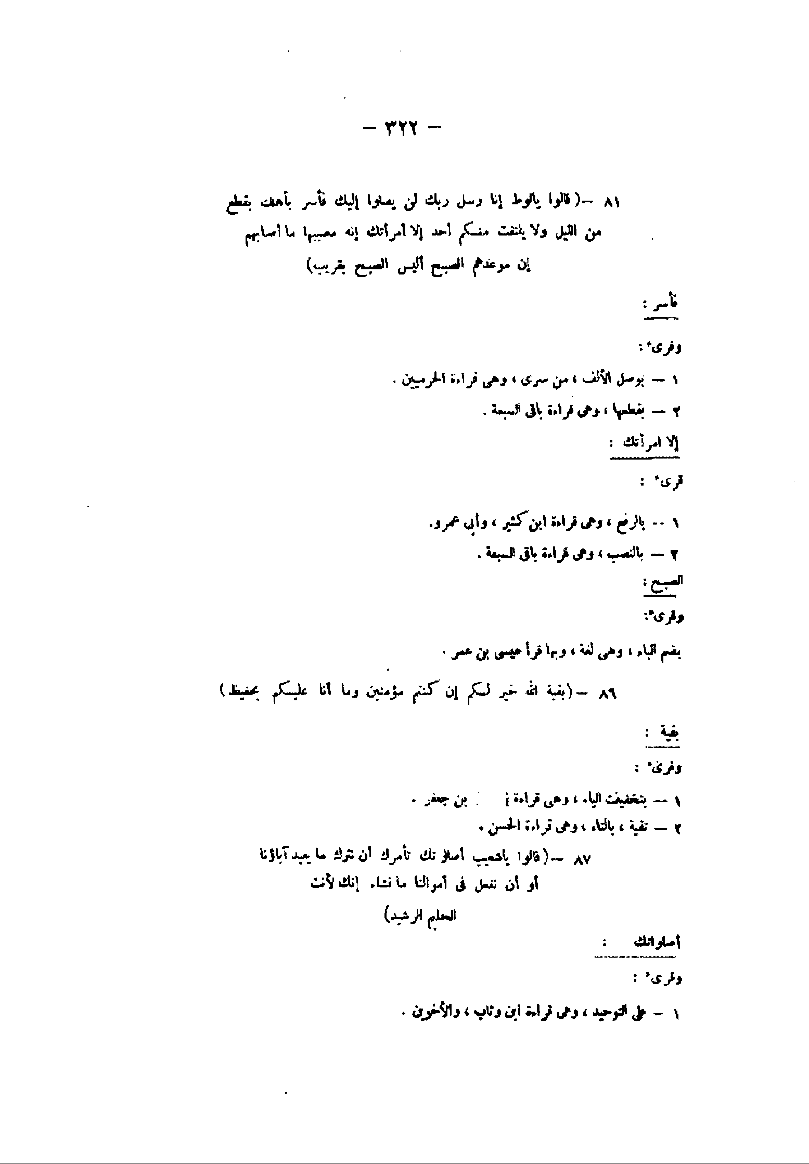 81- (قالُوا يا لُوطُ إِنَّا رُسُلُ رَبِّكَ لَنْ يَصِلُوا إِلَيْكَ فَأَسْرِ بِأَهْلِكَ بِقِطْعٍ مِنَ اللَّيْلِ وَلا يَلْتَفِتْ مِنْكُمْ أَحَدٌ إِلَّا امْرَأَتَكَ إِنَّهُ مُصِيبُها ما أَصابَهُمْ إِنَّ مَوْعِدَهُمُ الصُّبْحُ أَلَيْسَ الصُّبْحُ بِقَرِيبٍ) فأسر: