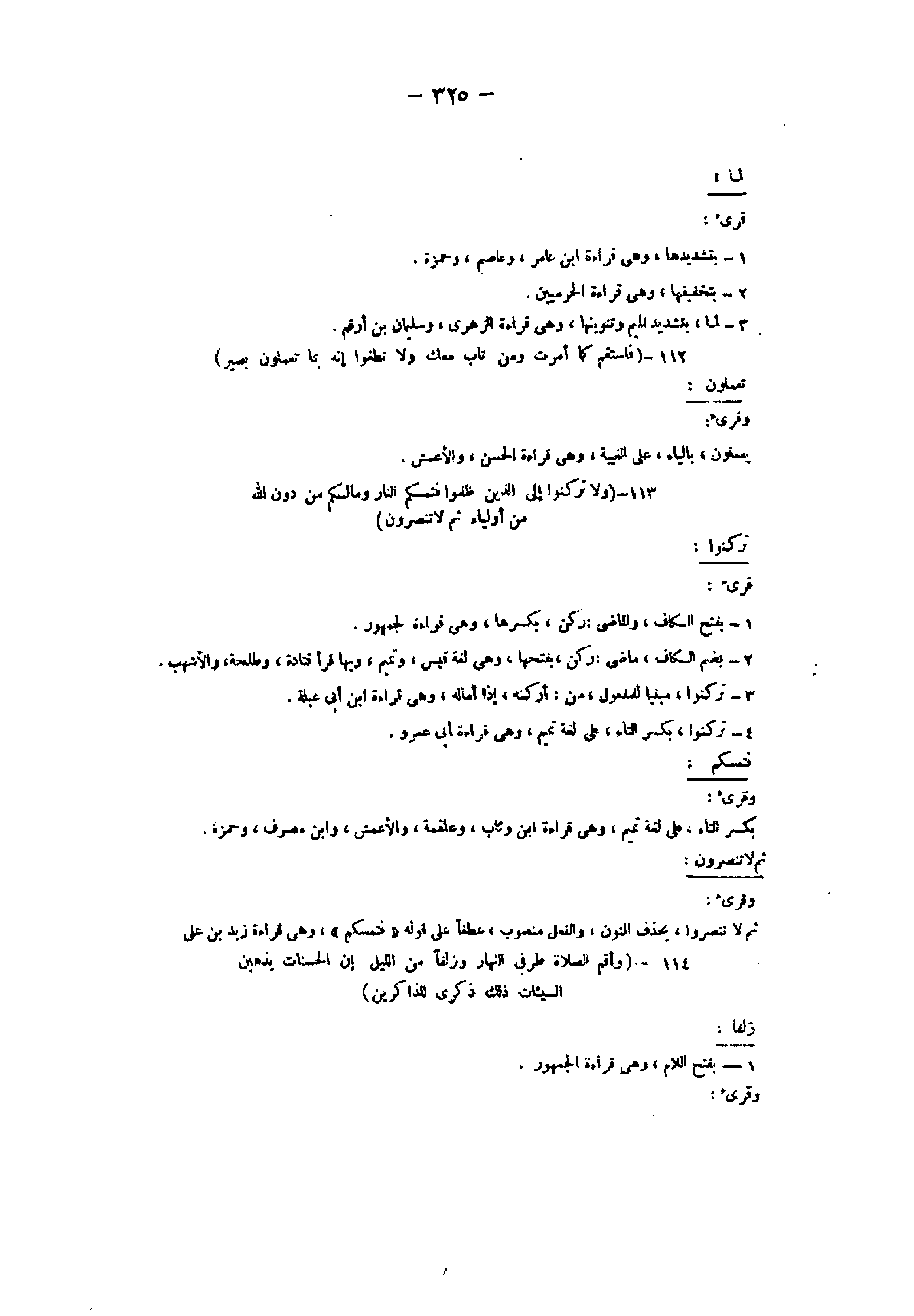 ثم لا تنصروا، بحذف النون، والفعل منصوب، عطفا على قوله «فتمسكم» ، وهى قراءة زيد بن على 114- (وَأَقِمِ الصَّلاةَ طَرَفَيِ النَّهارِ وَزُلَفاً مِنَ اللَّيْلِ إِنَّ الْحَسَناتِ يُذْهِبْنَ السَّيِّئاتِ ذلِكَ ذِكْرى لِلذَّاكِرِينَ) زلفا: