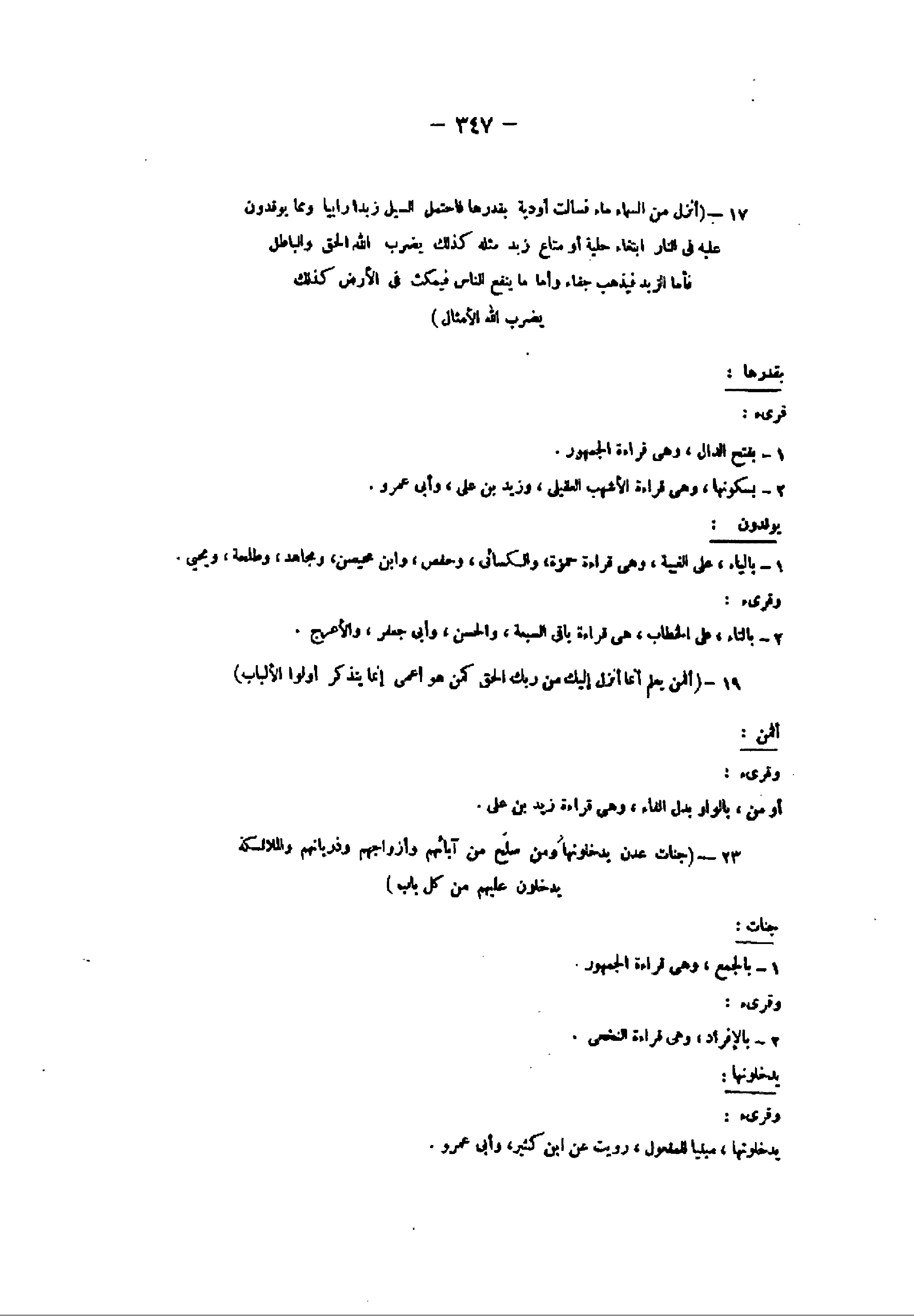 17- (أَنْزَلَ مِنَ السَّماءِ ماءً فَسالَتْ أَوْدِيَةٌ بِقَدَرِها فَاحْتَمَلَ السَّيْلُ زَبَداً رابِياً وَمِمَّا يُوقِدُونَ عَلَيْهِ فِي النَّارِ ابْتِغاءَ حِلْيَةٍ أَوْ مَتاعٍ زَبَدٌ مِثْلُهُ كَذلِكَ يَضْرِبُ اللَّهُ الْحَقَّ وَالْباطِلَ فَأَمَّا الزَّبَدُ فَيَذْهَبُ جُفاءً وَأَمَّا ما يَنْفَعُ النَّاسَ فَيَمْكُثُ فِي الْأَرْضِ كَذلِكَ يَضْرِبُ اللَّهُ الْأَمْثالَ) بقدرها: