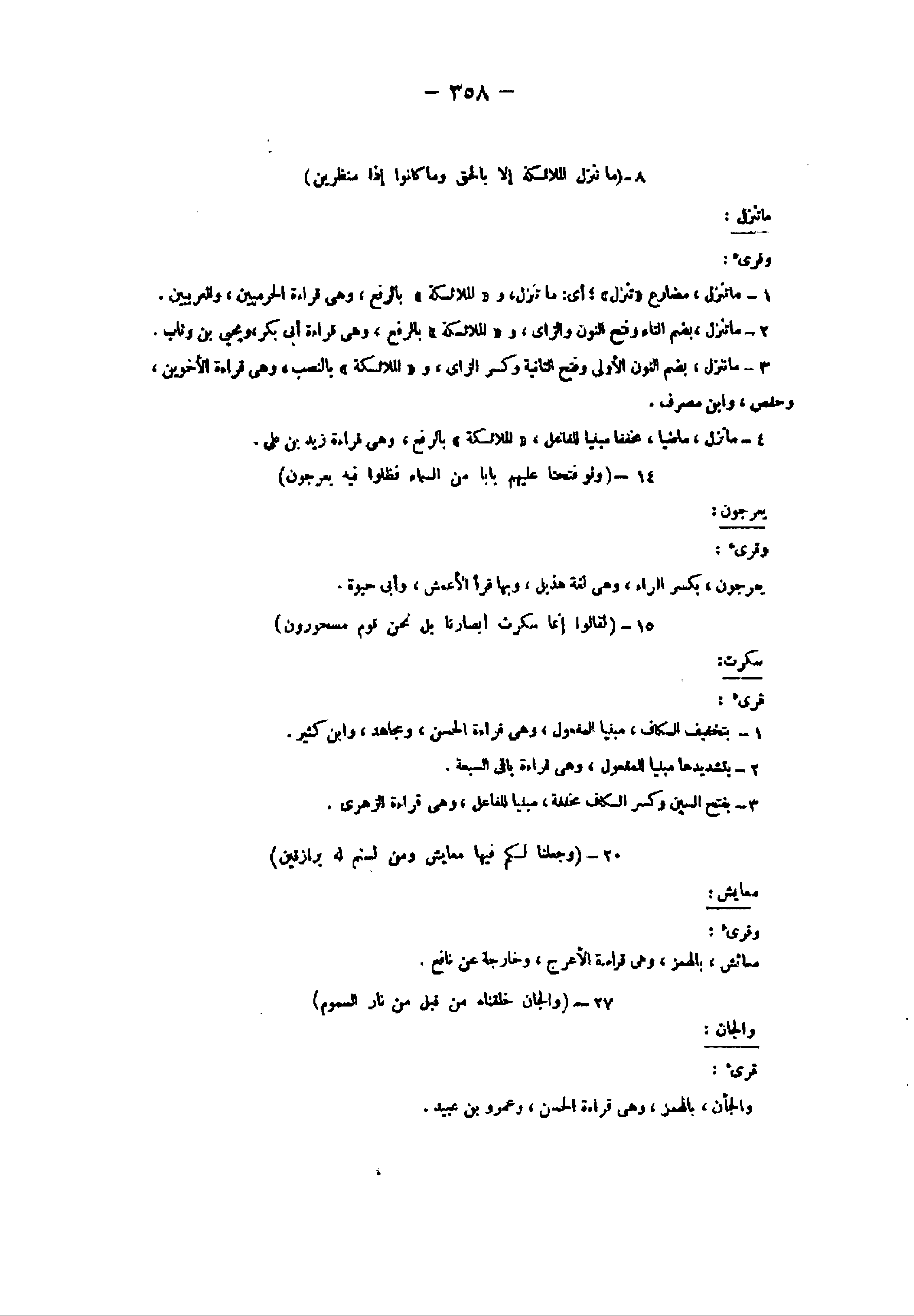 3- ما تنزل، بضم النون الأولى وفتح الثانية وكسر الزاى، و «الملائكة» بالنصب، وهى قراءة الأخوين، وحفص، وابن مصرف.