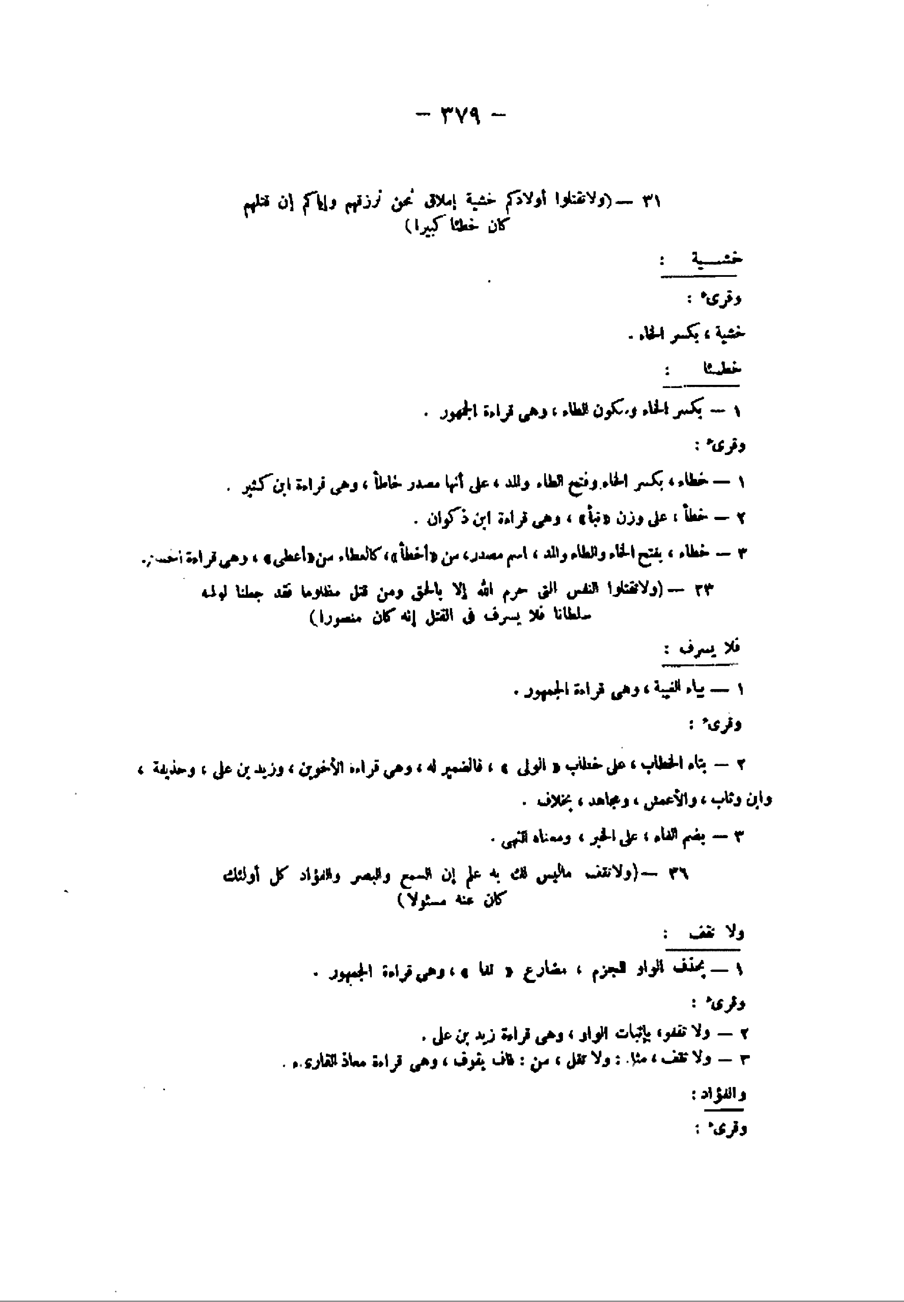 31- (ولا تقتلوا أولادكم خشية إملاق نحن نرزقهم وإياكم إن قتلهم كان خطئا كبيرا) خشية: