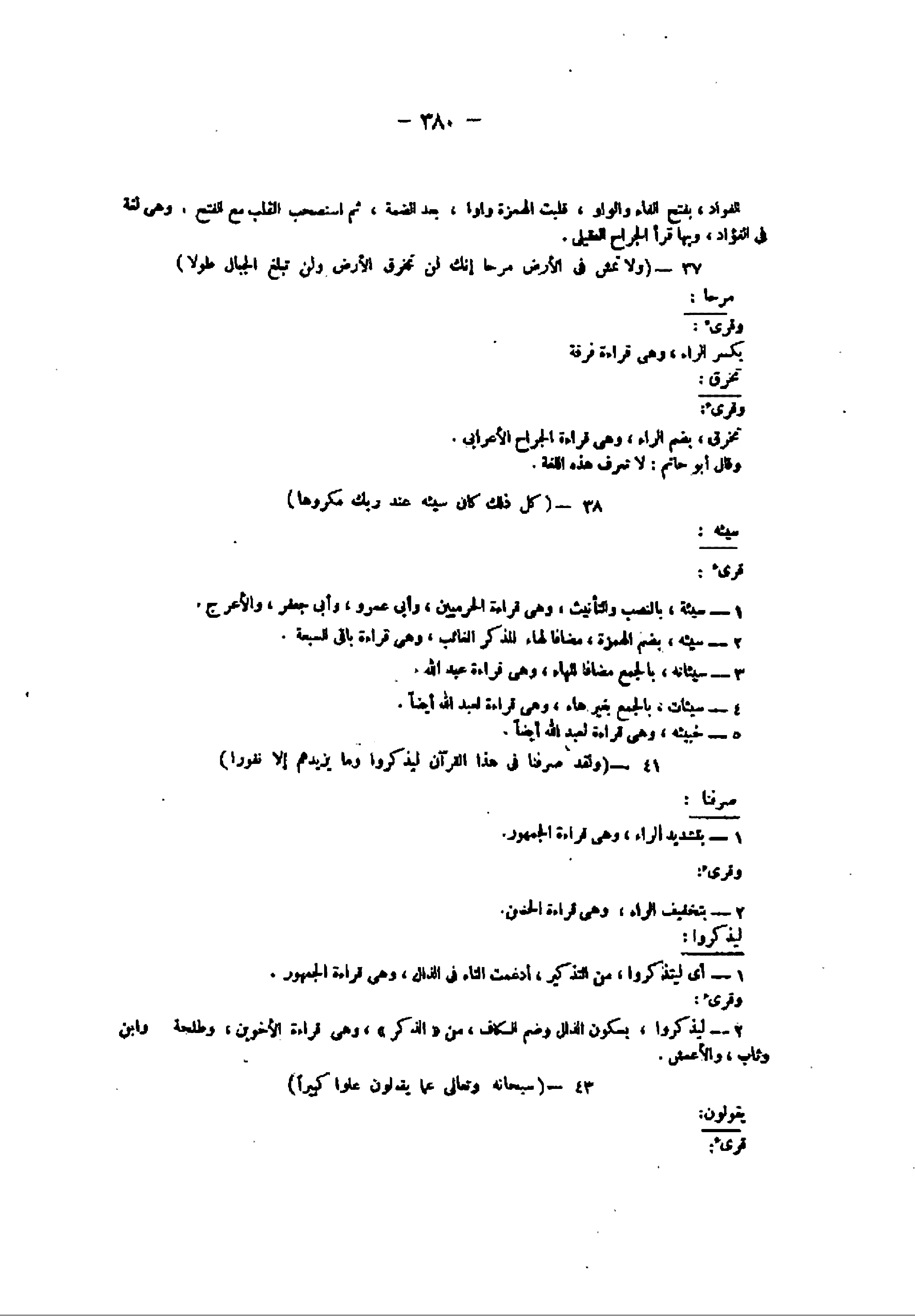 2- ليذكروا، بسكون الذال وضم الكاف، من «الذكر» ، وهى قراءة الأخوين، وطلحة وابن وثاب، والأعمش.