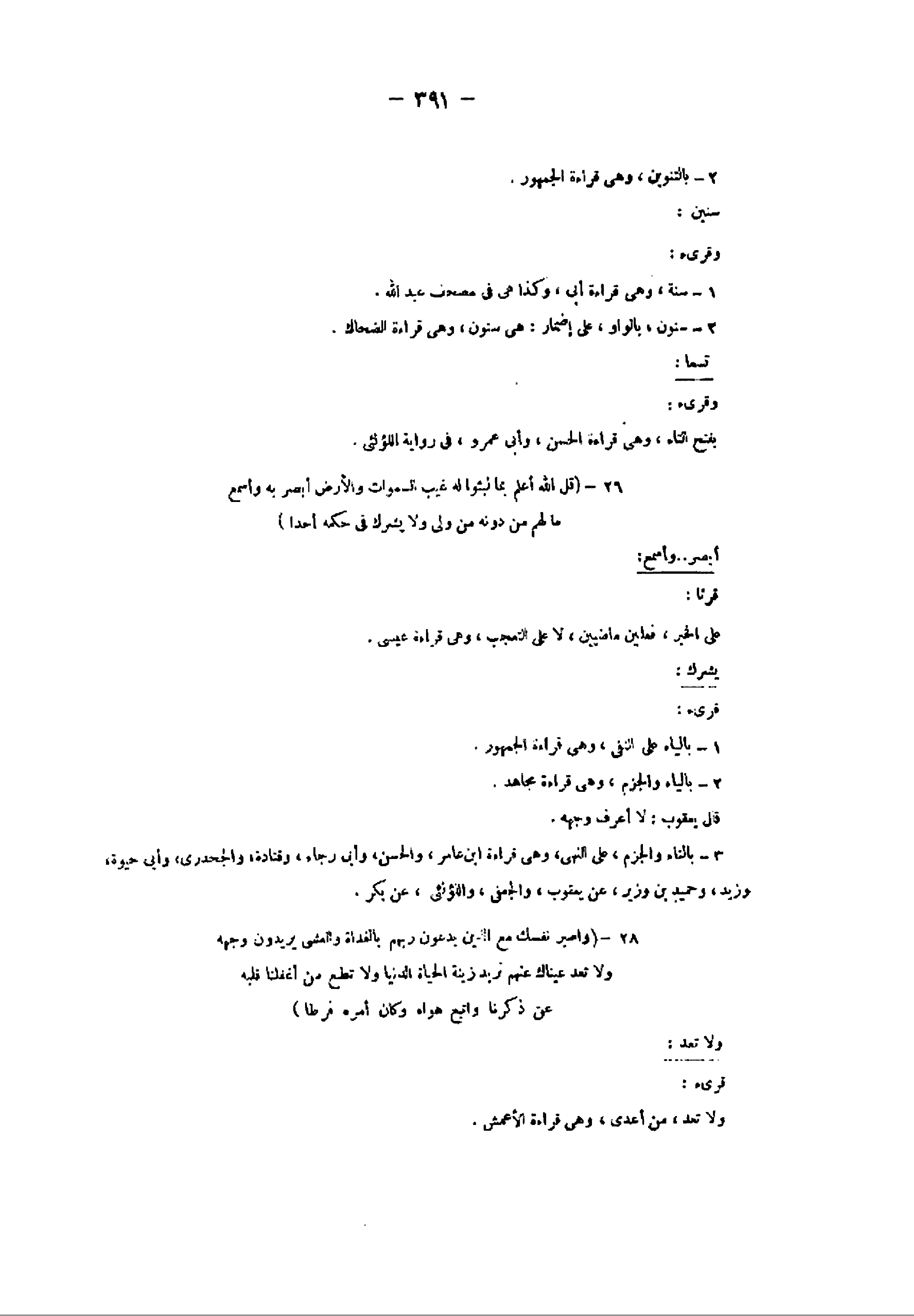 3- بالتاء والجزم، على النهى، وهى قراءة ابن عامر، والحسن، وأبى رجاء، وقتادة، والجحدري، وأبى حيوة، وزيد، وحميد بن وزير، عن يعقوب، والجعفي، واللؤلئي، عن بكر.