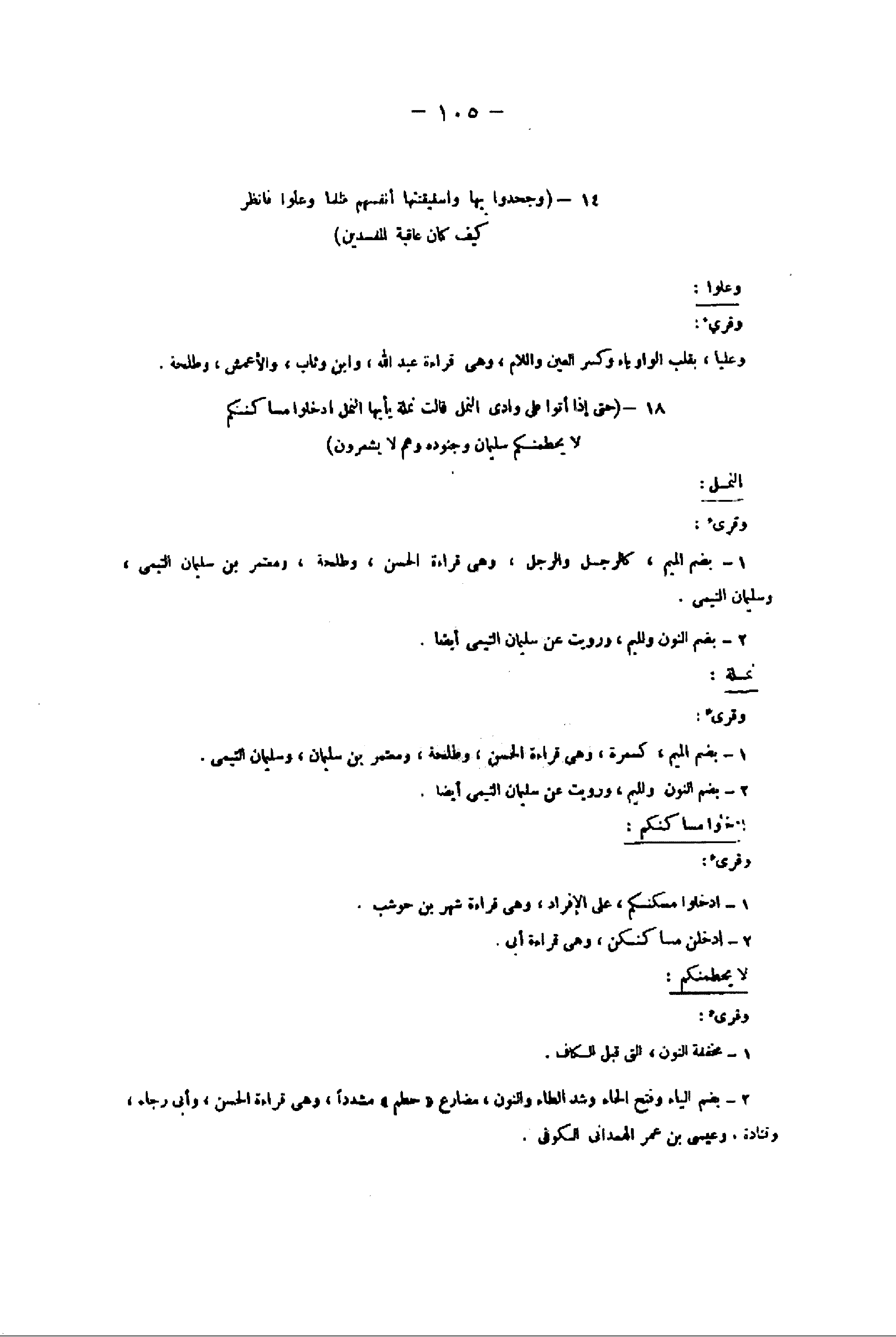 1- ادخلوا مسكنكم، على الإفراد، وهى قراءة شهر بن حوشب.