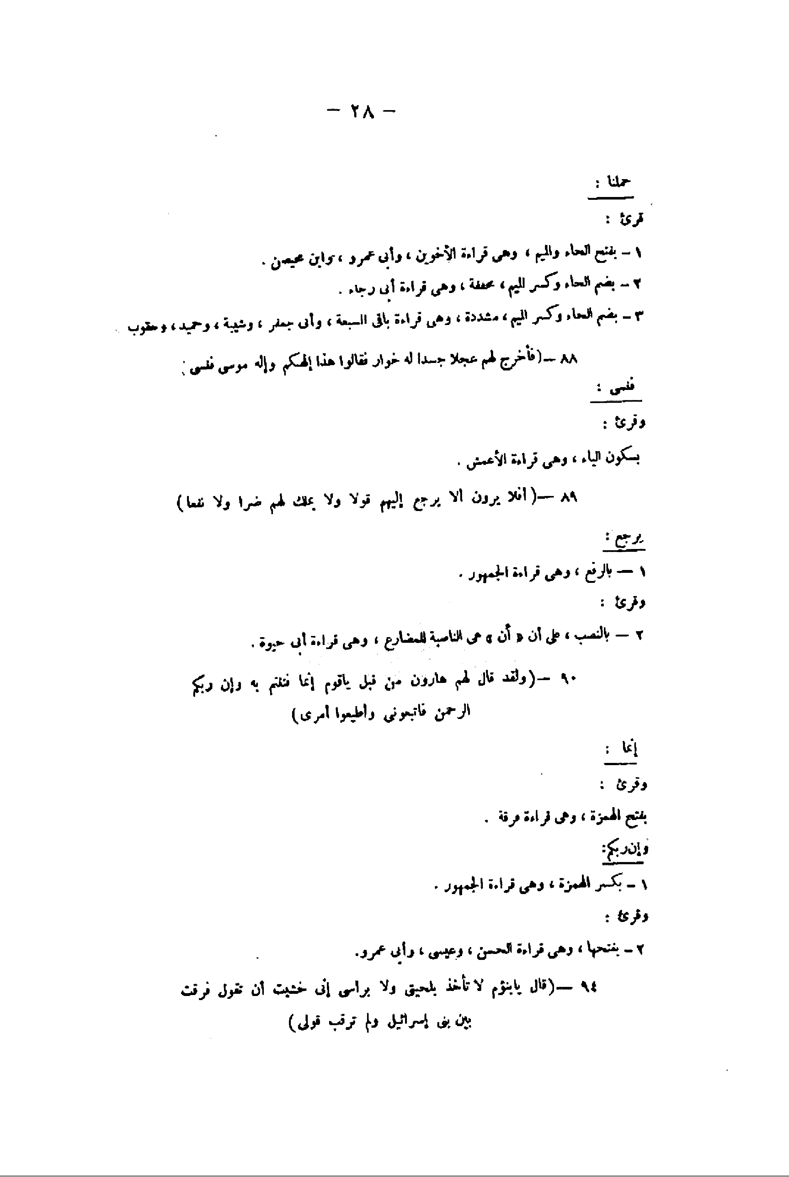 3- بضم الحاء وكسر الميم، مشددة، وهى قراءة باقى السبعة، وأبى جعفر، وشيبة، وحميد، ويعقوب 88- فَأَخْرَجَ لَهُمْ عِجْلًا جَسَداً لَهُ خُوارٌ فَقالُوا هذا إِلهُكُمْ وَإِلهُ مُوسى فَنَسِيَ فنسى: