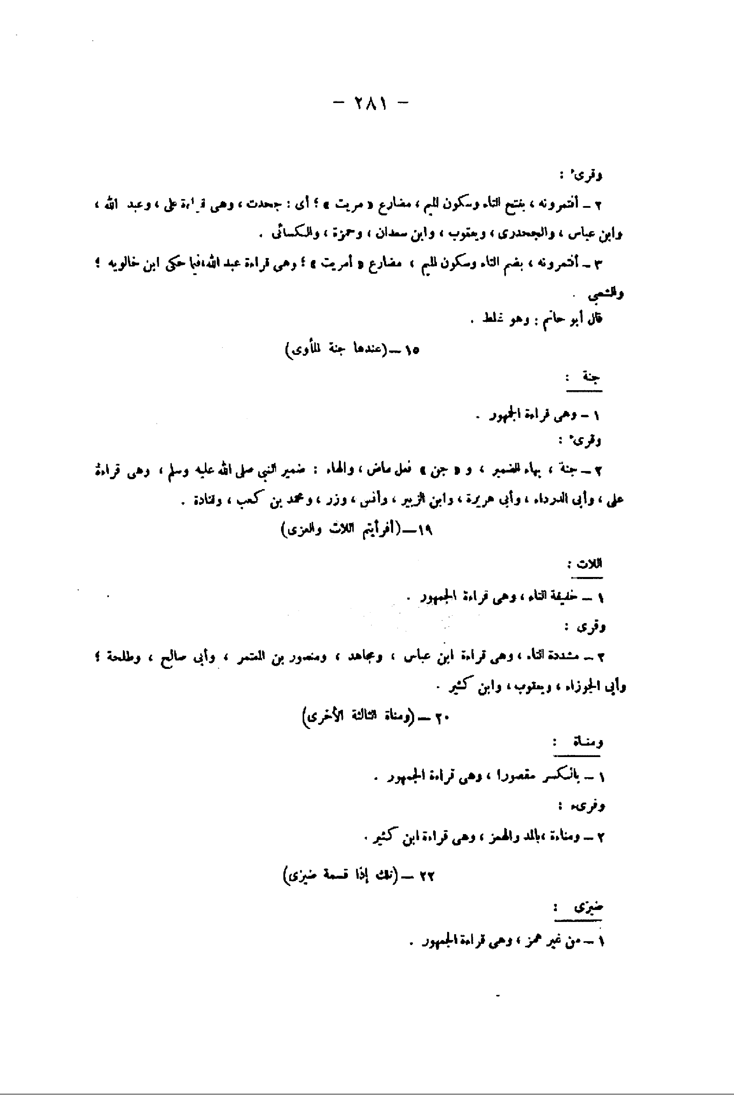 2- جنة، بهاء الضمير، و «جن» فعل ماض، والهاء: ضمير النبي صلى الله عليه وسلم، وهى قراءة على، وأبى الدرداء، وأبى هريرة، وابن الزبير، وأنس، وزر، ومحمد بن كعب، وقتادة.