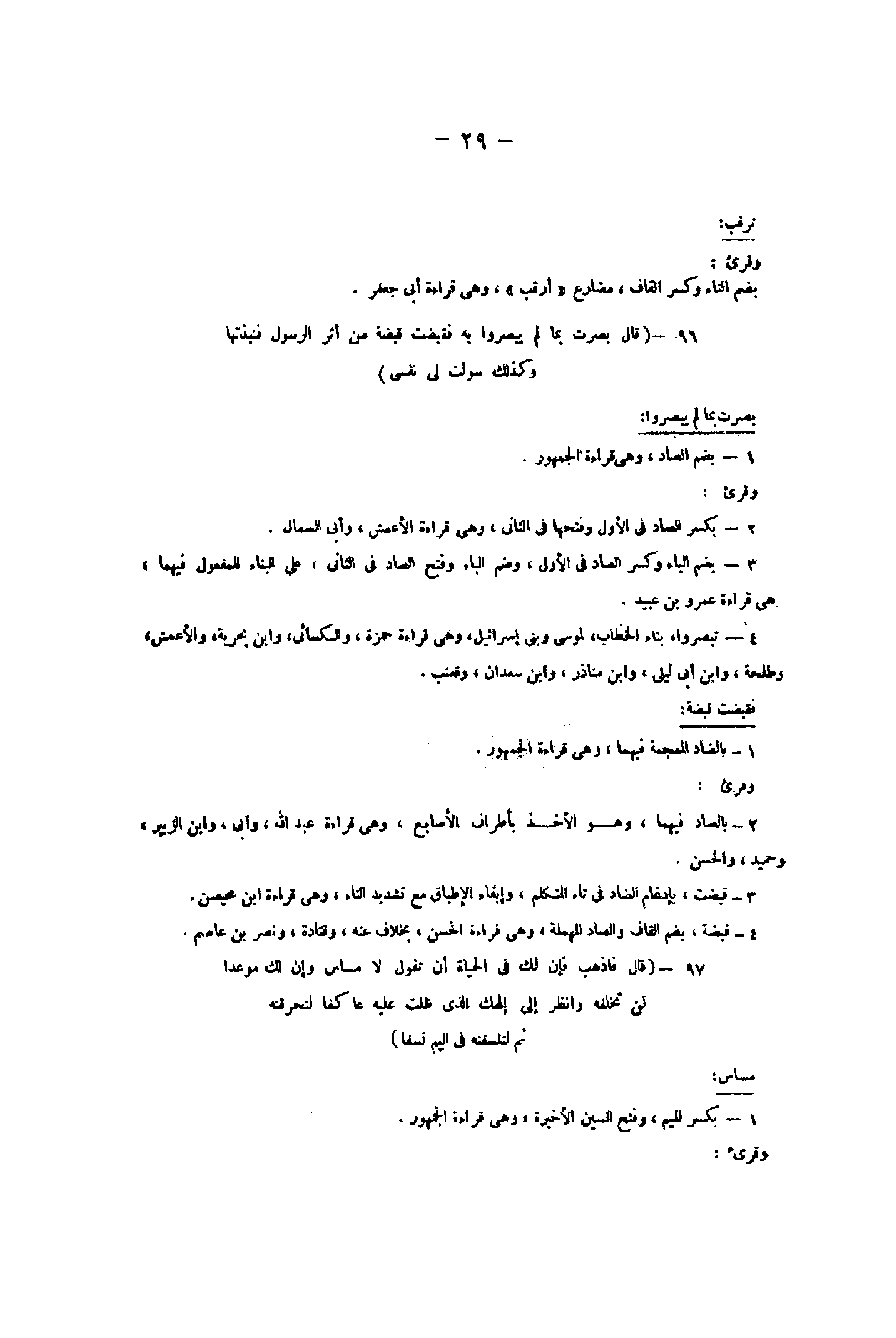 2- بالصاد فيهما، وهو الأخذ بأطراف الأصابع، وهى قراءة عبد الله، وأبى، وابن الزبير، وحميد، والحسن.