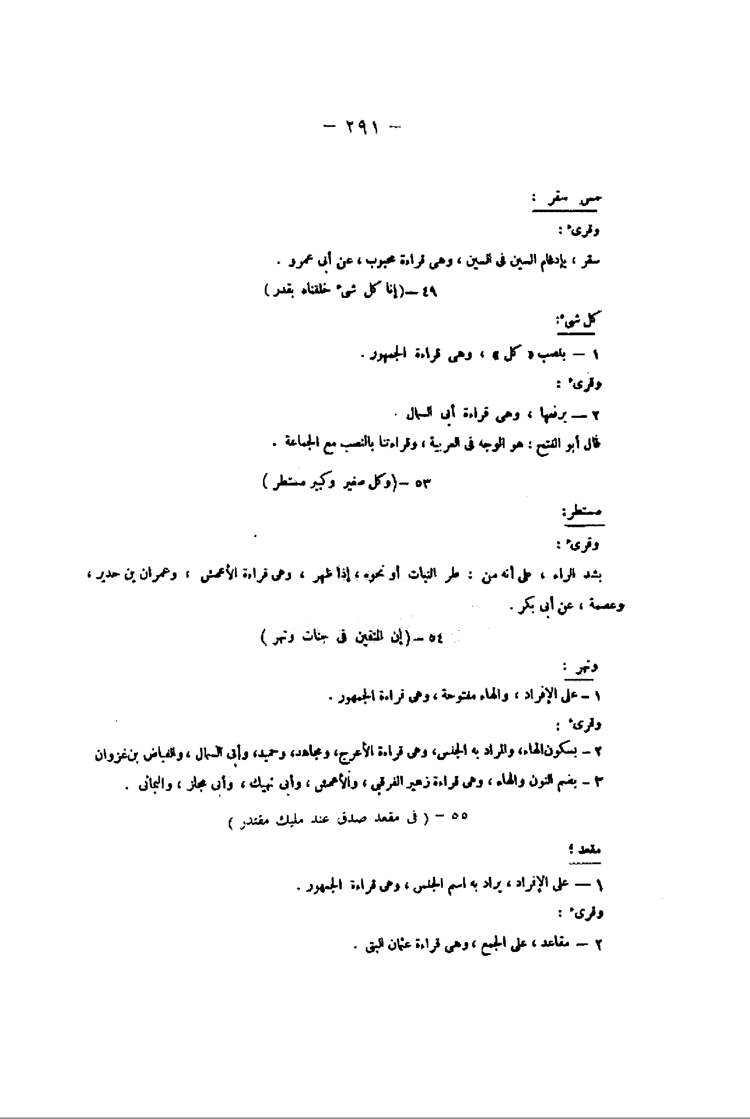 55- فِي مَقْعَدِ صِدْقٍ عِنْدَ مَلِيكٍ مُقْتَدِرٍ مقعد، 1- على الإفراد، يراد به اسم الجنس، وهى قراءة الجمهور.