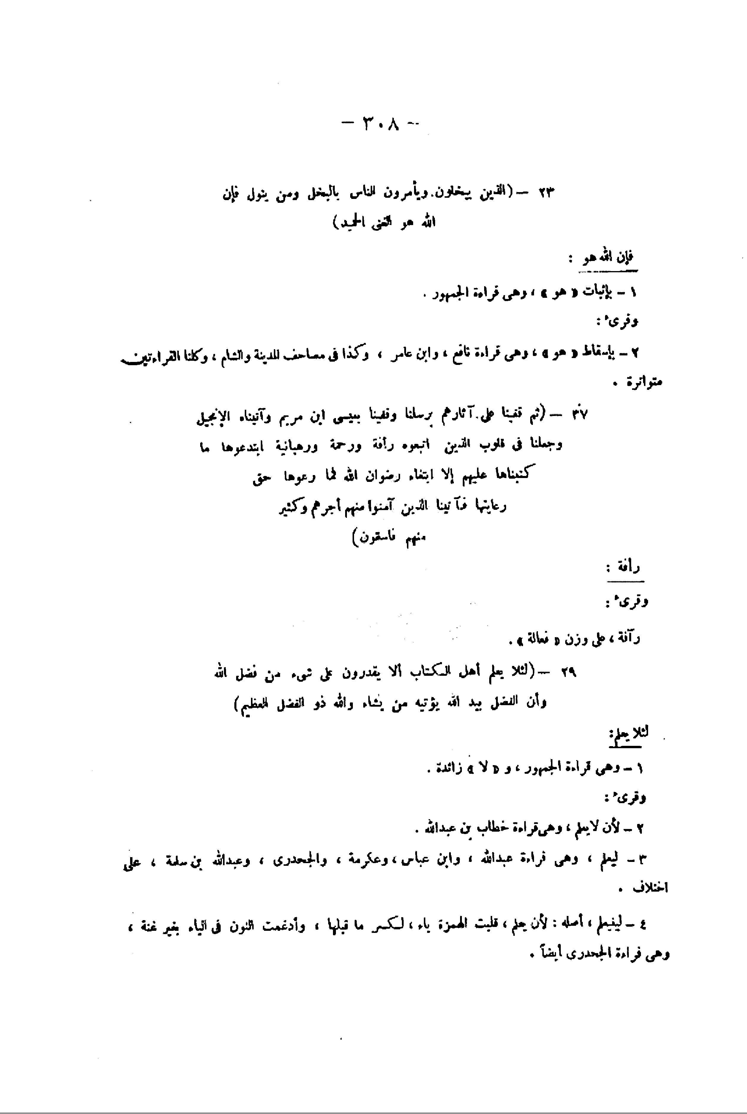 2- بإسقاط «هو» ، وهى قراءة نافع، وابن عامر، وكذا فى مصاحف المدينة والشام، وكلتا القراءتين متواترة.