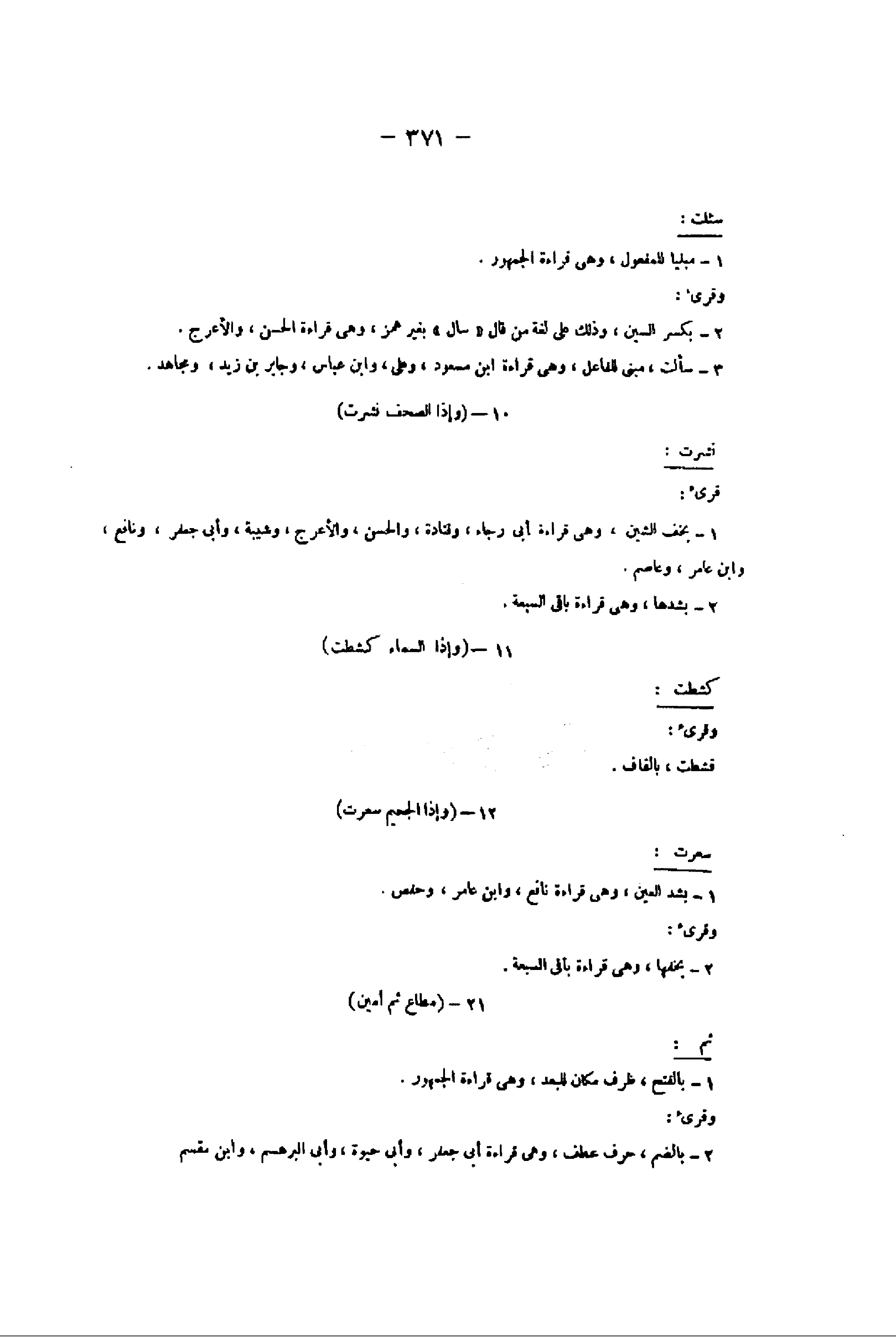 1- بخف الشين، وهى قراءة أبى رجاء، وقتادة، والحسن، والأعرج، وشيبة، وأبى جعفر، ونافع، وابن عامر، وعاصم.