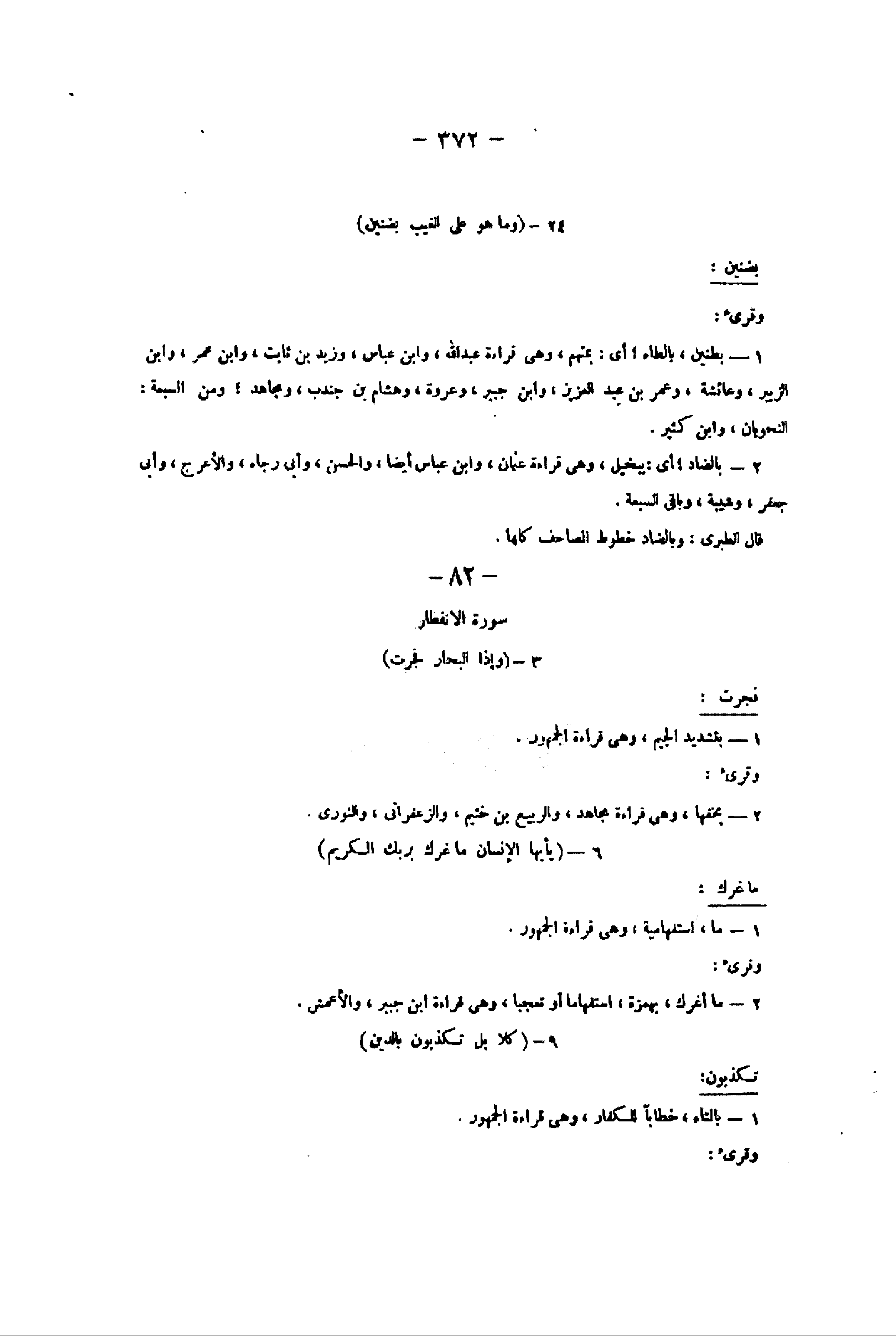 1- بطنين، بالطاء، أي: بمتهم، وهى قراءة عبد الله، وابن عباس، وزيد بن ثابت، وابن عمر، وابن الزبير، وعائشة، وعمر بن عبد العزيز، وابن جبير، وعروة، وهشام بن جندب، ومجاهد، ومن السبعة: