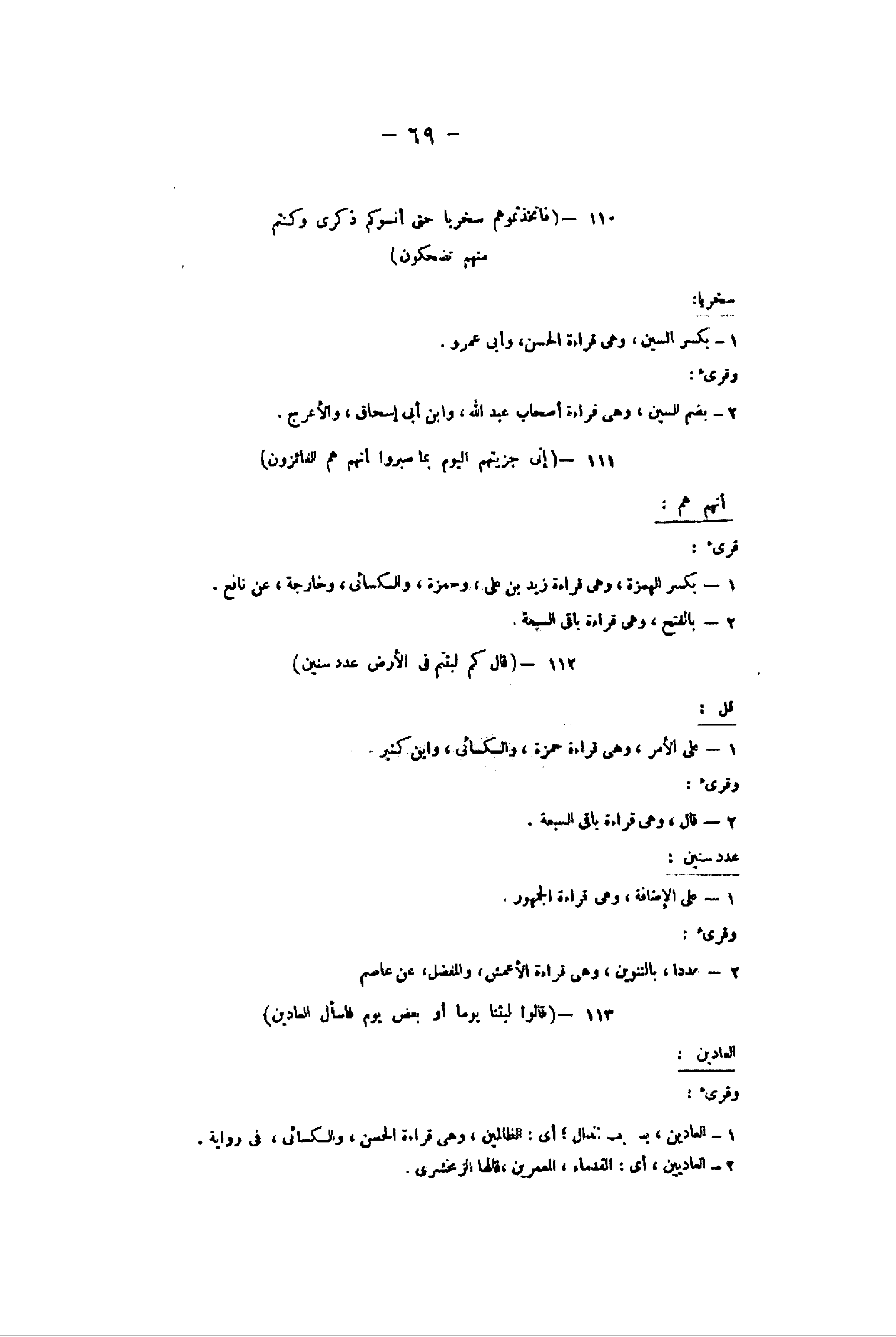 2- عددا، بالتنوين، وهى قراءة الأعمش، والمفضل، عن عاصم 113- قالُوا لَبِثْنا يَوْماً أَوْ بَعْضَ يَوْمٍ فَسْئَلِ الْعادِّينَ العادين: