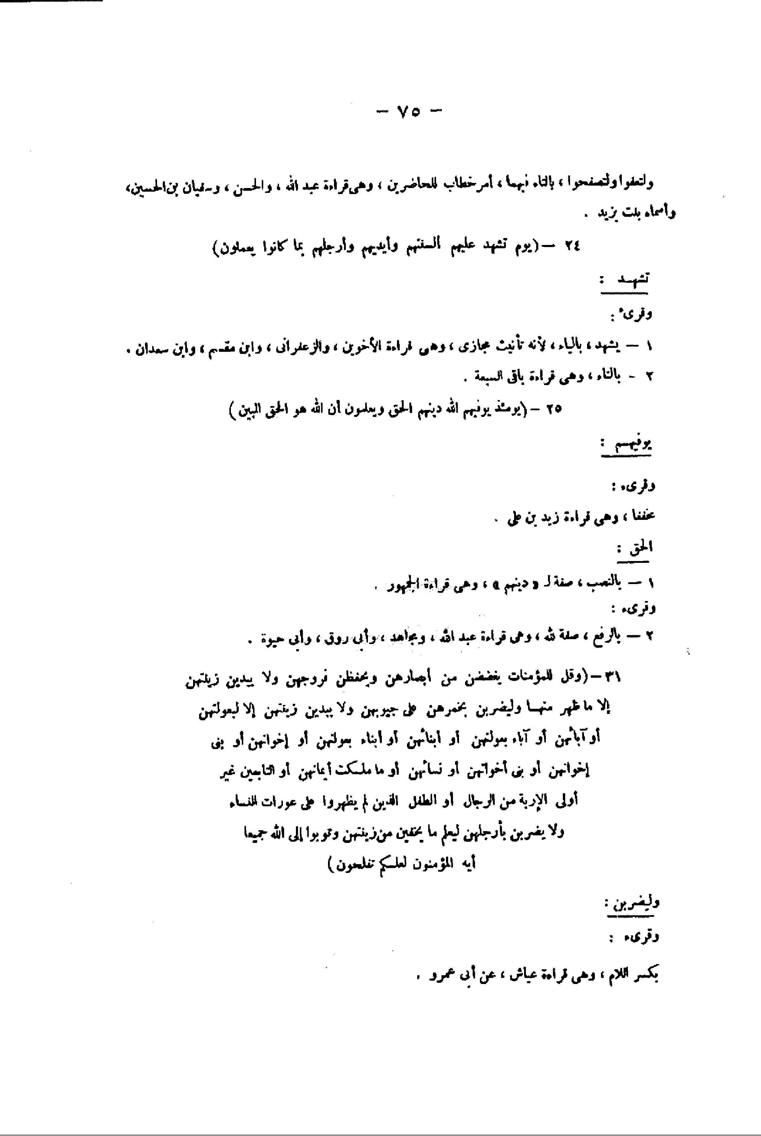 1- يشهد، بالياء، لأنه تأنيث مجازى، وهى قراءة الأخوين، والزعفراني، وابن مقسم، وابن سعدان.