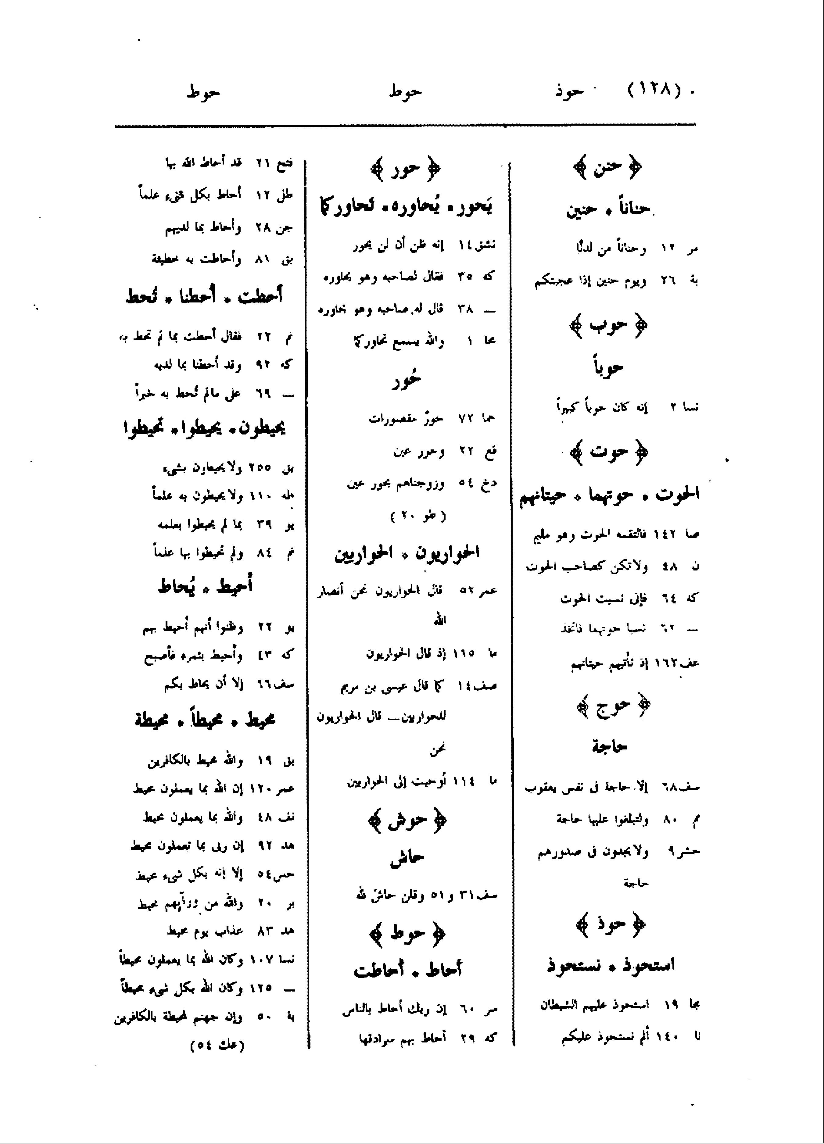 حنن حنانا حنين مر 12 وحنانا من لدنّا بة 26 ويوم حنين إذا عجبتكم حوب حوبا نسا 2 إنه كان حوبا كبيرا حوت الحوت حوتهما حيتانهم صا 142 فالتقمه الحوت وهو مليم ن 48 ولا تكن كصاحب الحوت كه 64 فإنى نسيت الحوت- 62 نسيا حوتهما فاتخذ عف 162 إذ تأتيهم حيتانهم حوج حاجة سف 68 إلا حاجة فى نفس يعقوب مم 80 ولتبلغوا عليها حاجة حشر 9 ولا يجدون فى صدورهم حاجة حوذ استحوذ نستحوذ مجا 19 استحوذ عليهم الشيطان نا 140 ألم نستحوذ عليكم حور يحور يحاوره تحاوركما نشق 14 إنه ظن أن لن يحور كه 35 فقال لصاحبه وهو يحاوره- 38 قال له صاحبه وهو يحاوره مجا 1 والله يسمع تحاوركما حور حما 72 حور مقصورات قع 22 وحور عين دخ 54 وزوجناهم بحور عين (طو 20) الحواريون الحواريين عمر 52 قال الحواريون نحن أنصار الله ما 115 إذ قال الحواريون صف 14 كما قال عيسى بن مريم للحواريين- قال الحواريون نحن ما 114 أوحيت إلى الحواريين حوش حاش سف 31 و 51 وقلن حاش لله حوط أحاط أحاطت سر 60 إن ربك أحاط بالناس كه 29 أحاط بهم سرادقها فتح 21 قد أحاط الله بها طل 12 أحاط بكل شيء علما جن 28 وأحاط بما لديهم بق 81 وأحاطت به خطيئة أحطت أحطنا تحط نم 22 فقال أحطت بما لم تحط به كه 92 وقد أحطنا بما لديه- 69 على ما لم تحط به خبرا يحيطون يحيطوا تحيطوا بق 255 ولا يحيطون بشيء طه 110 ولا يحيطون به علما يو 39 بما لم يحيطوا بعلمه نم 84 ولم تحيطوا بها علما أحيط يحاط يو 22 وظنوا أنهم أحيط بهم كه 43 وأحيط بثمره فأصبح سف 66 إلا أن يحاط بكم محيط محيطا محيطة بق 19 والله محيط بالكافرين عمر 120 إن الله بما يعملون محيط نف 48 والله بما يعملون محيط هد 92 إن ربى بما تعملون محيط حس 54 إلا إنه بكل شيء محيط بر 20 والله من ورآئهم محيط هد 83 عذاب يوم محيط نسا 107 وكان الله بما يعملون محيطا- 125 وكان الله بكل شيء محيطا بة 50 وإن جهنم لمحيطة بالكافرين (عك 54)