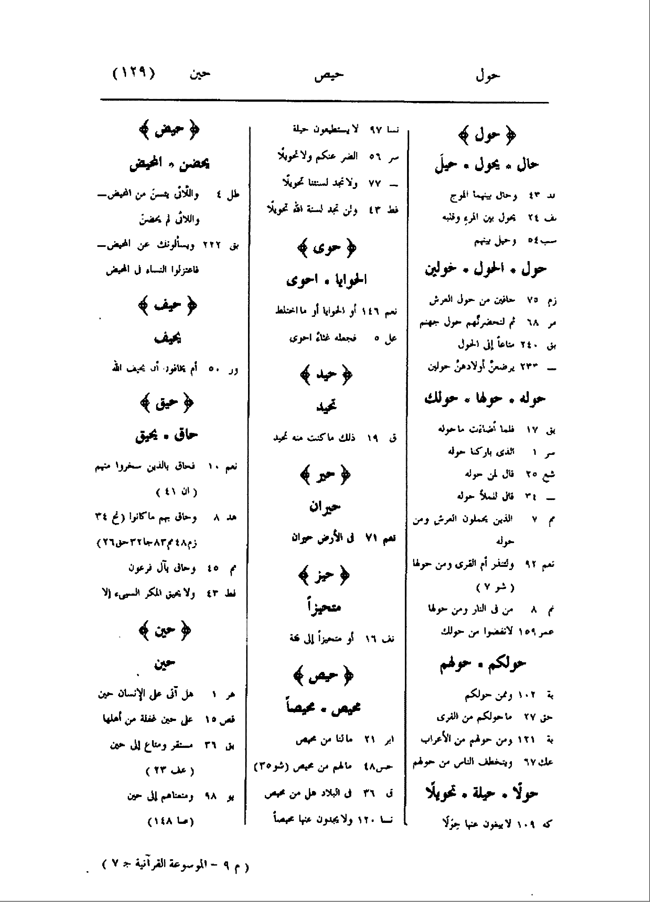 حوله نعم 92 ولتنذر أم القرى ومن حولها (شو 7) نم 8 من في النار ومن حولها عمر 159 لانفضوا من حولك حولكم حولهم بة 102 وممن حولكم حق 27 ما حولكم من القرى بة 121 ومن حولهم من الأعراب عك 67 ويتخطف الناس من حولهم حولا حيلة تحويلا كه 109 لا يبغون عنها حولا نسا 97 لا يستطيعون حيلة سر 56 الضر عنكم ولا تحويلا- 77 ولا تجد لسنتنا تحويلا فط 43 ولن تجد لسنة الله تحويلا حوى الحوايا احوى نعم 146 أو الحوايا أو ما اختلط عل 5 فجعله غثاء احوى حيد تحيد ق 19 ذلك ما كنت منه تحيد حير حيران نعم 71 في الأرض حيران حيز متحيزا نف 16 أو متحيزا إلى فئة حيص محيص محيصا ابر 21 ما لنا من محيص حس 48 ما لهم من محيص (شو 35) ق 36 في البلاد هل من محيص نسا 120 ولا يجدون عنها محيصا حيض يحضن المحيض طل 4 واللائى يئسن من المحيض- واللائى لم يحضن بق 222 ويسألونك عن المحيض- فاعتزلوا النساء في المحيض حيف يحيف ور 50 أم يخافون أن يحيف الله حيق حاق يحيق نعم 10 فحاق بالذين سخروا منهم (ان 41) هد 8 وحاق بهم ما كانوا (نح 34 زم 48 مم 83 جا 32 حق 26) مم 45 وحاق بآل فرعون فط 43 ولا يحيق المكر السيىء إلا حين حين هر 1 هل آتى على الإنسان حين قص 15 على حين غفلة من أهلها بق 36 مستقر ومتاع إلى حين (عف 23) يو 98 ومتعناهم إلى حين (صا 148)