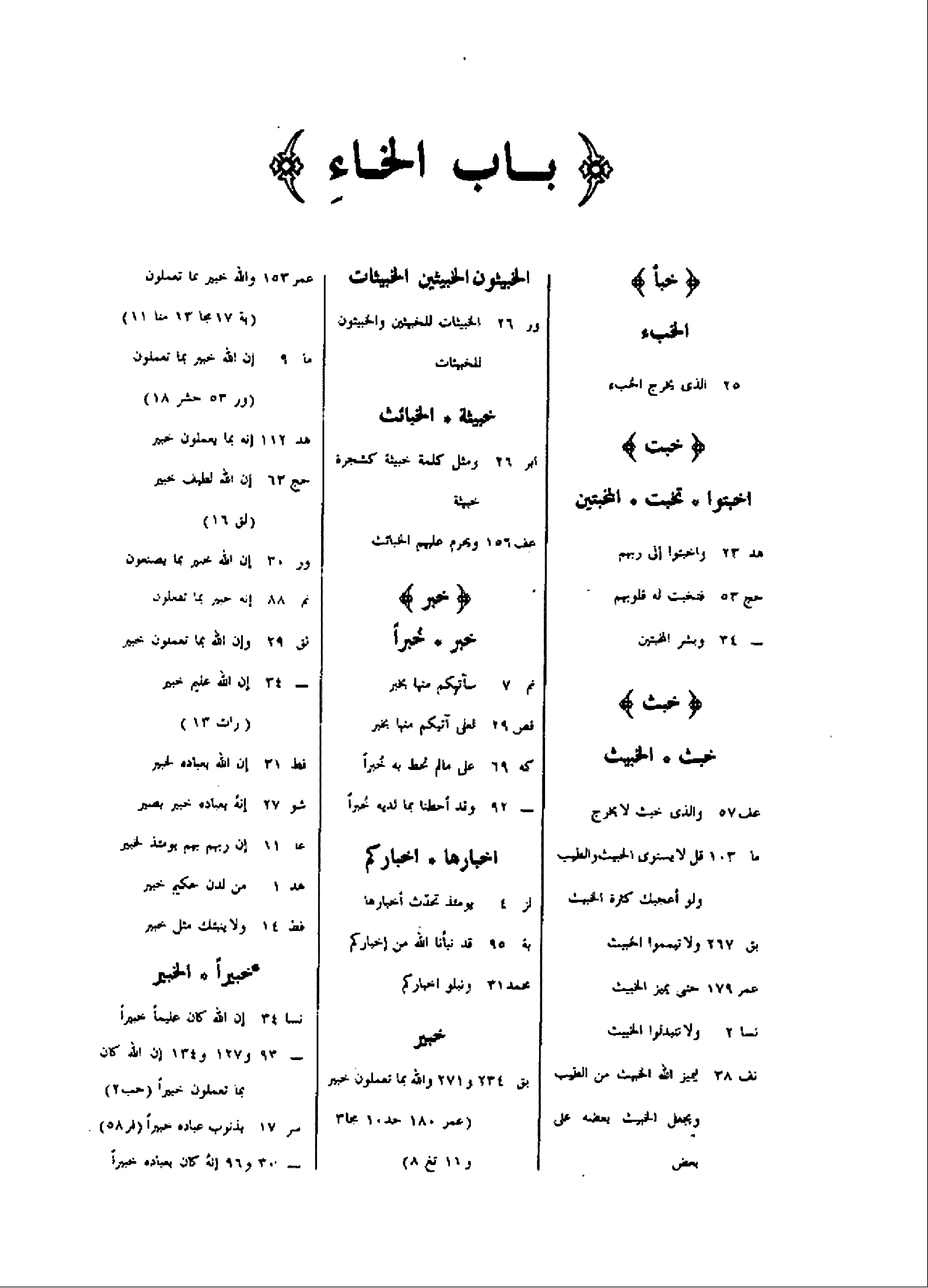 خبأ الخبء 25 الذى يخرج الخبء خبت اخبتوا تخبت المخبتين هد 23 واخبتوا إلى ربهم حج 53 فتخبت له قلوبهم- 34 وبشر المخبتين خبث خبث الخبيث عف 57 والذى خبث لا يخرج ما 103 قل لا يستوى الخبيث والطيب ولو أعجبك كثرة الخبيث بق 267 ولا تيمموا الخبيث عمر 179 حتى يميز الخبيث نسا 2 ولا تتبدلوا الخبيث نف 38 ليميز الله الخبيث من الطيب ويجعل الخبيث بعضه على بعض الخبيثون الخبيثين الخبيثات ور 26 الخبيثات للخبيثين والخبيثون للخبيثات خبيثة الخبائث ابر 26 ومثل كلمة خبيثة كشجرة خبيثة عف 156 ويحرم عليهم الخبائث خبر خبر خبرا نم 7 سآتيكم منها بخبر قص 29 لعلى آتيكم منها بخبر كه 69 على ما لم تحط به خبرا- 92 وقد أحطنا بما لديه خبرا اخبارها اخباركم لز 4 يومئذ تحدّث أخبارها بة 95 قد نبأنا الله من إخباركم محمد 31 ونبلو اخباركم خبير بق 234 و 271 والله بما تعملون خبير (عمر 180 حد 10 مجا 3 و 11 تغ 8) عمر 153 والله خبير بما تعملون (بة 17 مجا 13 منا 11) ما 9 إن الله خبير بما تعملون (ور 53 حشر 18) هد 112 إنه بما يعملون خبير حج 63 إن الله لطيف خبير (لق 16) ور 30 إن الله خبير بما يصنعون نم 88 إنه خبير بما تفعلون لق 29 وإن الله بما تعملون خبير- 34 إن الله عليم خبير (رات 13) فط 31 إن الله بعباده لخبير شو 27 إنه بعباده خبير بصير عا 11 إن ربهم بهم يومئذ لخبير هد 1 من لدن حكيم خبير فط 14 ولا ينبئك مثل خبير خبيرا الخبير نسا 34 إن الله كان عليما خبيرا- 93 و 127 و 134 إن الله كان بما تعملون خبيرا (حب 2) سر 17 بذنوب عباده خبيرا (فر 58) - 30 و 96 إنه كان بعباده خبيرا