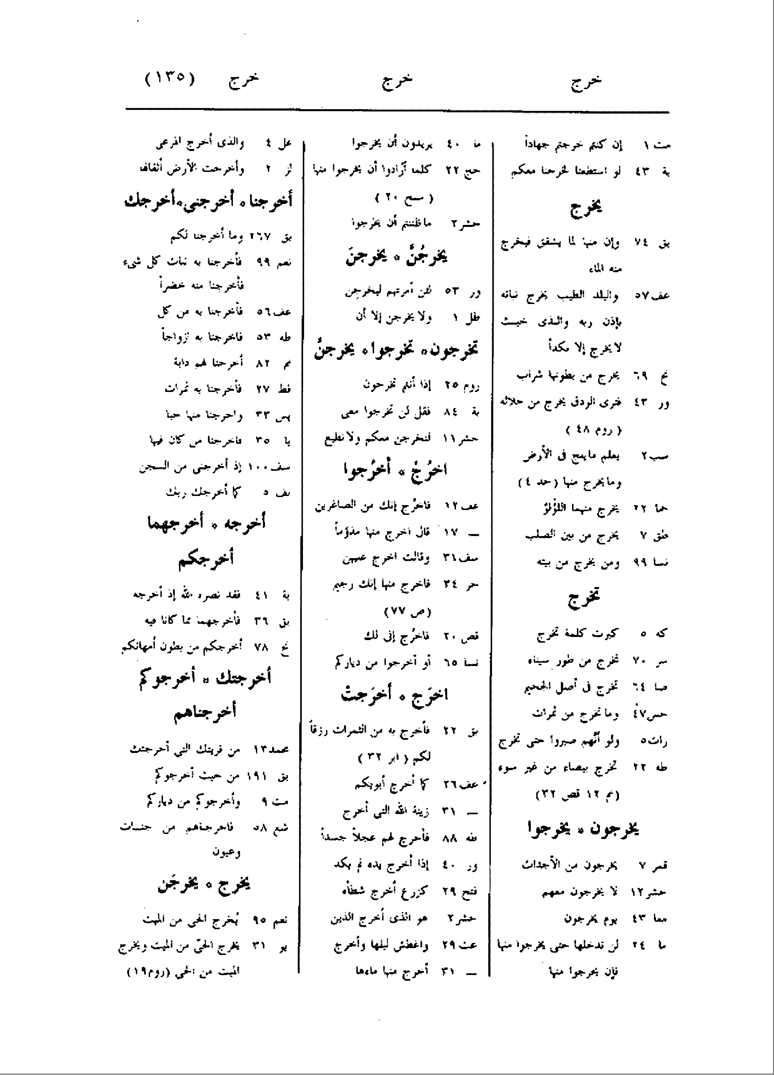 مت 1 إن كنتم خرجتم جهادا بة 43 لو استطعنا لخرجنا معكم يخرج بق 74 وإن منها لما يشقق فيخرج منه الماء عف 57 والبلد الطيب يخرج نباته بإذن ربه والذى خبث لا يخرج إلا نكدا نح 69 يخرج من بطونها شراب ور 43 فترى الودق يخرج من خلاله (روم 48) سب 2 يعلم ما يلج في الأرض وما يخرج منها (حد 4) حما 22 يخرج منهما اللؤلؤ طق 7 يخرج من بين الصلب نسا 99 ومن يخرج من بيته تخرج كه 5 كبرت كلمة تخرج سر 70 تخرج من طور سيناء صا 64 تخرج في أصل الجحيم حس 47 وما تخرج من ثمرات رات 5 ولو أنّهم صبروا حتى تخرج طه 22 تخرج بيضاء من غير سوء (نم 12 قص 32) يخرجون يخرجوا قمر 7 يخرجون من الأجداث حشر 12 لا يخرجون معهم معا 43 يوم يخرجون ما 24 لن ندخلها حتى يخرجوا منها فإن يخرجوا منها ما 40 يريدون أن يخرجوا حج 22 كلما أرادوا أن يخرجوا منها (سبح 20) حشر 2 ما ظننتم أن يخرجوا يخرجنّ يخرجن ور 53 لئن أمرتهم ليخرجن طل 1 ولا يخرجن إلا أن تخرجون تخرجوا يخرجنّ روم 25 إذا أنتم تخرجون بة 84 فقل لن تخرجوا معى حشر 11 لنخرجن معكم ولا نطيع اخرج