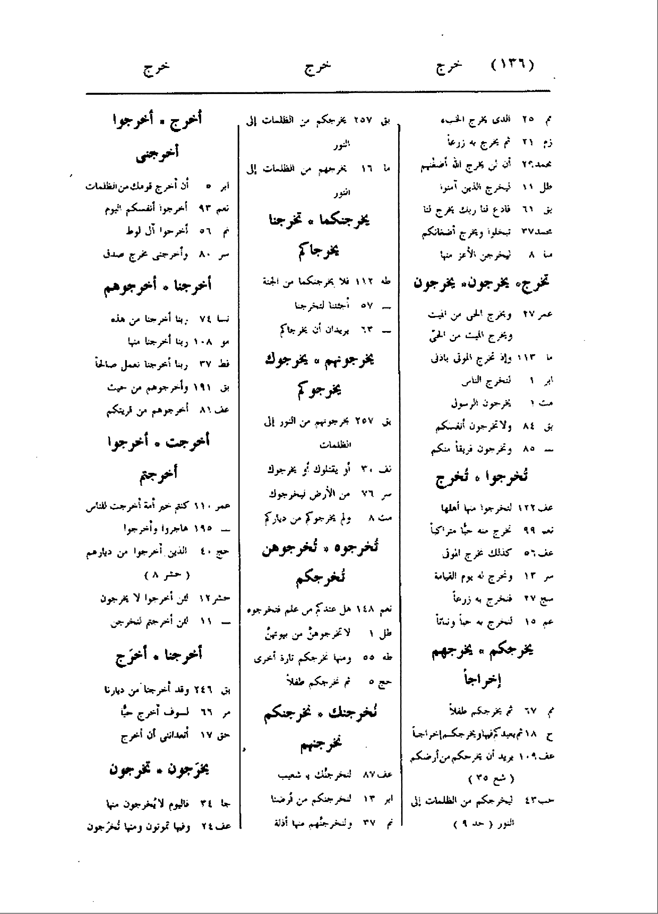 مم 25 الذى يخرج الخبء زم 21 ثم يخرج به زرعا محمد 29 أن لن يخرج الله أضغنهم طل 11 ليخرج الذين آمنوا بق 61 فادع لنا ربك يخرج لنا محمد 37 تبخلوا ويخرج أضغانكم منا 8 ليخرجن الأعز منها تخرج يخرجون يخرجون عمر 27 ويخرج الحى من الميت ويخرج الميت من الحىّ ما 113 وإذ تخرج الموتى باذنى ابر 1 لتخرج الناس مت 1 يخرجون الرسول بق 84 ولا تخرجون أنفسكم- 85 وتخرجون فريقا منكم تخرجوا تخرج عف 122 لتخرجوا منها أهلها نعم 99 نخرج منه حبّا متراكبا عف 56 كذلك نخرج الموتى سر 13 ونخرج له يوم القيامة سج 27 فنخرج به زرعا عم 15 لنخرج به حبا ونباتا يخرجكم يخرجهم إخراجا مم 67 ثم يخرجكم طفلا ح 18 ثم يعيدكم فيها ويخرجكم إخراجا عف 109 يريد أن يخرجكم من أرضكم (شع 35) حب 43 ليخرجكم من الظلمات إلى النور (حد 9) بق 257 يخرجكم من الظلمات إلى النور ما 16 يخرجهم من الظلمات إلى النور يخرجنكما تخرجنا يخرجاكم طه 112 فلا يخرجنكما من الجنة- 57 أجئتنا لتخرجنا- 63 يريدان أن يخرجاكم يخرجونهم يخرجوك يخرجوكم بق 257 يخرجونهم من النور إلى الظلمات نف 30 أو يقتلوك أو يخرجوك سر 76 من الأرض ليخرجوك مت 8 ولم يخرجكم من دياركم تخرجوه تخرجوهن تخرجكم نعم 148 هل عندكم من علم فتخرجوه طل 1 لا تخرجوهنّ من بيوتهنّ طه 55 ومنها نخرجكم تارة أخرى حج 5 ثم نخرجكم طفلا نخرجنك نخرجنك نخرجنهم عف 87 لنخرجنّك يا شعيب ابر 13 لنخرجنكم من أرضنا نم 37 ولنخرجنّهم منها أذلة أخرج أخرجوا أخرجنى ابر 5 أن أخرج قومك من الظلمات نعم 93 أخرجوا أنفسكم اليوم نم 56 أخرجوا آل لوط سر 80 وأخرجنى مخرج صدق أخرجنا أخرجوهم نسا 74 ربنا أخرجنا من هذه مو 108 ربنا أخرجنا منها فط 37 ربنا أخرجنا نعمل صالحا بق 191 وأخرجوهم من حيث عف 81 أخرجوهم من قريتكم أخرجت أخرجوا أخرجتم عمر 110 كنتم خير أمة أخرجت للناس- 195 هاجروا وأخرجوا حج 40 الذين أخرجوا من ديارهم (حشر 8) حشر 12 لئن أخرجوا لا يخرجون- 11 لئن أخرجتم لنخرجن أخرجنا أخرج بق 246 وقد أخرجنا من ديارنا مر 66 لسوف أخرج حيّا حق 17 أتعداننى أن أخرج يخرجون تخرجون جا 34 فاليوم لا يخرجون منها عف 24 وفيها تموتون ومنها تخرجون
