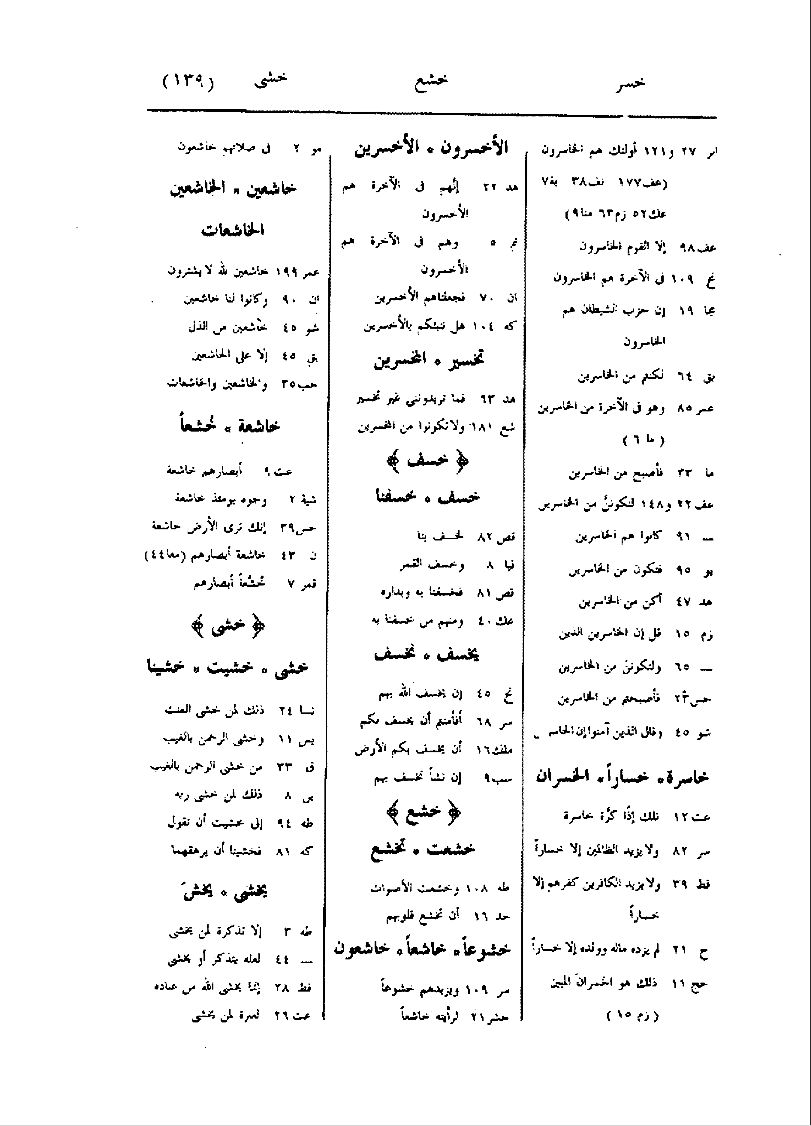 ابر 27 و 121 أولئك هم الخاسرون (عف 177 نف 38 بة 7 عك 52 زم 63 منا 9) عف 98 إلا القوم الخاسرون نح 109 فى الآخرة هم الخاسرون مجا 19 إن حزب الشيطان هم الخاسرون بق 64 لكنتم من الخاسرين عمر 85 وهو فى الآخرة من الخاسرين (ما 6) ما 33 فأصبح من الخاسرين عف 22 و 148 لنكوننّ من الخاسرين- 91 كانوا هم الخاسرين يو 95 فتكون من الخاسرين هد 47 أكن من الخاسرين زم 15 قل إن الخاسرين الذين- 65 ولتكوننّ من الخاسرين حس 23 فأصبحتم من الخاسرين شو 45 وقال الذين آمنوا إن الخاسرين خاسرة خسارا الخسران عت 12 تلك إذا كرّة خاسرة سر 82 ولا يزيد الظالمين إلا خسارا فط 39 ولا يزيد الكافرين كفرهم إلا خسارا ح 21 لم يزده ماله وولده إلا خسارا حج 11 ذلك هو الخسران المبين (زم 15) الأخسرون الأخسرين هد 22 إنّهم في الآخرة هم الأخسرون نم 5 وهم في الآخرة هم الأخسرون ان 70 فجعلناهم الأخسرين كه 104 هل ننبئكم بالأخسرين تخسير المخسرين هد 63 فما تريدوننى غير تخسير شع 181 ولا تكونوا من المخسرين خسف خسف خسفنا قص 82 لخسف بنا قيا 8 وخسف القمر قص 81 فخسفنا به وبداره عك 40 ومنهم من خسفنا به يخسف نخسف نح 45 إن يخسف الله بهم سر 68 أفأمنتم أن يخسف بكم ملك 16 أن يخسف بكم الأرض سب 9 إن نشأ نخسف بهم خشع خشعت تخشع طه 108 وخشعت الأصوات حد 16 أن تخشع قلوبهم خشوعا خاشعا خاشعون سر 109 ويزيدهم خشوعا حشر 21 لرأيته خاشعا مو 2 في صلاتهم خاشعون خاشعين الخاشعين الخاشعات عمر 199 خاشعين لله لا يشترون ان 90 وكانوا لنا خاشعين شو 45 خاشعين من الذل بق 45 إلا على الخاشعين حب 35 والخاشعين والخاشعات خاشعة خشعا عت 9 أبصارهم خاشعة شية 2 وجوه يومئذ خاشعة حس 39 إنك ترى الأرض خاشعة