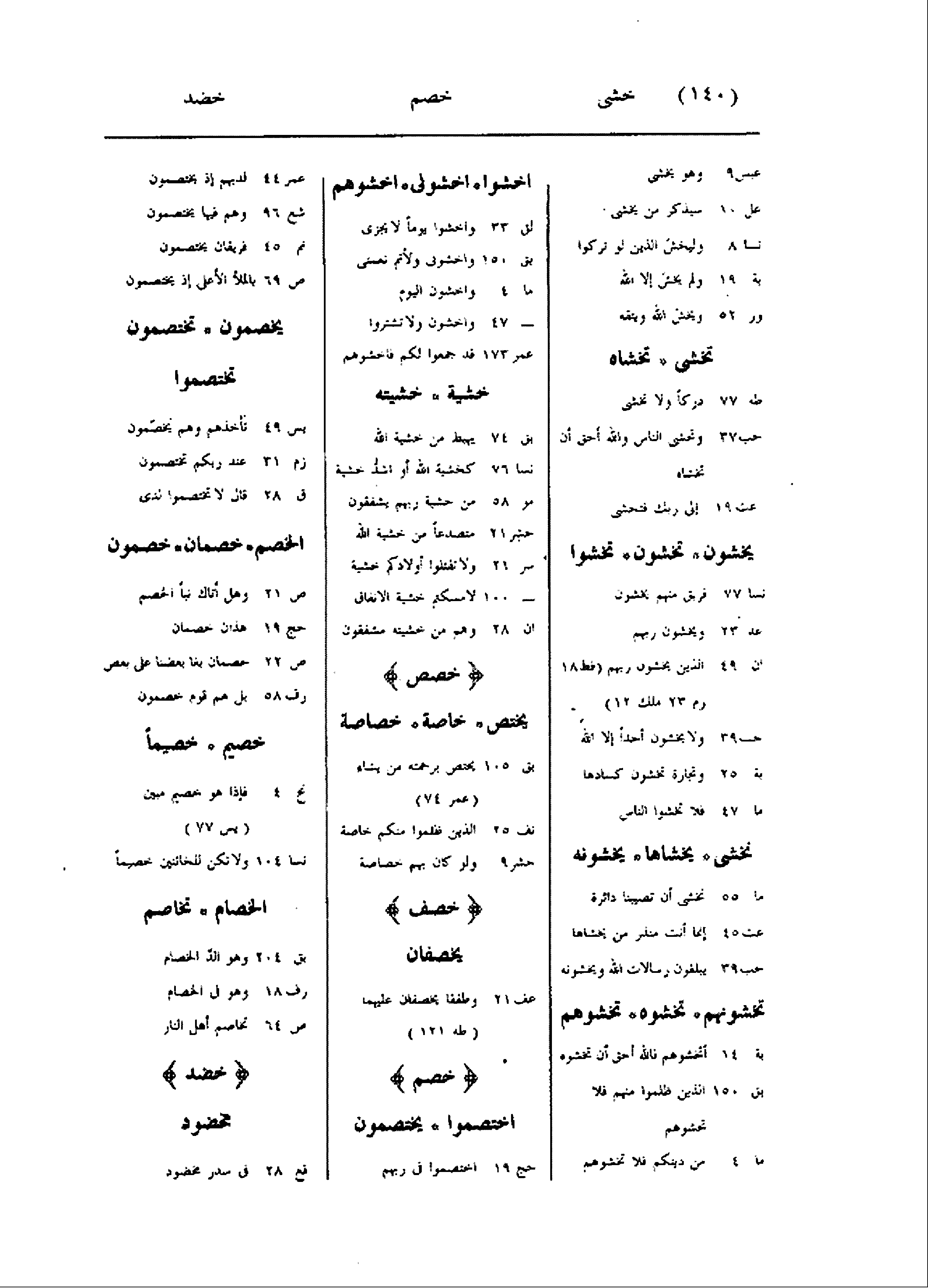 نسا 8 وليخش الذين لو تركوا بة 19 ولم يخش إلا الله ور 52 ويخش الله ويتقه تخشى تخشاه طه 77 دركا ولا تخشى حب 37 وتخشى الناس والله أحق أن تخشاه عت 19 إلى ربك فتخشى يخشون تخشون تخشوا نسا 77 فريق منهم يخشون عد 23 ويخشون ربهم ان 49 الذين يخشون ربهم (فط 18) زم 23 ملك 12) حب 39 ولا يخشون أحدا إلا الله بة 25 وتجارة تخشون كسادها ما 47 فلا تخشوا الناس نخشى يخشاها يخشونه ما 55 نخشى أن تصيبنا دائرة عت 45 إنما أنت منذر من يخشاها حب 39 يبلغون رسالات الله ويخشونه تخشونهم تخشوه تخشوهم بة 14 أتخشوهم فالله أحق أن تخشوه بق 150 الذين ظلموا منهم فلا تخشوهم ما 4 من دينكم فلا تخشوهم اخشوا اخشونى اخشوهم لق 33 واخشوا يوما لا يجزى بق 150 واخشونى ولأتم نعمتى ما 4 واخشون اليوم- 47 واخشون ولا تشتروا عمر 173 قد جمعوا لكم فاخشوهم خشية خشيته بق 74 يهبط من خشية الله نسا 76 كخشية الله أو أشدّ خشية مو 58 من خشية ربهم يشفقون حشر 21 متصدعا من خشية الله سر 21 ولا تقتلوا أولادكم خشية- 100 لامسكتم خشية الانفاق ان 28 وهم من خشيته مشفقون خصص يختص خاصة خصاصة بق 105 يختص برحمته من يشاء (عمر 74) نف 25 الذين ظلموا منكم خاصة حشر 9 ولو كان بهم خصاصة خصف يخصفان عف 21 وطفقا يخصفان عليهما (طه 121) خصم اختصموا يختصمون حج 19 اختصموا في ربهم عمر 44 لديهم إذ يختصمون شع 96 وهم فيها يختصمون نم 45 فريقان يختصمون ص 69 بالملأ الأعلى إذ يختصمون يخصمون تختصمون تختصموا يس 49 تأخذهم وهم يخصّمون زم 31 عند ربكم تختصمون ق 28 قال لا تختصموا لدى الخصم خصمان خصمون ص 21 وهل أتاك نبأ الخصم حج 19 هذان خصمان ص 22 خصمان بغا بعضنا على بعض رف 58 بل هم قوم خصمون خصيم خصيما نح 4 فإذا هو خصيم مبين (يس 77) نسا 104 ولا تكن للخائنين خصيما الخصام تخاصم بق 204 وهو الدّ الخصام رف 18 وهو في الخصام ص 64 تخاصم أهل النار خضد مخضود قع 28 في سدر مخضود