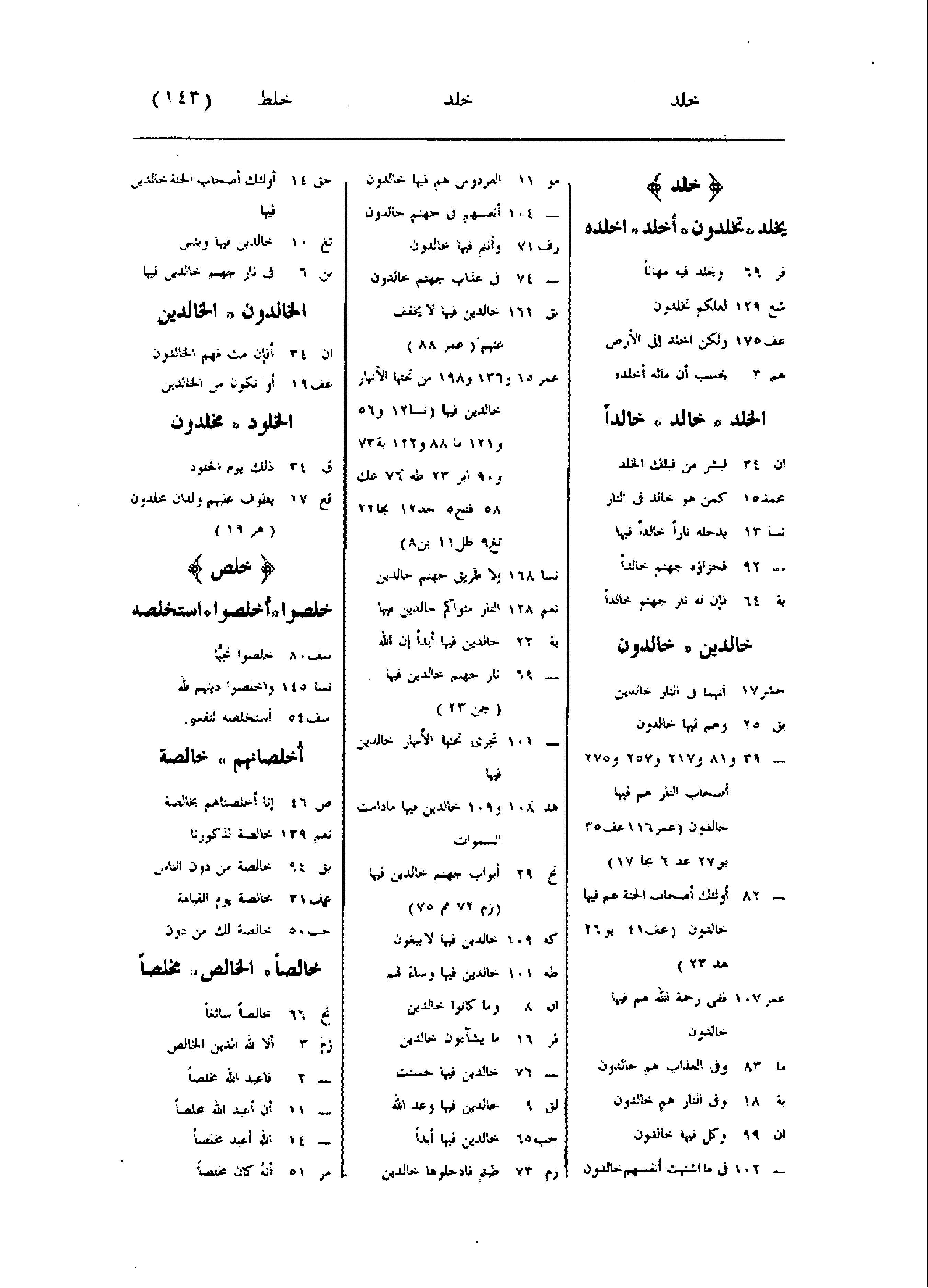 خلد يخلد تخلدون أخلد اخلده فر 69 ويخلد فيه مهانا شع 129 لعلكم تخلدون عف 175 ولكن اخلد إلى الأرض هم 3 يحسب أن ماله أخلده الخلد خالد خالدا ان 34 لبشر من قبلك الخلد محمد 15 كمن هو خالد في النار نسا 13 يدخله نارا خالدا فيها- 92 فجزاؤه جهنم خالدا بة 64 فإن له نار جهنم خالدا خالدين خالدون حشر 17 أنهما في النار خالدين بق 25 وهم فيها خالدون- 39 و 81 و 217 و 257 و 275 أصحاب النار هم فيها خالدون (عمر 116 عف 35 يو 27 عد 6 مجا 17) - 82 أولئك أصحاب الجنة هم فيها خالدون (عف 41 يو 26 هد 23) عمر 107 ففى رحمة الله هم فيها خالدون ما 83 وفي العذاب هم خالدون بة 18 وفي النار هم خالدون ان 99 وكل فيها خالدون- 102 في ما اشتهت أنفسهم خالدون مو 11 الفردوس هم فيها خالدون- 104 أنفسهم في جهنم خالدون رف 71 وأنتم فيها خالدون- 74 في عذاب جهنم خالدون بق 162 خالدين فيها لا يخفف عنهم (عمر 88) عمر 15 و 136 و 198 من تحتها الأنهار خالدين فيها (نسا 12 و 56 و 121 ما 88 و 122 بة 73 و 90 ابر 23 طه 76 عك 58 فتح 5 حد 12 مجا 22 تغ 9 طل 11 بن 8) نسا 168 إلا طريق جهنم خالدين نعم 128 النار مثواكم خالدين فيها بة 23 خالدين فيها أبدا إن الله- 69 نار جهنم خالدين فيها (جن 23) - 101 تجرى تحتها الأنهار خالدين فيها هد 108 و 109 خالدين فيها ما دامت السموات نح 29 أبواب جهنم خالدين فيها (زم 72 مم 75) كه 109 خالدين فيها لا يبغون طه 101 خالدين فيها وساء لهم ان 8 وما كانوا خالدين فر 16 ما يشآءون خالدين- 76 خالدين فيها حسنت لق 9 خالدين فيها وعد الله حب 65 خالدين فيها أبدا زم 73 طبتم فادخلوها خالدين حق 14 أولئك أصحاب الجنة خالدين فيها تغ 10 خالدين فيها وبئس بن 6 في نار جهنم خالدين فيها الخالدون الخالدين ان 34 أفإن مت فهم الخالدون عف 19 أو تكونا من الخالدين الخلود مخلدون ق 34 ذلك يوم الخلود قع 17 يطوف عليهم ولدان مخلدون (هر 19 خلص خلصوا أخلصوا استخلصه سف 80 خلصوا نجيّا نسا 145 واخلصوا دينهم لله سف 54 أستخلصه لنفسي أخلصناهم خالصة ص 46 إنا أخلصناهم بخالصة نعم 139 خالصة لذكورنا بق 94 خالصة من دون الناس عف 31 خالصة يوم القيامة حب 50 خالصة لك من دون خالصا الخالص مخلصا نح 66 خالصا سائغا زم 3 ألا لله الدين الخالص- 2 فاعبد الله مخلصا- 11 أن أعبد الله مخلصا- 14 الله أعبد مخلصا مر 51 أنه كان مخلصا