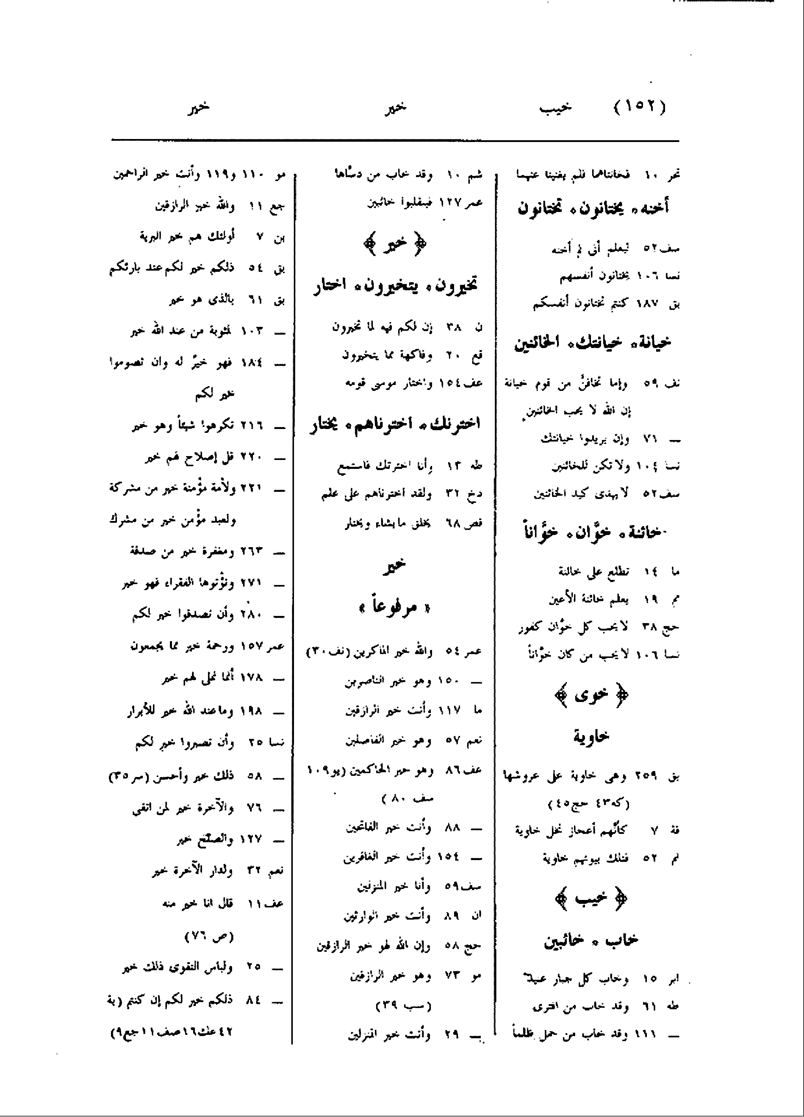 - 71 وإن يريدوا خيانتك نسا 104 ولا تكن للخائنين سف 52 لا يهدى كيد الخائنين خائنة خوّان خوّانا ما 14 تطلع على خائنة مم 19 يعلم خائنة الأعين حج 38 لا يجب كل خوّان كفور نسا 106 لا يحب من كان خوّانا خوى خاوية بق 259 وهى خاوية على عروشها (كه 43 حج 45) قة 7 كأنّهم أعجاز نخل خاوية نم 52 فتلك بيوتهم خاوية خيب خاب خائبين ابر 15 وخاب كل جبار عنيد طه 61 وقد خاب من افترى- 111 وقد خاب من حمل ظلما شم 10 وقد خاب من دسّاها عمر 127 فينقلبوا خائبين خير تخيرون يتخيرون اختار ن 38 إن لكم فيه لما تخيرون قع 20 وفاكهة مما يتخيرون عف 154 واختار موسى قومه اخترنك اخترناهم يختار طه 13 وأنا اخترتك فاستمع دخ 32 ولقد اخترناهم على علم قص 68 يخلق ما يشاء ويختار خير «مرفوعا» عمر 54 والله خير الماكرين (نف 30) - 150 وهو خير الناصرين ما 117 وأنت خير الرازقين نعم 57 وهو خير الفاصلين عف 86 وهو خير الحاكمين (يو 109 سف 80) - 88 وأنت خير الفاتحين- 154 وأنت خير الغافرين سف 59 وأنا خير المنزلين ان 89 وأنت خير الوارثين حج 58 وإن الله لهو خير الرازقين مو 73 وهو خير الرازقين (سب 39) - 29 وأنت خير المنزلين مو 110 و 119 وأنت خير الراحمين جع 11 والله خير الرازقين بن 7 أولئك هم خير البرية بق 54 ذلكم خير لكم عند بارئكم بق 61 بالذى هو خير- 103 لمثوبة من عند الله خير- 184 فهو خير له وان تصوموا خير لكم- 216 تكرهوا شيئا وهو خير- 220 قل إصلاح لهم خير- 221 ولأمة مؤمنة خير من مشركة ولعبد مؤمن خير من مشرك- 263 ومغفرة خير من صدقة- 271 وتؤتوها الفقراء فهو خير- 280 وأن تصدقوا خير لكم عمر 157 ورحمة خير مما يجمعون- 178 أنما نملى لهم خير- 198 وما عند الله خير للأبرار نسا 25 وأن تصبروا خير لكم- 58 ذلك خير وأحسن (سر 35) - 76 والآخرة خير لمن اتقى- 127 والصلح خير نعم 32 ولدار الآخرة خير عف 11 قال انا خير منه (ص 76) - 25 ولباس التقوى ذلك خير- 84 ذلكم خير لكم إن كنتم (بة 42 عك 16 صف 11 جع 9)