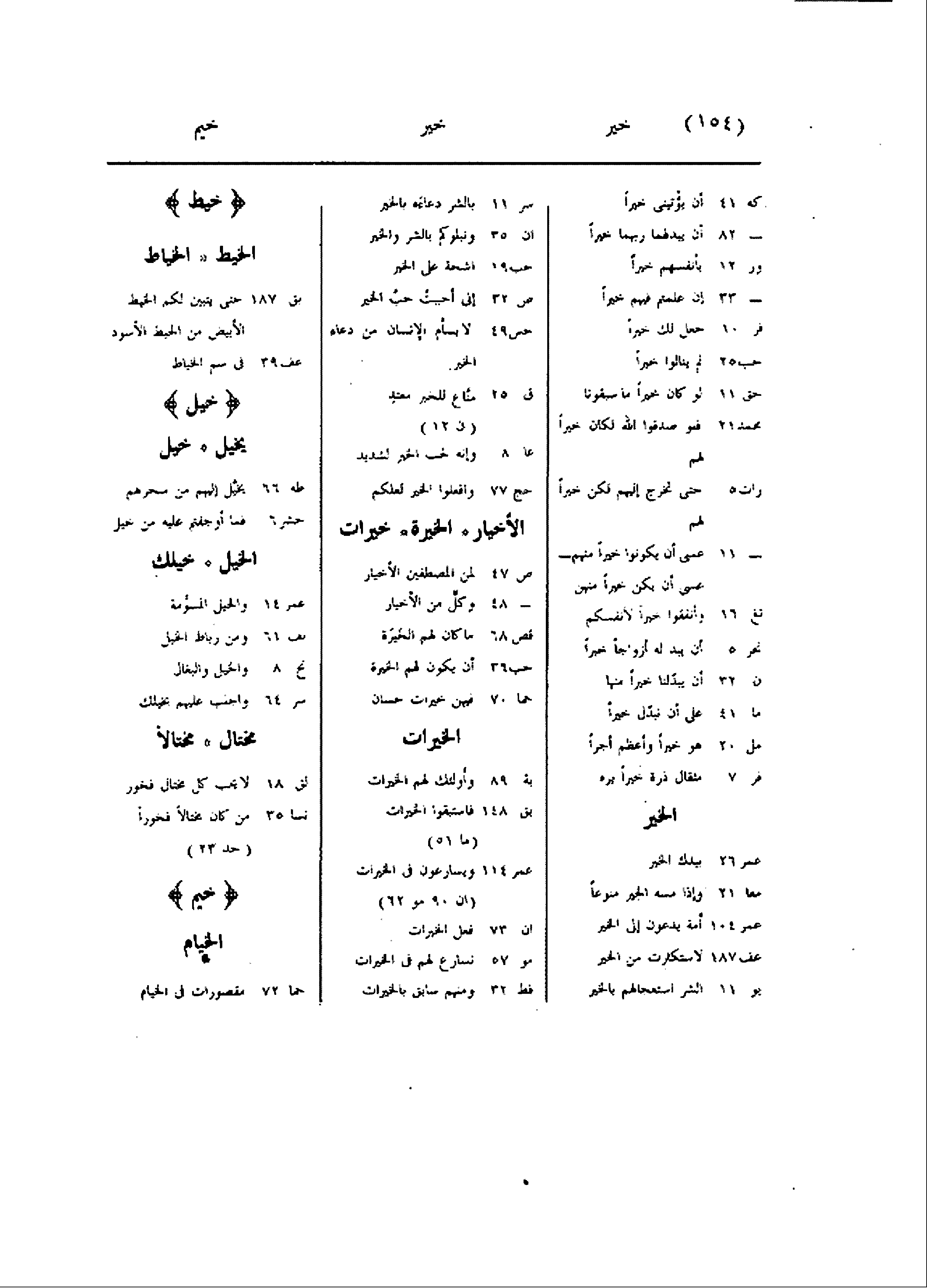 ق 25 منّاع للخير معتد (ن 12) عا 8 وإنه لحب الخير لشديد حج 77 وافعلوا الخير لعلكم الأخيار الخيرة خيرات ص 47 لمن المصطفين الأخيار- 48 وكلّ من الأخيار قص 68 ما كان لهم الخيرة حب 36 أن يكون لهم الخيرة حما 70 فيهن خيرات حسان الخيرات بة 89 وأولئك لهم الخيرات بق 148 فاستبقوا الخيرات (ما 51) عمر 114 ويسارعون فى الخيرات (ان 90 مو 62) ان 73 فعل الخيرات مو 57 نسارع لهم فى الخيرات فط 32 ومنهم سابق بالخيرات خيط الخيط الخياط بق 187 حتى يتبين لكم الخيط الأبيض من الخيط الأسود عف 39 فى سم الخياط خيل يخيل خيل طه 66 يخيّل إليهم من سحرهم حشر 6 فما أوجفتم عليه من خيل الخيل خيلك عمر 14 والخيل المسوّمة نف 61 ومن رباط الخيل نح 8 والخيل والبغال سر 64 واجلب عليهم بخيلك مختال مختالا لق 18 لا يحب كل مختال فخور نسا 35 من كان مختالا فخورا (حد 23) خيم الخيام حما 72 مقصورات فى الخيام