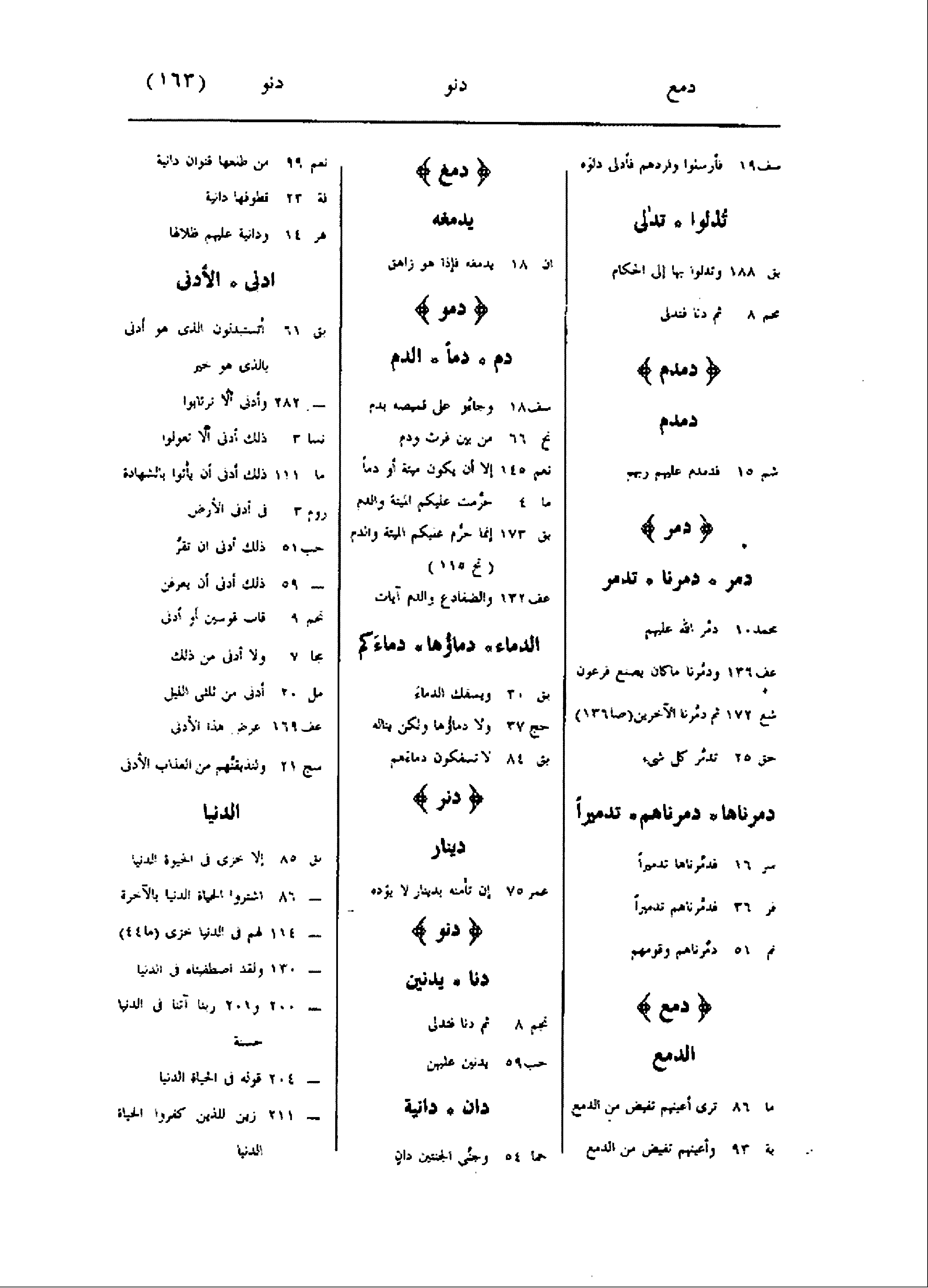 سف 19 فأرسلوا واردهم فأدلى دلوه تدلوا تدلى بق 188 وتدلوا بها إلى الحكام محم 8 ثم دنا فتدلى دمدم دمدم شم 15 فدمدم عليهم ربهم دمر دمر دمرنا تدمر محمد 10 دمّر الله عليهم عف 136 ودمّرنا ما كان يصنع فرعون شع 172 ثم دمّرنا الآخرين (صا 136) حق 25 تدمّر كل شىء دمرناها دمرناهم تدميرا سر 16 فدمّرناها تدميرا فر 36 فدمّرناهم تدميرا نم 51 دمّرناهم وقومهم دمع الدمع ما 86 ترى أعينهم تفيض من الدمع بة 93 وأعينهم تفيض من الدمع دمغ يدمغه ان 18 يدمغه فإذا هو زاهق دمو دم دما الدم سف 18 وجاءو على قميصه بدم نح 66 من بين فرث ودم نعم 145 إلا أن يكون ميتة أو دما ما 4 حرّمت عليكم الميتة والدم بق 173 إنمّا حرّم عليكم الميتة والدم (نح 115) عف 132 والضفادع والدم آيات الدماء دماؤها دماءكم بق 30 ويسفك الدماء حج 37 ولا دماؤها ولكن يناله بق 84 لا تسفكون دماءهم دنر دينار عمر 75 إن تأمنه بدينار لا يؤده دنو