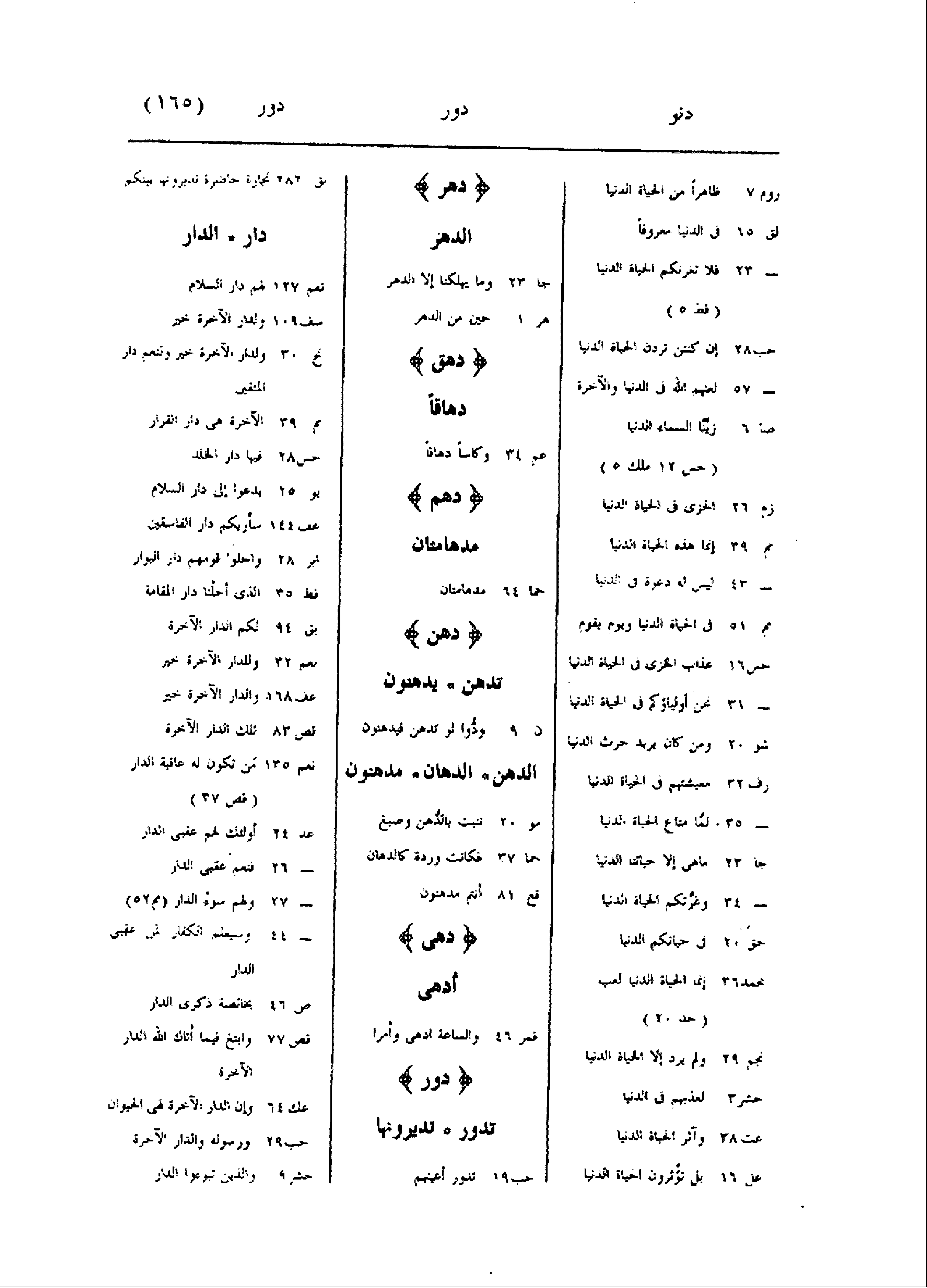 روم 7 ظاهرا من الحياة الدنيا لق 15 فى الدنيا معروفا- 23 فلا تغرنكم الحياة الدنيا (فط 5) حب 28 إن كنتن تردن الحياة الدنيا- 57 لعنهم الله فى الدنيا والآخرة صا 6 زينّا السماء الدنيا (حس 12 ملك 5) زم 26 الخزى فى الحياة الدنيا مم 39 إنما هذه الحياة الدنيا- 43 ليس له دعوة فى الدنيا مم 51 فى الحياة الدنيا ويوم يقوم حس 16 عذاب الخزى فى الحياة الدنيا- 31 نحن أولياؤكم فى الحياة الدنيا شو 20 ومن كان يريد حرث الدنيا رف 32 معيشتهم فى الحياة الدنيا- 35. لمّا متاع الحياة الدنيا جا 23 ما هى إلا حياتنا الدنيا- 34 وغرّتكم الحياة الدنيا حق 20 فى حياتكم الدنيا محمد 36 إنما الحياة الدنيا لعب (حد 20) نجم 29 ولم يرد إلا الحياة الدنيا حشر 3 لعذبهم فى الدنيا عت 38 وآثر الحياة الدنيا عل 16 بل تؤثرون الحياة الدنيا دهر الدهر جا 23 وما يهلكنا إلا الدهر هر 1 حين من الدهر دهق دهاقا عم 34 وكاسا دهاقا دهم مدهامتان حما 64 مدهامتان دهن تدهن يدهنون ن 9 ودّوا لو تدهن فيدهنون الدهن الدهان مدهنون مو 20 تنبت بالدّهن وصبغ حما 37 فكانت وردة كالدهان قع 81 أنتم مدهنون دهى أدهى قمر 46 والساعة ادهى وأمرا دور تدور تديرونها حب 19 تدور أعينهم بق 282 تجارة حاضرة تديرونها بينكم دار الدار نعم 127 لهم دار السلام سف 109 ولدار الآخرة خير نح 30 ولدار الآخرة خير
