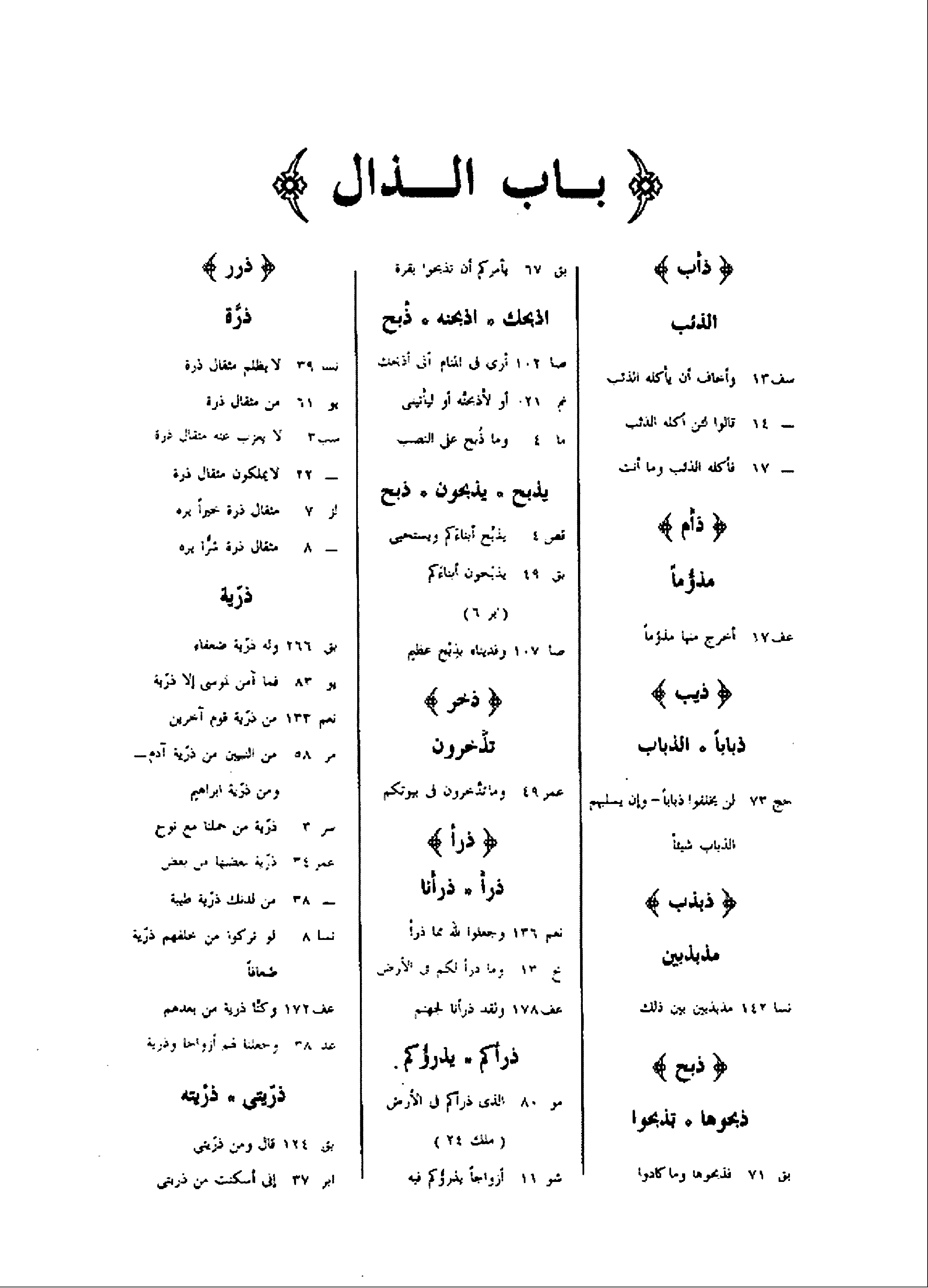 ذأب الذئب سف 13 وأخاف أن يأكله الذئب- 14 قالوا لئن أكله الذئب- 17 فأكله الذئب وما أنت ذأم مذؤما عف 17 أخرج منها مذؤما ذيب ذبابا الذباب حج 73 لن يخلقوا ذبابا- وإن يسلبهم الذباب شيئا ذبذب مذبذبين نسا 142 مذبذبين بين ذلك ذبح ذبحوها تذبحوا بق 71 فذبحوها وما كادوا بق 67 يأمركم أن تذبحوا بقرة اذبحك اذبحنه ذبح صا 102 أرى فى المنام أنى أذبحك نم 21 أو لأذبحنّه أو ليأتينى ما 4 وما ذبح على النصب يذبح يذبحون ذبح قص 4 يذبّح أبناءكم ويستحيى بق 49 يذبّحون أبناءكم (ابر 6) صا 107 وفديناه بذبح عظيم ذخر تذّخرون عمر 49 وما تدّخرون فى بيوتكم ذرأ ذرأ ذرأنا نعم 136 وجعلوا لله مما ذرأ نح 13 وما ذرأ لكم فى الأرض عف 178 ولقد ذرأنا لجهنم ذرأكم يذرؤكم.
