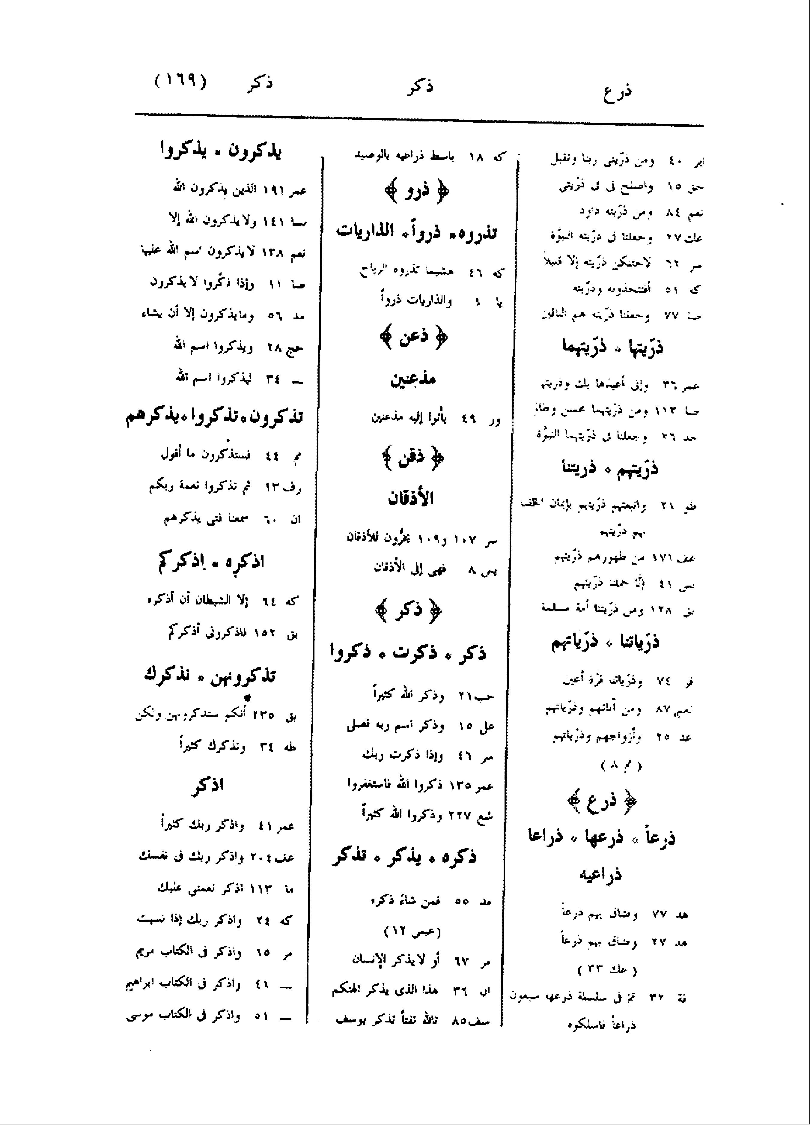 ابر 40 ومن ذرّيتى ربنا وتقبل حق 15 واصلح لى فى ذرّيتى نعم 84 ومن ذرّيته داود عك 27 وجعلنا فى ذرّيته النبوّة سر 62 لاحتنكن ذرّيته إلا قليلا كه 51 أفتتخذونه وذرّيته صا 77 وجعلنا ذرّيته هم الباقين ذرّيتها ذرّيتهما عمر 36 وإنى أعيذها بك وذريتها صا 113 ومن ذرّيتهما محسن وظالم حد 26 وجعلنا فى ذرّيتهما النبوّة ذرّيتهم ذريتنا طو 21 واتبعتهم ذرّيتهم بإيمان الحقنا بهم ذرّيتهم عف 171 من ظهورهم ذرّيتهم يس 41 إنّا حملنا ذرّيتهم بق 128 ومن ذرّيتنا أمة مسلمة ذرّياتنا ذرّياتهم فر 74 وذرّياتنا قرّة أعين نعم 87 ومن آبائهم وذرّياتهم عد 25 وأزواجهم وذرّياتهم (مم 8) ذرع ذرعا ذرعها ذراعا ذراعيه هد 77 وضاق بهم ذرعا هد 27 وضاق بهم ذرعا (عك 33) قة 32 تمّ فى سلسلة ذرعها سبعون ذراعا فاسلكوه كه 18 باسط ذراعيه بالوصيد ذرو تذروه ذروا الذاريات كه 46 هشيما تذروه الرياح يا 1 والذاريات ذروا ذعن مذعنين ور 49 يأتوا إليه مذعنين ذقن الأذقان سر 107 و 109 يخرّون للأذقان يس 8 فهى إلى الأذقان ذكر ذكر ذكرت ذكروا حب 21 وذكر الله كثيرا عل 15 وذكر اسم ربه فصلى سر 46 وإذا ذكرت ربك عمر 135 ذكروا الله فاستغفروا شع 227 وذكروا الله كثيرا ذكره يذكر تذكر مد 55 فمن شاء ذكره (عبس 12) مر 67 أو لا يذكر الإنسان ان 36 هذا الذى يذكر الهتكم سف 85 تالله تفتأ تذكر يوسف يذكرون يذكروا عمر 191 الذين يذكرون الله نسا 141 ولا يذكرون الله إلا نعم 138 لا يذكرون اسم الله عليها صا 11 وإذا ذكّروا لا يذكرون مد 56 وما يذكرون إلا أن يشاء حج 28 ويذكروا اسم الله- 34 ليذكروا اسم الله تذكرون تذكروا يذكرهم مم 44 فستذكرون ما أقول رف 13 ثم تذكروا نعمة ربكم ان 60 سمعنا فتى يذكرهم اذكره اذكركم كه 64 إلا الشيطان أن أذكره بق 152 فاذكرونى أذكركم تذكرونهن نذكرك بق 235 أنكم ستذكرونهن ولكن طه 34 ونذكرك كثيرا اذكر عمر 41 واذكر ربك كثيرا عف 204 واذكر ربك فى نفسك ما 113 اذكر نعمتى عليك كه 24 واذكر ربك إذا نسيت مر 15 واذكر فى الكتاب مريم- 41 واذكر فى الكتاب ابراهيم- 51 واذكر فى الكتاب موسى