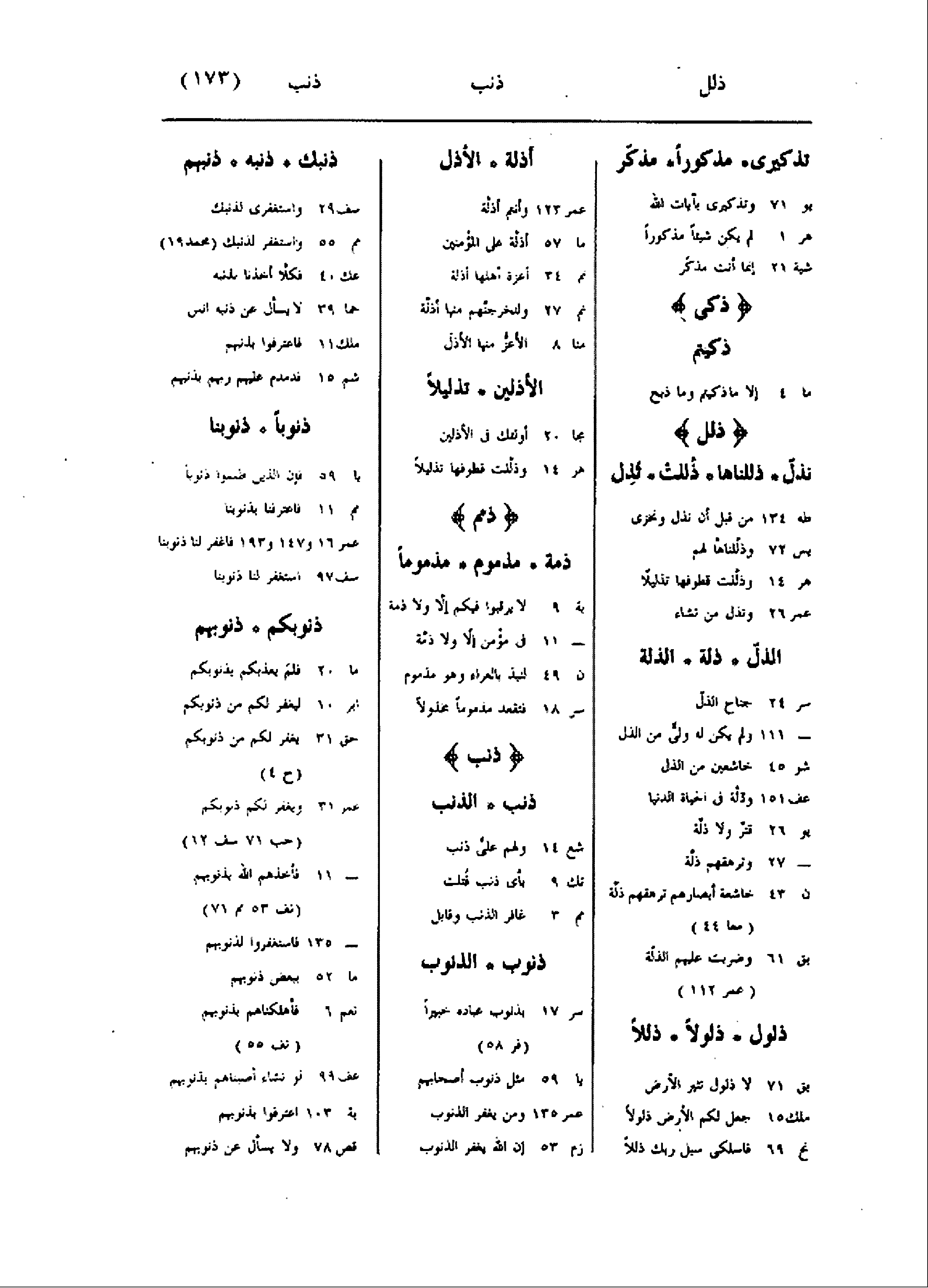 تذكيرى مذكورا مذكّر يو 71 وتذكيرى بآيات الله هر 1 لم يكن شيئا مذكورا شية 21 إنما أنت مذكّر ذكى ذكيتم ما 4 إلا ما ذكيتم وما ذبح ذلل نذلّ ذللناها ذللت تذل طه 134 من قبل أن نذل ونخزى يس 72 وذلّلناها لهم هر 14 وذلّلت قطوفها تذليلا عمر 26 وتذل من تشاء الذلّ ذلة الذلة سر 24 جناح الذلّ- 111 ولم يكن له ولىّ من الذل شو 45 خاشعين من الذل عف 151 وذلّة فى الحياة الدنيا يو 26 قتر ولا ذلّة- 27 وترهقهم ذلّة ن 43 خاشعة أبصارهم ترهقهم ذلّة (معا 44) بق 61 وضربت عليهم الذلّة (عمر 112) ذلول ذلولا ذللا بق 71 لا ذلول تثير الأرض ملك 15 جعل لكم الأرض ذلولا نح 69 فاسلكى سبل ربك ذللا أذلة الأذل عمر 123 وأنتم أذلّة ما 57 أذلّة على المؤمنين نم 34 أعزة أهلها أذلة نم 27 ولنخرجنّهم منها أذلّة منا 8 الأعزّ منها الأذلّ الأذلين تذليلا مجا 20 أولئك فى الأذلين هر 14 وذلّلت قطوفها تذليلا ذمم ذمة مذموم مذموما بة 9 لا يرقبوا فيكم إلّا ولا ذمة- 11 فى مؤمن إلّا ولا ذمّة ن 49 لنبذ بالعراء وهو مذموم سر 18 فتقعد مذموما مخذولا ذنب ذنب الذنب شع 14 ولهم علىّ ذنب تك 9 بأى ذنب قتلت مم 3 غافر الذنب وقابل ذنوب الذنوب سر 17 بذنوب عباده خبيرا (فر 58) يا 59 مثل ذنوب أصحابهم عمر 135 ومن يغفر الذنوب زم 53 إن الله يغفر الذنوب ذنبك ذنبه ذنبهم سف 29 واستغفرى لذنبك مم 55 واستغفر لذنبك (محمد 19) عك 40 فكلّا أخذنا بذنبه حما 39 لا يسأل عن ذنبه انس ملك 11 فاعترفوا بذنبهم شم 15 فدمدم عليهم ربهم بذنبهم ذنوبا ذنوبنا يا 59 فإن الذين ظلموا ذنوبا مم 11 فاعترفنا بذنوبنا عمر 16 و 147 و 193 فاغفر لنا ذنوبنا سف 97 استغفر لنا ذنوبنا ذنوبكم ذنوبهم ما 20 فلم يعذبكم بذنوبكم ابر 10 ليغفر لكم من ذنوبكم حق 31 يغفر لكم من ذنوبكم (ح 4) عمر 31 ويغفر لكم ذنوبكم (حب 71 سف 12) - 11 فأخذهم الله بذنوبهم (نف 53 مم 71) - 135 فاستغفروا لذنوبهم ما 52 ببعض ذنوبهم نعم 6 فأهلكناهم بذنوبهم (نف 55) عف 99 لو نشاء أصبناهم بذنوبهم بة 103 اعترفوا بذنوبهم قص 78 ولا يسأل عن ذنوبهم