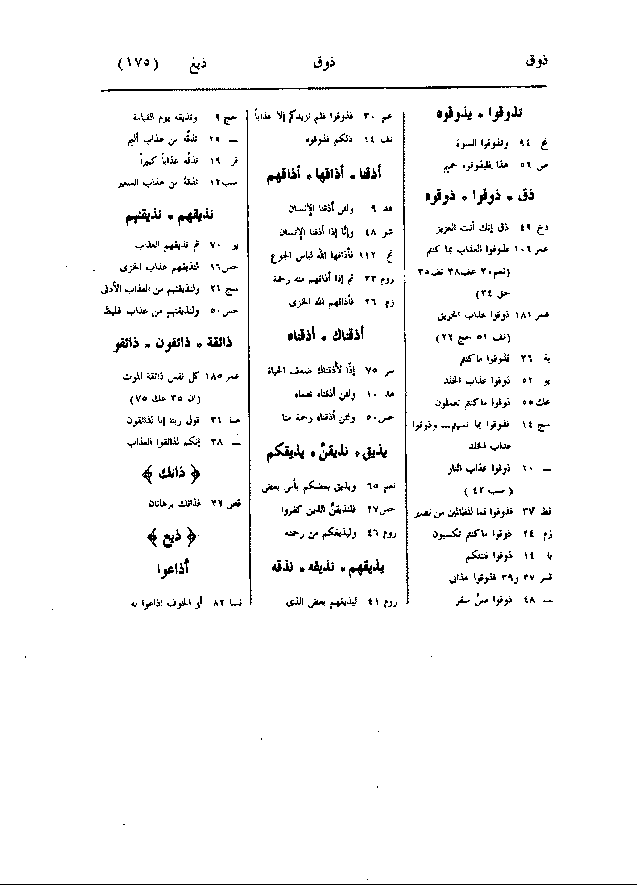 تذوقوا يذوقوه نح 94 وتذوقوا السوء ص 56 هذا فليذوقوه حميم ذق ذوقوا ذوقوه دخ 49 ذق إنك أنت العزيز عمر 106 فذوقوا العذاب بما كنتم (نعم 30 عف 38 نف 35 حق 34) عمر 181 ذوقوا عذاب الحريق (نف 51 حج 22) بة 36 فذوقوا ما كنتم يو 52 ذوقوا عذاب الخلد عك 55 ذوقوا ما كنتم تعملون سج 14 فذوقوا بما نسيتم- وذوقوا عذاب الخلد- 20 ذوقوا عذاب النار (سب 42) فط 37 فذوقوا فما للظالمين من نصير زم 24 ذوقوا ما كنتم تكسبون يا 14 ذوقوا فتنتكم قمر 37 و 39 فذوقوا عذابى- 48 ذوقوا مسّ سقر عم 30 فذوقوا فلم نزيدكم إلا عذابا نف 14 ذلكم فذوقوه أذقنا أذاقها أذاقهم هد 9 ولئن أذقنا الإنسان شو 48 وإنّا إذا أذقنا الإنسان نح 112 فأذاقها الله لباس الجوع روم 33 ثم إذا أذاقهم منه رحمة زم 26 فأذاقهم الله الخزى أذقناك أذقناه سر 75 إذا لأذقناك ضعف الحياة هد 10 ولئن أذقناه نعماء حس 50 ولئن أذقناه رحمة منا يذيق نذيقنّ يذيقكم نعم 65 ويذيق بعضكم بأس بعض حس 27 فلنذيقنّ الذين كفروا روم 46 وليذيقكم من رحمته يذيقهم نذيقه نذقه روم 41 ليذيقهم بعض الذى حج 9 ونذيقه يوم القيامة- 25 نذقه من عذاب أليم فر 19 نذقه عذابا كبيرا سب 12 نذقه من عذاب السعير نذيقهم نذيقنهم يو 70 ثم نذيقهم العذاب حس 16 لنذيقهم عذاب الخزى سج 21 ولنذيقنهم من العذاب الأدنى حس 50 ولنذيقنهم من عذاب غليظ ذائقة ذائقون ذائقو عمر 185 كل نفس ذائقة الموت (ان 35 عك 75) صا 31 قول ربنا إنا لذائقون- 38 إنكم لذائقوا العذاب ذانك قص 32 فذانك برهانان ذيع أذاعوا نسا 82 أو الخوف اذاعوا به