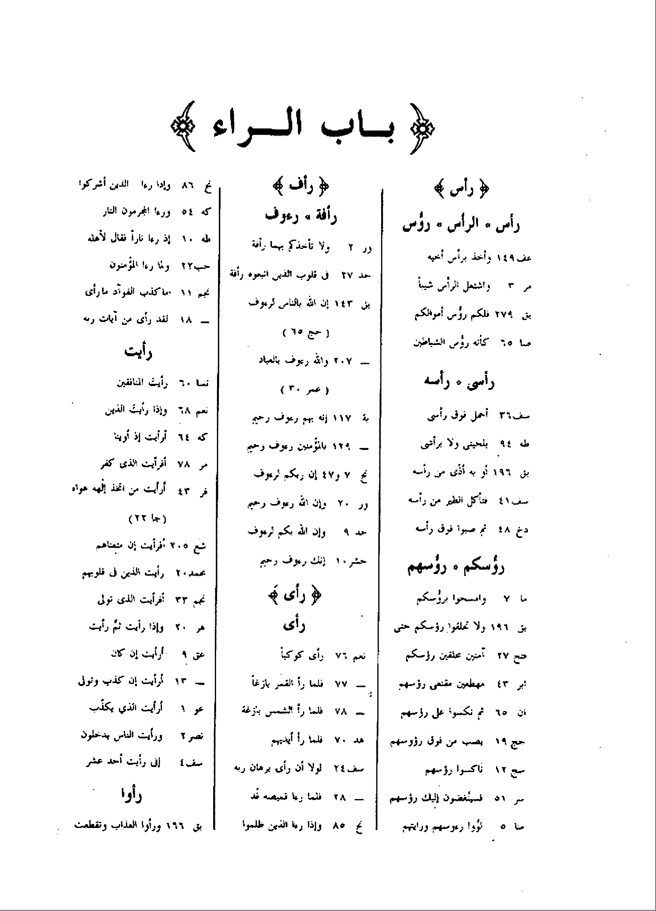 رأس رأس الرأس رؤس عف 149 وأخذ برأس أخيه مر 3 واشتعل الرأس شيبا بق 279 فلكم رؤس أموالكم صا 65 كأنه رؤس الشياطين رأسى رأسه سف 36 أحمل فوق رأسى طه 94 بلحيتى ولا برأسى بق 196 أو به أذى من رأسه سف 41 فتأكل الطير من رأسه دخ 48 ثم صبوا فوق رأسه رؤسكم رؤسهم ما 7 وامسحوا برؤسكم بق 196 ولا تحلقوا رؤسكم حتى فتح 27 آمنين محلقين رؤسكم ابر 43 مهطعين مقنعى رؤسهم ان 65 ثم نكسوا على رؤسهم حج 19 يصب من فوق رؤوسهم سج 12 ناكسوا رؤسهم سر 51 فسينغضون إليك رؤسهم منا 5 لوّوا رءوسهم ورايتهم رأف رأفة رءوف ور 2 ولا تأخذكم بهما رأفة حد 27 فى قلوب الذين اتبعوه رأفة بق 143 إن الله بالناس لرءوف (حج 65) - 207 والله رءوف بالعباد (عمر 30) بة 117 إنه بهم رءوف رحيم- 129 بالمؤمنين رءوف رحيم نح 7 و 47 إن ربكم لرءوف ور 20 وإن الله رءوف رحيم حد 9 وإن الله بكم لرءوف حشر 10 إنك رءوف رحيم رأى رأى نعم 76 رأى كوكبا- 77 فلما رأ القمر بازغا- 78 فلما رأ الشمس بازغة هد 70 فلما رأ أيديهم سف 24 لولا أن رأى برهان ربه- 28 فلما رءا قميصه فد نح 85 وإذا رءا الذين ظلموا نح 86 وإذا رءا الذين أشركوا كه 54 ورءا المجرمون النار طه 10 إذا رءا نارا فقال لأهله حب 22 ولما رءا المؤمنون نجم 11 ما كذب الفوآد ما رأى- 18 لقد رأى من آيات ربه رأيت نسا 60 رأيت المنافقين نعم 68 وإذا رأيت الذين كه 64 أرأيت إذ أوينا مر 78 أفرأيت الذى كفر فر 43 أرأيت من اتخذ إلهه هواه (جا 22) شع 205 أفرأيت إن متعناهم محمد 20 رأيت الذين فى قلوبهم نجم 33 أفرأيت الذى تولى هر 20 وإذا رأيت ثمّ رأيت عق 9 أرأيت إن كان- 13 أرأيت إن كذب وتولى عو 1 أرأيت الذي يكذّب نصر 2 ورأيت الناس يدخلون سف 4 إنى رأيت أحد عشر رأوا بق 166 ورأوا العذاب وتقطعت