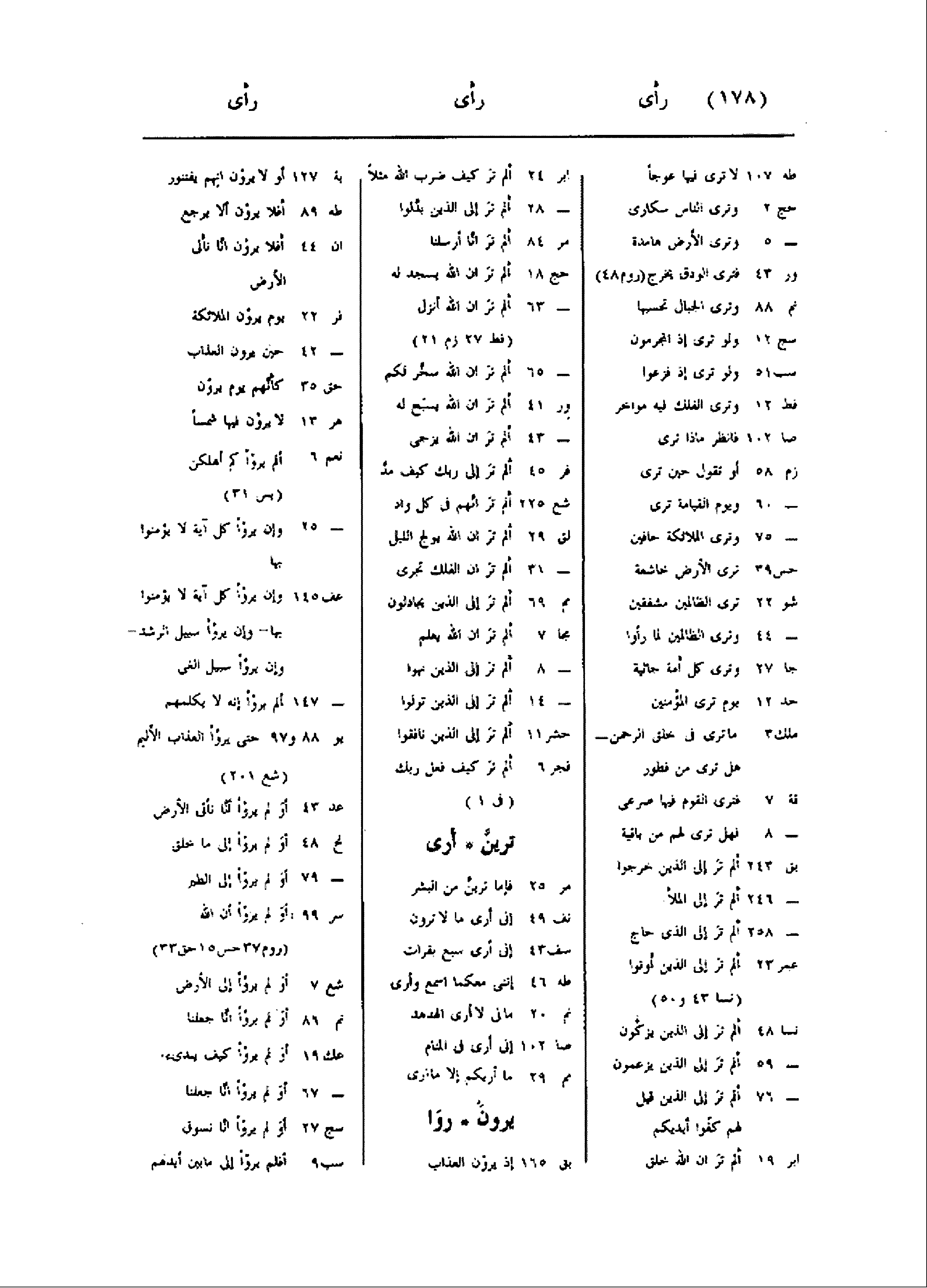 (روم 48) نم 88 وترى الجبال تحسبها سج 12 ولو ترى إذ المجرمون سب 51 ولو ترى إذ فزعوا فط 12 وترى الفلك فيه مواخر صا 102 فانظر ماذا ترى زم 58 أو تقول حين ترى- 60 ويوم القيامة ترى- 75 وترى الملائكة حافين حس 39 ترى الأرض خاشعة شو 22 ترى الظالمين مشفقين- 44 وترى الظالمين لما رأوا جا 27 وترى كل أمة جاثية حد 12 يوم ترى المؤمنين ملك 3 ما ترى فى خلق الرحمن- هل ترى من فطور قة 7 فترى القوم فيها صرعى- 8 فهل ترى لهم من باقية بق 243 ألم تر إلى الذين خرجوا- 246 ألم تر إلى الملأ- 258 ألم تر إلى الذى حاج عمر 23 ألم تر إلى الذين أوتوا (نسا 43 و 50) نسا 48 ألم تر إلى الذين يزكّون- 59 ألم تر إلى الذين يزعمون- 76 ألم تر إلى الذين قيل لهم كفّوا أيديكم ابر 19 ألم تر ان الله خلق ابر 24 ألم تر كيف ضرب الله مثلا- 28 ألم تر إلى الذين بدّلوا مر 84 ألم تر انّا أرسلنا حج 18 ألم تر ان الله يسجد له- 63 ألم تر ان الله أنزل (فط 27 زم 21) - 65 ألم تر ان الله سخّر لكم ور 41 ألم تر ان الله يسبح له- 43 ألم تر ان الله يزجى فر 45 ألم تر إلى ربك كيف مدّ شع 225 ألم تر انّهم فى كل واد- لق 29 ألم تر ان الله يولج الليل- 31 ألم تر ان الفلك تجرى مم 69 ألم تر إلى الذين يجادلون مجا 7 ألم تر ان الله يعلم- 8 ألم تر إلى الذين نهوا- 14 ألم تر إلى الذين تولوا حشر 11 ألم تر إلى الذين نافقوا فجر 6 ألم تر كيف فعل ربك (فى 1) ترينّ أرى مر 25 فإما ترينّ من البشر نف 49 إنى أرى ما لا ترون سف 43 إنى أرى سبع بقرات طه 46 إننى معكما اسمع وأرى نم 20 مالى لا أرى الهدهد صا 102 إنى أرى فى المنام مم 29 ما أريكم إلا ما أرى يرون روا بق 165 إذ يرون العذاب بة 127 أو لا يرون انهم يفتنور طه 89 أفلا يرون ألا يرجع ان 44 أفلا يرون انّا نأتى الأرض فر 22 يوم يرون الملائكة- 42 حين يرون العذاب حق 35 كأنّهم يوم يرون هر 13 لا يرون فيها شمسا نعم 6 ألم يروا كم أهلكن (يس 31) - 25 وإن يروا كل آية لا يؤمنوا بها عف 145 وإن يروا كل آية لا يؤمنوا بها- وإن يروا سبيل الرشد- وإن يروا سبيل الغى- 147 ألم يروا إنه لا يكلمهم يو 88 و 97 حتى يروا العذاب الأليم (شع 201) عد 43 أو لم يروا أنّا نأتى الأرض نح 48 أو لم يروا إلى ما خلق- 79 أو لم يروا إلى الطير سر 99 أو لم يروا أن الله (روم 37 حس 15 حق 33) شع 7 أو لم يروا إلى الأرض نم 86 أو لم يروا انّا جعلنا عك 19 أو لم يروا كيف يبدىء.