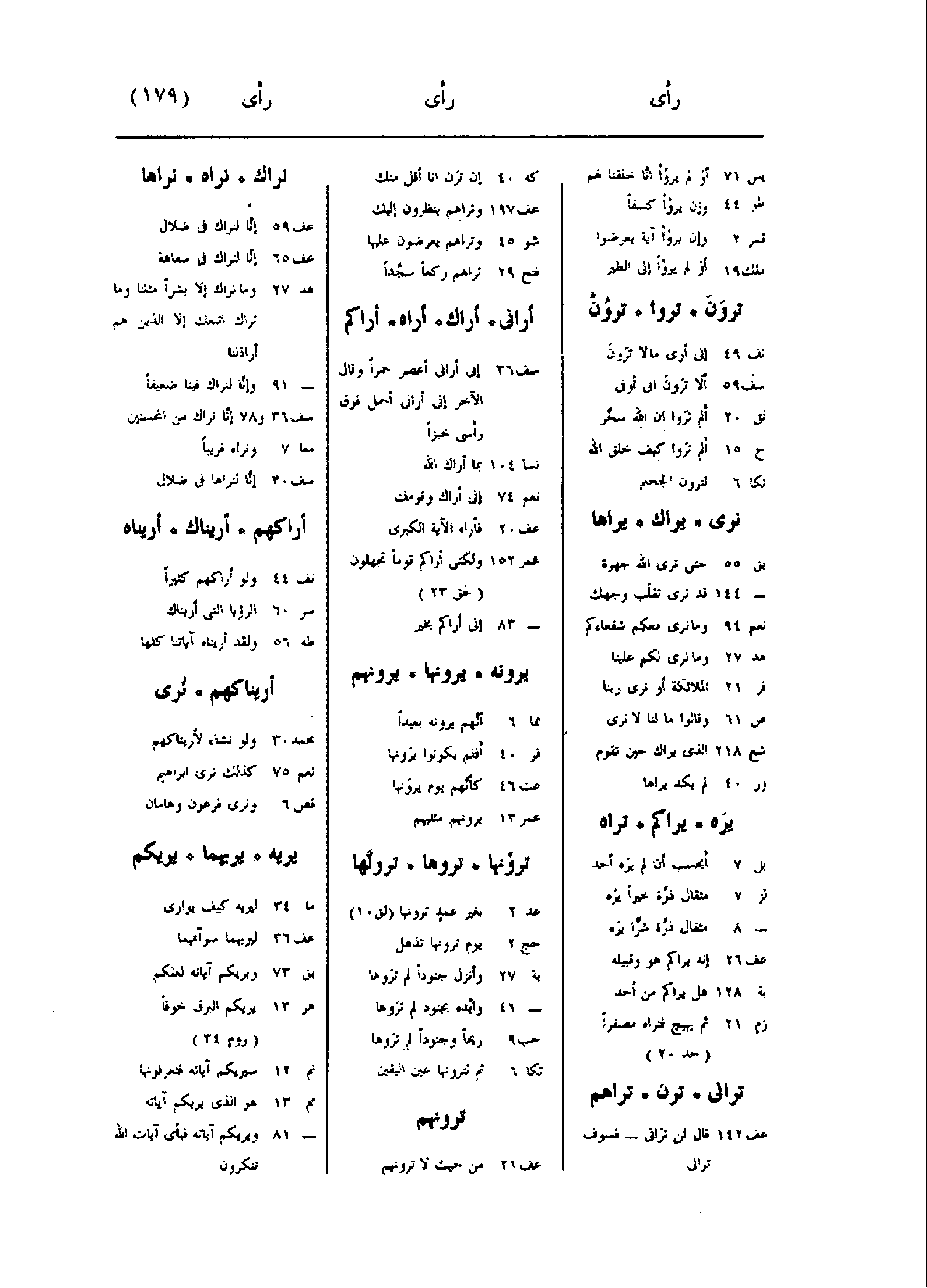 يس 71 أو لم يروا أنّا خلقنا لهم طو 44 وإن يروا كسفا قمر 2 وإن يروا آية يعرضوا ملك 19 أو لم يروا إلى الطير ترون تروا ترونّ نف 49 إنى أرى ما لا ترون سف 59 ألا ترون انى أوفى لق 20 ألم تروا ان الله سخّر ح 15 ألم تروا كيف خلق الله تكا 6 لترون الجحيم نرى يراك يراها بق 55 حتى نرى الله جهرة- 144 قد نرى تقلّب وجهك نعم 94 وما نرى معكم شفعاءكم هد 27 وما نرى لكم علينا فر 21 الملائكة أو نرى ربنا ص 61 وقالوا ما لنا لا نرى شع 218 الذى يراك حين تقوم ور 40 لم يكد يراها يره يراكم تراه بل 7 أيحسب أن لم يره أحد لز 7 مثقال ذرّة خيرا يره- 8 مثقال ذرّة شرّا يره عف 26 إنه يراكم هو وقبيله بة 128 هل يراكم من أحد زم 21 ثم يهيج فتراه مصفرا (حد 20) ترانى ترن تراهم عف 142 قال لن ترانى- فسوف ترانى كه 40 إن ترن انا أقل منك عف 197 وتراهم ينظرون إليك شو 45 وتراهم يعرضون عليها فتح 29 تراهم ركعا سجّدا أرانى أراك أراه أراكم سف 36 إنى أرانى أعصر خمرا وقال الآخر إنى أرانى أحمل فوق رأسى خبزا نسا 104 بما أراك الله نعم 74 إنى أراك وقومك عف 20 فأراه الآية الكبرى عمر 152 ولكنى أراكم قوما تجهلون (حق 23) - 83 إنى أراكم بخير يرونه يرونها يرونهم مما 6 أنّهم يرونه بعيدا فر 40 أفلم يكونوا يرونها عت 46 كأنّهم يوم يرونها عمر 13 يرونهم مثليهم ترونها تروها ترونّها عد 2 بغير عمد ترونها (لق 10) حج 2 يوم ترونها تذهل بة 27 وأنزل جنودا لم تروها- 41 وأيّده بجنود لم تروها حب 9 ريحا وجنودا لم تروها تكا 6 ثم لترونها عين اليقين ترونهم عف 21 من حيث لا ترونهم نراك نراه نراها عف 59 إنّا لنراك فى ضلال عف 65 إنّا لنراك فى سفاهة هد 27 وما نراك إلا بشرا مثلنا وما تراك اتبعك إلا الذين هم أراذلنا- 91 وإنّا لنراك فينا ضعيفا سف 36 و 78 إنّا نراك من المحسنين معا 7 ونراه قريبا سف 30 إنّا لنراها فى ضلال أراكهم أريناك أريناه نف 44 ولو أراكهم كثيرا سر 60 الرؤيا التى أريناك طه 56 ولقد أريناه آياتنا كلها أريناكهم نرى محمد 30 ولو نشاء لأريناكهم نعم 75 كذلك نرى ابراهيم قص 6 ونرى فرعون وهامان يريه يريهما يريكم ما 34 ليريه كيف يوارى عف 36 ليريهما سوآتهما بق 73 ويريكم آياته لعلكم هر 13 يريكم البرق خوفا (روم 34) نم 12 سيريكم آياته فتعرفونها مم 13 هو الذى يريكم آياته- 81 ويريكم آياته فبأى آيات الله تنكرون