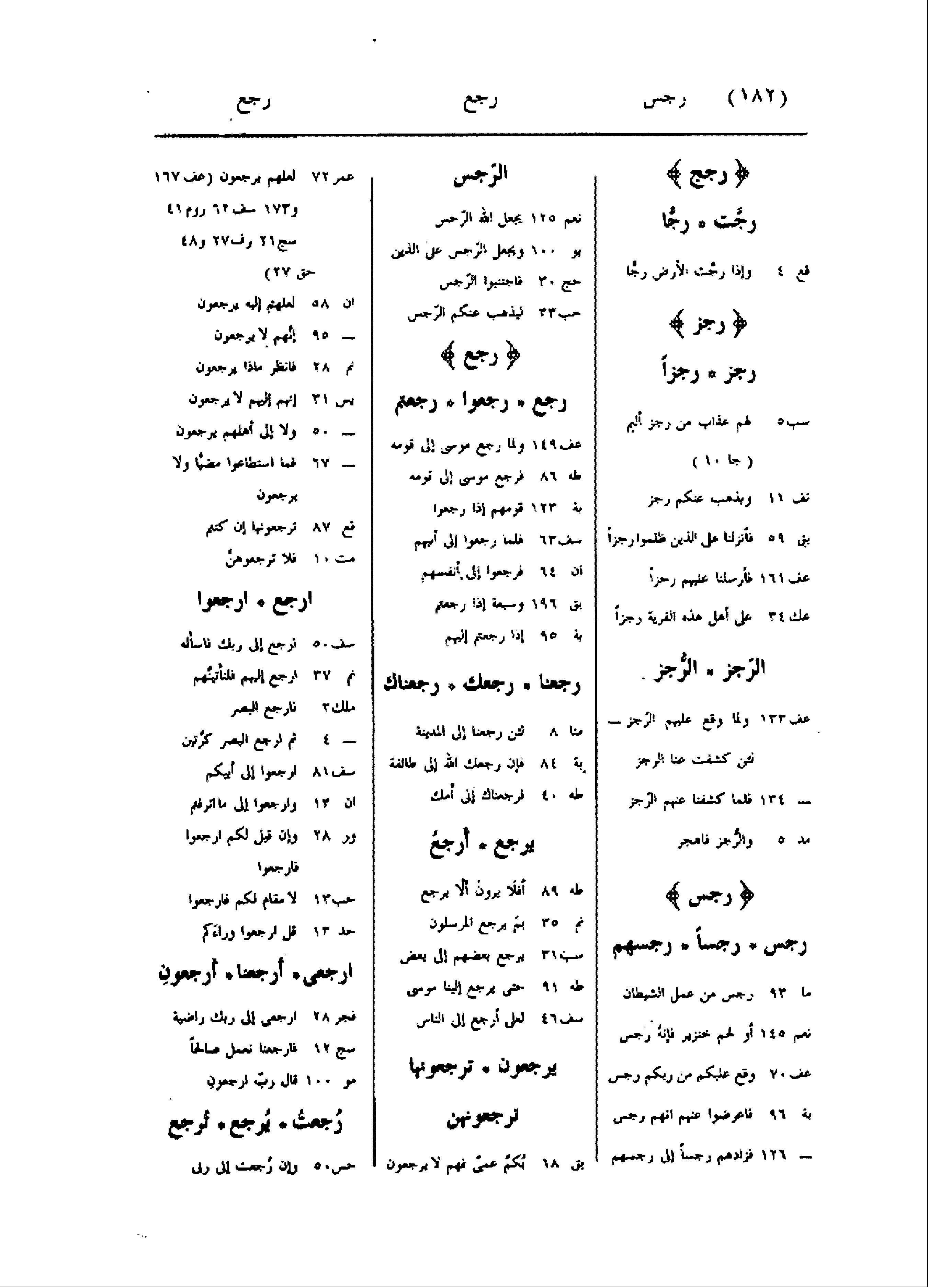 رجج رجّت رجّا قع 4 وإذا رجّت الأرض رجّا رجز رجز رجزا سب 5 لهم عذاب من رجز أليم (جا 10) نف 11 ويذهب عنكم رجز بق 59 فأنزلنا على الذين ظلموا رجزا عف 161 فأرسلنا عليهم رجزا عك 34 على أهل هذه القرية رجزا الرّجز الرّجز عف 133 ولما وقع عليهم الرّجز- لئن كشفت عنا الرجز- 134 فلما كشفنا عنهم الرّجز مد 5 والرّجز فاهجر رجس رجس رجسا رجسهم ما 93 رجس من عمل الشيطان نعم 145 أو لحم خنزير فإنه رجس عف 70 وقع عليكم من ربكم رجس بة 96 فاعرضوا عنهم انهم رجس- 126 فزادهم رجسا إلى رجسهم الرّجس نعم 125 يجعل الله الرّجس يو 100 ويجعل الرّجس على الذين حج 30 فاجتنبوا الرّجس حب 33 ليذهب عنكم الرّجس رجع رجع رجعوا رجعتم عف 149 ولما رجع موسى إلى قومه طه 86 فرجع موسى إلى قومه بة 123 قومهم إذا رجعوا سف 63 فلما رجعوا إلى أبيهم ان 64 فرجعوا إلى أنفسهم بق 196 وسبعة إذا رجعتم بة 95 إذا رجعتم إليهم رجعنا رجعك رجعناك منا 8 لئن رجعنا إلى المدينة بة 84 فإن رجعك الله إلى طائفة طه 40 فرجعناك إلى أمك يرجع أرجع طه 89 أفلا يرون ألا يرجع نم 35 بم يرجع المرسلون سب 31 يرجع بعضهم إلى بعض طه 91 حتى يرجع إلينا موسى سف 46 لعلى أرجع إلى الناس يرجعون ترجعونها ترجعونهن بق 18 بكم عمى فهم لا يرجعون عمر 72 لعلهم يرجعون (عف 167 و 173 سف 62 روم 41 سج 21 رف 27 و 48 حق 27) ان 58 لعلهم إليه يرجعون- 95 إنّهم لا يرجعون نم 28 فانظر ماذا يرجعون يس 31 إنهم إليهم لا يرجعون- 50 ولا إلى أهلهم يرجعون- 67 فما استطاعوا مضيّا ولا يرجعون قع 87 ترجعونها إن كنتم مت 10 فلا ترجعوهنّ ارجع ارجعوا سف 50 ارجع إلى ربك فاسأله نم 37 ارجع إليهم فلنأتينّهم ملك 3 فارجع البصر- 4 ثم ارجع البصر كرّتين سف 81 ارجعوا إلى أبيكم ان 13 وارجعوا إلى ما اترفتم ور 28 وإن قيل لكم ارجعوا فارجعوا حب 13 لا مقام لكم فارجعوا حد 13 قل ارجعوا وراءكم ارجعى أرجعنا أرجعون فجر 28 ارجعى إلى ربك راضية سج 12 فارجعنا نعمل صالحا مو 100 قال ربّ ارجعون رجعت يرجع ترجع حس 50 وإن رجعت إلى ربى