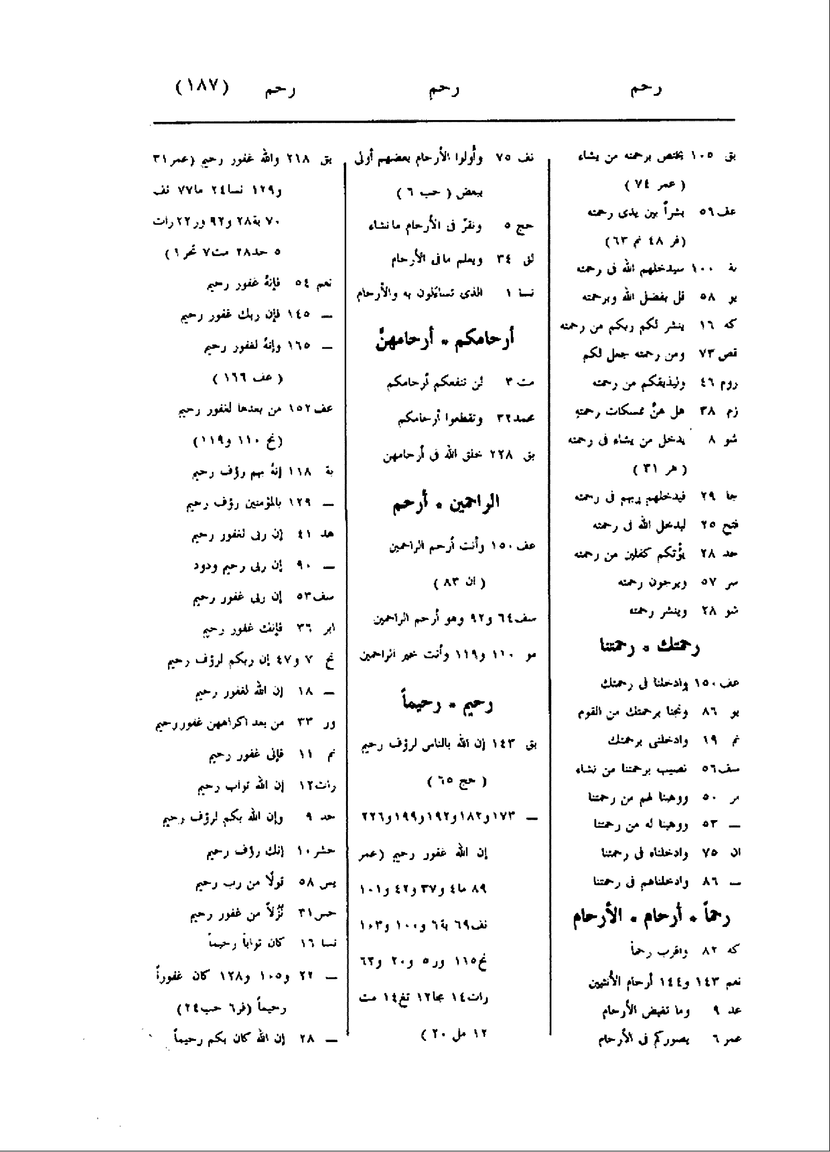 زم 38 هل هنّ ممسكات رحمته شو 8 يدخل من يشاء فى رحمته (هر 31) جا 29 فيدخلهم ربهم فى رحمته فتح 25 ليدخل الله فى رحمته حد 28 يؤتكم كفلين من رحمته سر 57 ويرجون رحمته شو 28 وينشر رحمته رحمتك رحمتنا عف 150 وادخلنا فى رحمتك يو 86 ونجنا برحمتك من القوم نم 19 وادخلنى برحمتك سف 56 نصيب برحمتنا من نشاء مر 50 ووهبنا لهم من رحمتنا- 53 ووهبنا له من رحمتنا ان 75 وادخلناه فى رحمتنا- 86 وادخلناه فى رحمتنا رحما أرحام الأرحام كه 82 واقرب رحما نعم 143 و 144 أرحام الأنثيين عد 9 وما تغيض الأرحام عمر 6 يصوركم فى الأرحام نف 75 وأولوا الأرحام بعضهم أولى ببعض (حب 6) حج 5 ونقرّ فى الأرحام ما نشاء لق 34 ويعلم ما فى الأرحام نسا 1 الذى تساءلون به والأرحام أرحامكم أرحامهنّ مت 3 لن تنفعكم أرحامكم محمد 32 وتقطعوا أرحامكم بق 228 خلق الله فى أرحامهن الراحمين أرحم عف 150 وأنت أرحم الراحمين (ان 83) سف 64 و 92 وهو أرحم الراحمين مو 110 و 119 وأنت خير الراحمين رحيم رحيما بق 143 إن الله بالناس لرؤف رحيم (حج 65) - 173 و 182 و 192 و 199 و 226 إن الله غفور رحيم (عمر 89 ما 4 و 37 و 42 و 101 نف 69 بة 6 و 100 و 103 نح 115 ور 5 و 20 و 62 رات 14 مجا 12 تغ 14 مت 12 مل 20) بق 218 والله غفور رحيم (عمر 31 و 129 نسا 24 ما 77 نف 70 بة 28 و 92 ور 22 رات 5 حد 28 مت 7 تحر 1) نعم 54 فإنه غفور رحيم- 145 فإن ربك غفور رحيم- 165 وإنه لغفور رحيم (عف 166) عف 152 من بعدها لغفور رحيم (نح 110 و 119) بة 118 إنه بهم رؤف رحيم- 129 بالمؤمنين رؤف رحيم هد 41 إن ربى لغفور رحيم- 90 إن ربى رحيم ودود سف 53 إن ربى غفور رحيم ابر 36 فإنك غفور رحيم نح 7 و 47 إن ربكم لرؤف رحيم- 18 إن الله لغفور رحيم ور 33 من بعد اكراههن غفور رحيم نم 11 فإنى غفور رحيم رات 12 إن الله تواب رحيم حد 9 وإن الله بكم لرؤف رحيم حشر 10 إنك رؤف رحيم يس 58 قولا من رب رحيم حس 31 نزلا من غفور رحيم نسا 16 كان توابا رحيما- 22 و 105 و 128 كان غفورا رحيما (فر 6 حب 24) - 28 إن الله كان بكم رحيما