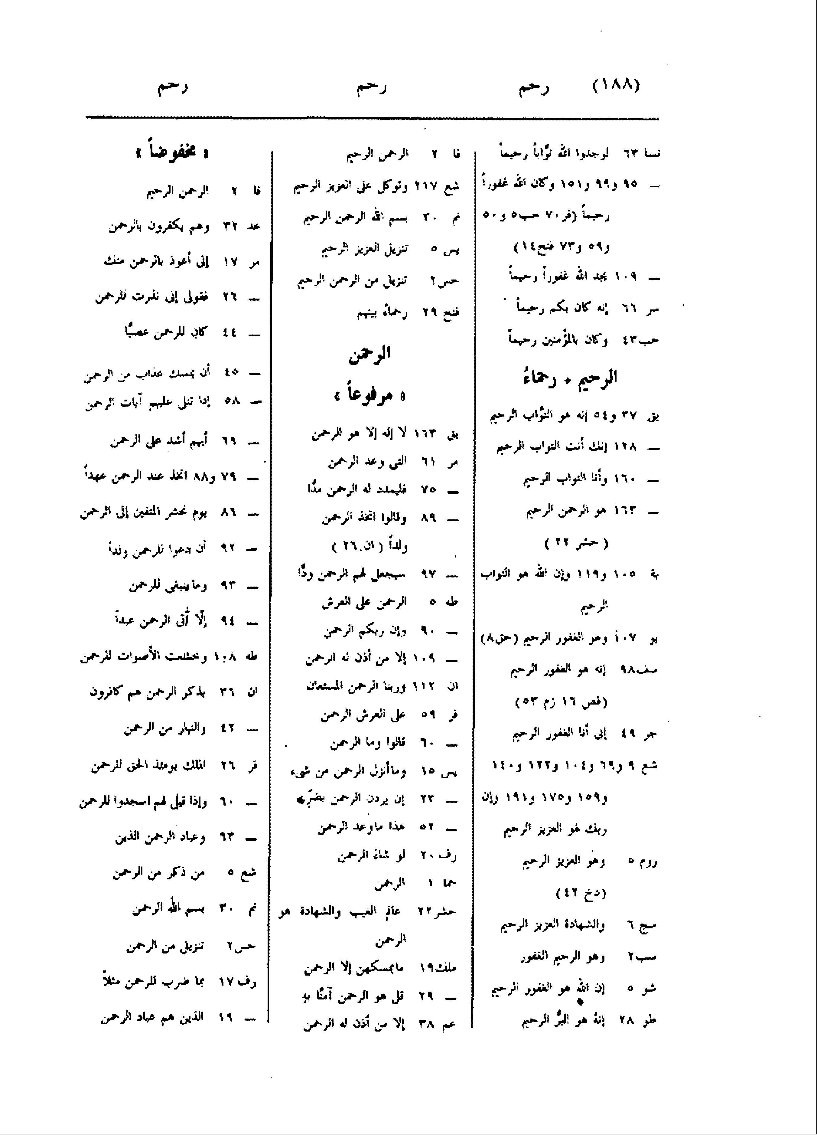 نسا 63 لوجدوا الله توّابا رحيما- 95 و 99 و 151 وكان الله غفورا رحيما (فر 70 حب 5 و 50 و 59 و 73 فتح 14) - 109 يجد الله غفورا رحيما سر 66 إنه كان بكم رحيما حب 43 وكان بالمؤمنين رحيما الرحيم رحماء بق 37 و 54 إنه هو التوّاب الرحيم- 128 إنك أنت التواب الرحيم- 160 وأنا التواب الرحيم- 163 هو الرحمن الرحيم (حشر 22) بة 105 و 119 وإن الله هو التواب الرحيم يو 107 وهو الغفور الرحيم (حق 8) سف 98 إنه هو الغفور الرحيم (قص 16 زم 53) جر 49 إنى أنا الغفور الرحيم شع 9 و 69 و 104 و 122 و 140 و 159 و 175 و 191 وإن ربك لهو العزيز الرحيم روم 5 وهو العزيز الرحيم روم 5 وهو العزيز الرحيم (دخ 42) سج 6 والشهادة العزيز الرحيم سب 2 وهو الرحيم الغفور شو 5 إن الله هو الغفور الرحيم طو 28 إنه هو البرّ الرحيم فا 2 الرحمن الرحيم شع 217 وتوكل على العزيز الرحيم نم 30 بسم الله الرحمن الرحيم يس 5 تنزيل العزيز الرحيم حس 2 تنزيل من الرحمن الرحيم فتح 29 رحماء بينهم الرحمن «مرفوعا» بق 163 لا إله إلا هو الرحمن مر 61 التى وعد الرحمن- 75 فليمدد له الرحمن مدّا- 89 وقالوا اتخذ الرحمن ولدا (ان 26) - 97 سيجعل لهم الرحمن ودّا طه 5 الرحمن على العرش- 90 وإن ربكم الرحمن- 109 إلا من أذن له الرحمن ان 112 وربنا الرحمن المستعان فر 59 على العرش الرحمن- 60 قالوا وما الرحمن يس 15 وما أنزل الرحمن من شىء- 23 إن يردن الرحمن بضرّ- 52 هذا ما وعد الرحمن رف 20 لو شاء الرحمن حما 1 الرحمن حشر 22 عالم الغيب والشهادة هو الرحمن ملك 19 ما يمسكهن إلا الرحمن- 29 قل هو الرحمن آمنّا به عم 38 إلا من أذن له الرحمن مخفوضا فا 2 الرحمن الرحيم عد 32 وهم يكفرون بالرحمن مر 17 إنى أعوذ بالرحمن منك- 26 فقولى إنى نذرت للرحمن- 44 كان للرحمن عصيّا- 45 أن يمسك عذاب من الرحمن- 58 إذا تتلى عليهم آيات الرحمن- 69 أيهم أشد على الرحمن- 79 و 88 اتخذ عند الرحمن عهدا- 86 يوم نحشر المتقين إلى الرحمن- 92 أن دعوا للرحمن ولدا- 93 وما ينبغى للرحمن- 94 إلّا آتى الرحمن عبدا طه 108 وخشعت الأصوات للرحمن ان 36 بذكر الرحمن هم كافرون- 42 والنهار من الرحمن فر 26 الملك يومئذ الحق للرحمن- 60 وإذا قيل لهم اسجدوا للرحمن- 63 وعباد الرحمن الذين شع 5 من ذكر من الرحمن نم 30 بسم الله الرحمن حس 2 تنزيل من الرحمن رف 17 بما ضرب للرحمن مثلا- 19 الذين هم عباد الرحمن