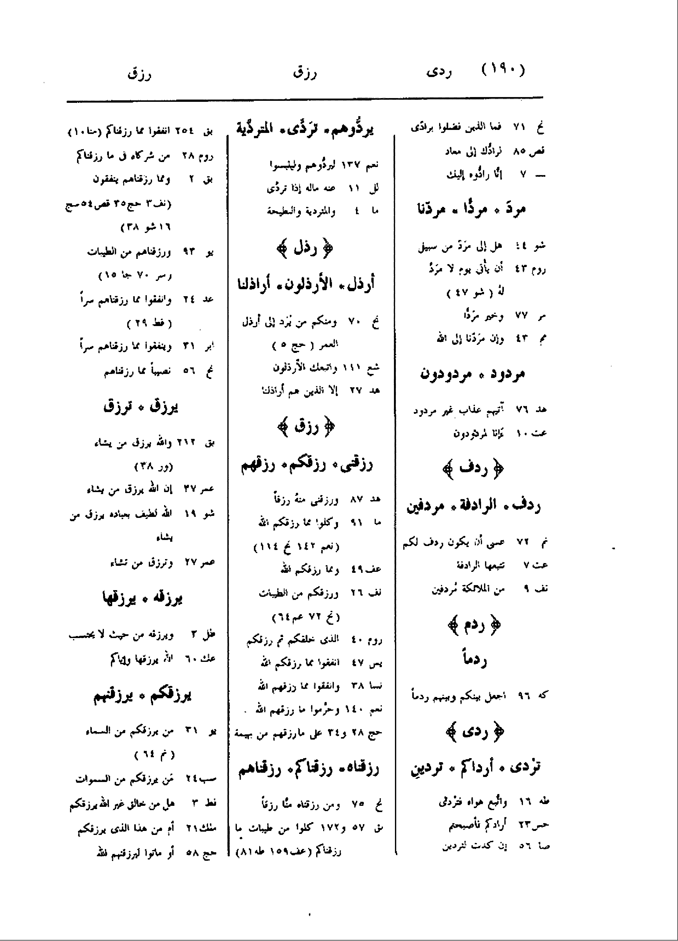 نح 71 فما الذين فضلوا برادّى قص 85 لرادّك إلى معاد- 7 إنّا رادّوه إليك مردّ مردّا مردّنا شو 44 هل إلى مردّ من سبيل روم 43 أن يأتى يوم لا مردّ له (شو 47) مر 77 وخير مردّا مم 43 وإن مردّنا إلى الله مردود مردودون هد 76 آتيهم عذاب غير مردود عت 10 ءإنا لمردودون ردف ردف الرادفة مردفين نم 72 عسى أن يكون ردف لكم عت 7 تتبعها الرادفة نف 9 من الملائكة مردفين ردم ردما كه 96 اجعل بينكم وبينهم ردما ردى تردى أرداكم تردين طه 16 واتّبع هواه فتردى حس 23 أرادكم فأصبحتم صا 56 إن كدت لتردين يردّوهم تردّى المتردّية نعم 137 ليردّوهم وليلبسوا لل 11 عنه ماله إذا تردّى ما 4 والمتردية والنطيحة رذل أرذل الأرذلون أراذلنا نح 70 ومنكم من يرد إلى أرذل العمر (حج 5) شع 111 واتبعك الأرذلون هد 27 إلا الذين هم أراذلنا رزق رزقنى رزقكم رزقهم هد 87 ورزقنى منه رزقا ما 91 وكلوا مما رزقكم الله (نعم 142 نح 114) عف 49 ومما رزقكم الله نف 26 ورزقكم من الطيبات (نح 72 عم 64) روم 40 الذى خلقكم ثم رزقكم يس 47 اتفقوا مما رزقكم الله نسا 38 وانفقوا مما رزقهم الله نعم 140 وحرّموا ما رزقهم الله حج 28 و 34 على ما رزقهم من بهيمة رزقناه رزقناكم رزقناهم نح 75 ومن رزقناه منّا رزقا بق 57 و 172 كلوا من طيبات ما رزقناكم (عف 159 طه 81) بق 254 انفقوا مما رزقناكم (منا 10) روم 28 من شركاء فى ما رزقناكم بق 2 ومما رزقناهم ينفقون (نف 3 حج 35 قص 54 سج 16 شو 38) يو 93 ورزقناهم من الطيبات (سر 70 جا 15) عد 24 وانفقوا مما رزقناهم سرا (فط 29) ابر 31 وينفقوا مما رزقناهم سرا نح 56 نصيبا مما رزقناهم يرزق ترزق بق 212 والله يرزق من يشاء (ور 38) عمر 37 إن الله يرزق من يشاء شو 19 الله لطيف بعباده يرزق من يشاء عمر 27 وترزق من تشاء يرزقه يرزقها طل 3 ويرزقه من حيث لا يحتسب عك 60 الله يرزقها وإياكم يرزقكم يرزقنهم يو 31 من يرزقكم من السماء (نم 64) سب 24 من يرزقكم من السموات فط 3 هل من خالق غير الله يرزقكم ملك 21 أم من هذا الذى يرزقكم حج 58 أو ماتوا ليرزقنهم الله