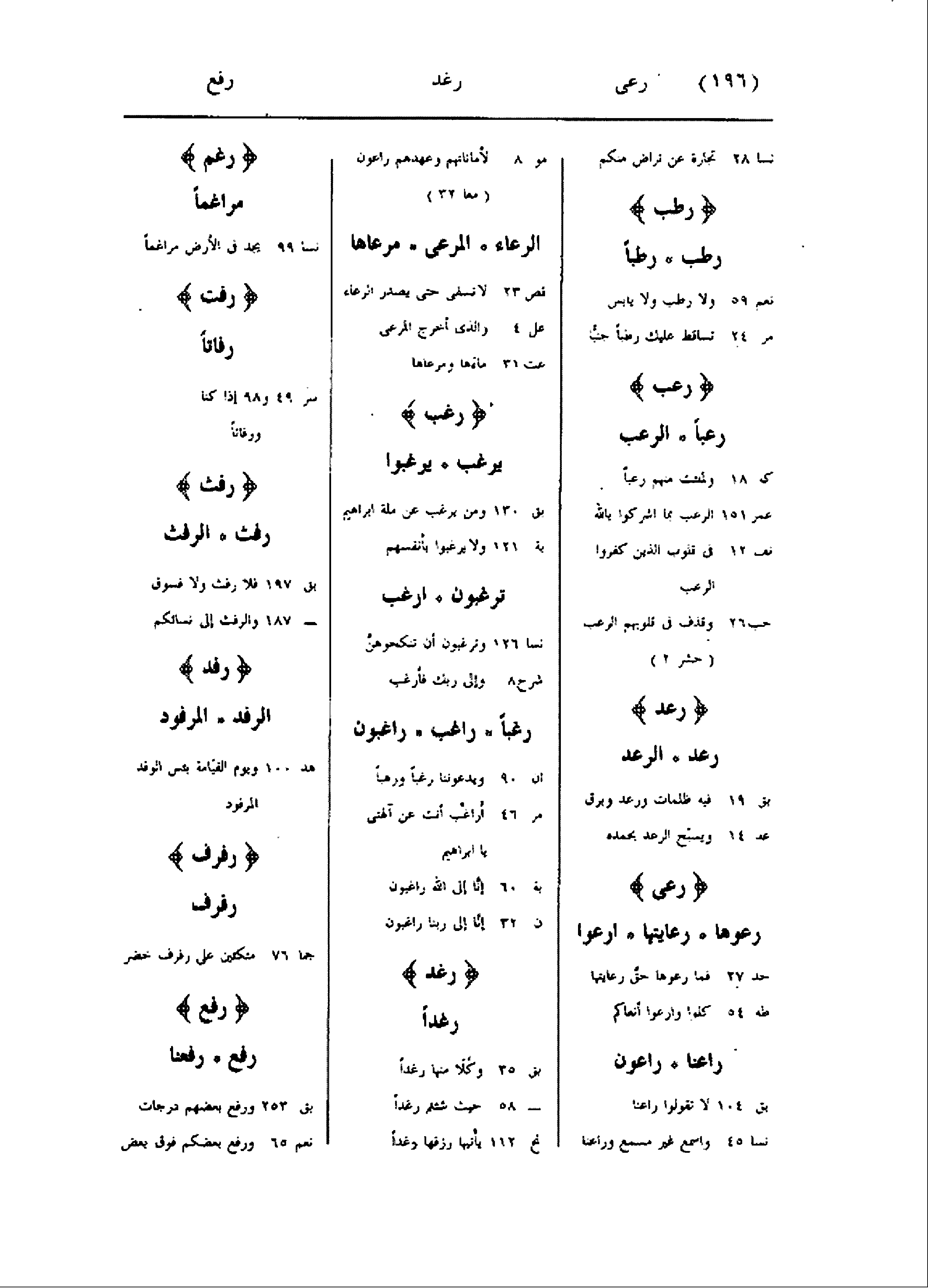 نسا 28 تجارة عن تراض منكم رطب رطب رطبا نعم 59 ولا رطب ولا يابس مر 24 تساقط عليك رطبا جنيّا رعب رعبا الرعب كه 18 ولملئت منهم رعبا عمر 151 الرعب بما اشركوا بالله نف 12 فى قلوب الذين كفروا الرعب حب 26 وقذف فى قلوبهم الرعب (حشر 2) رعد رعد الرعد بق 19 فيه ظلمات ورعد وبرق عد 14 ويسبّح الرعد بحمده رعى رعوها رعايتها ارعوا حد 27 فما رعوها حقّ رعايتها طه 54 كلوا وارعوا أنعاكم راعنا راعون بق 104 لا تقولوا راعنا نسا 45 واسمع غير مسمع وراعنا مو 8 لأماناتهم وعهدهم راعون (معا 32) الرعاء المرعى مرعاها قص 23 لا نسقى حتى يصدر الرعاء عل 4 والذى أخرج المرعى عت 31 ماءها ومرعاها رغب يرغب يرغبوا بق 130 ومن يرغب عن ملة إبراهيم بة 121 ولا يرغبوا بأنفسهم ترغبون ارغب نسا 126 وترغبون أن تنكحوهنّ شرح 8 وإلى ربك فأرغب رغبا راغب راغبون ان 90 ويدعوننا رغبا ورهبا مر 46 أراغب أنت عن آلهتى يا ابراهيم بة 60 إنّا إلى الله راغبون ن 32 إنّا إلى ربنا راغبون رغد رغدا بق 35 وكلا منها رغدا- 58 حيث شئتم رغدا نح 112 يأتيها رزقها رغدا رغم مراغما نسا 99 يجد فى الأرض مراغما رفت رفاتا سر 49 و 98 إذا كنا ورفاتا رفث رفث الرفث بق 197 فلا رفث ولا فسوق- 187 والرفث إلى نساءكم رفد الرفد المرفود هد 100 ويوم القيامة بئس الوفد المرفود رفرف رفرف جما 76 متكئين على رفرف خضر رفع رفع رفعنا بق 253 ورفع بعضهم درجات نعم 65 ورفع بعضكم فوق بعض
