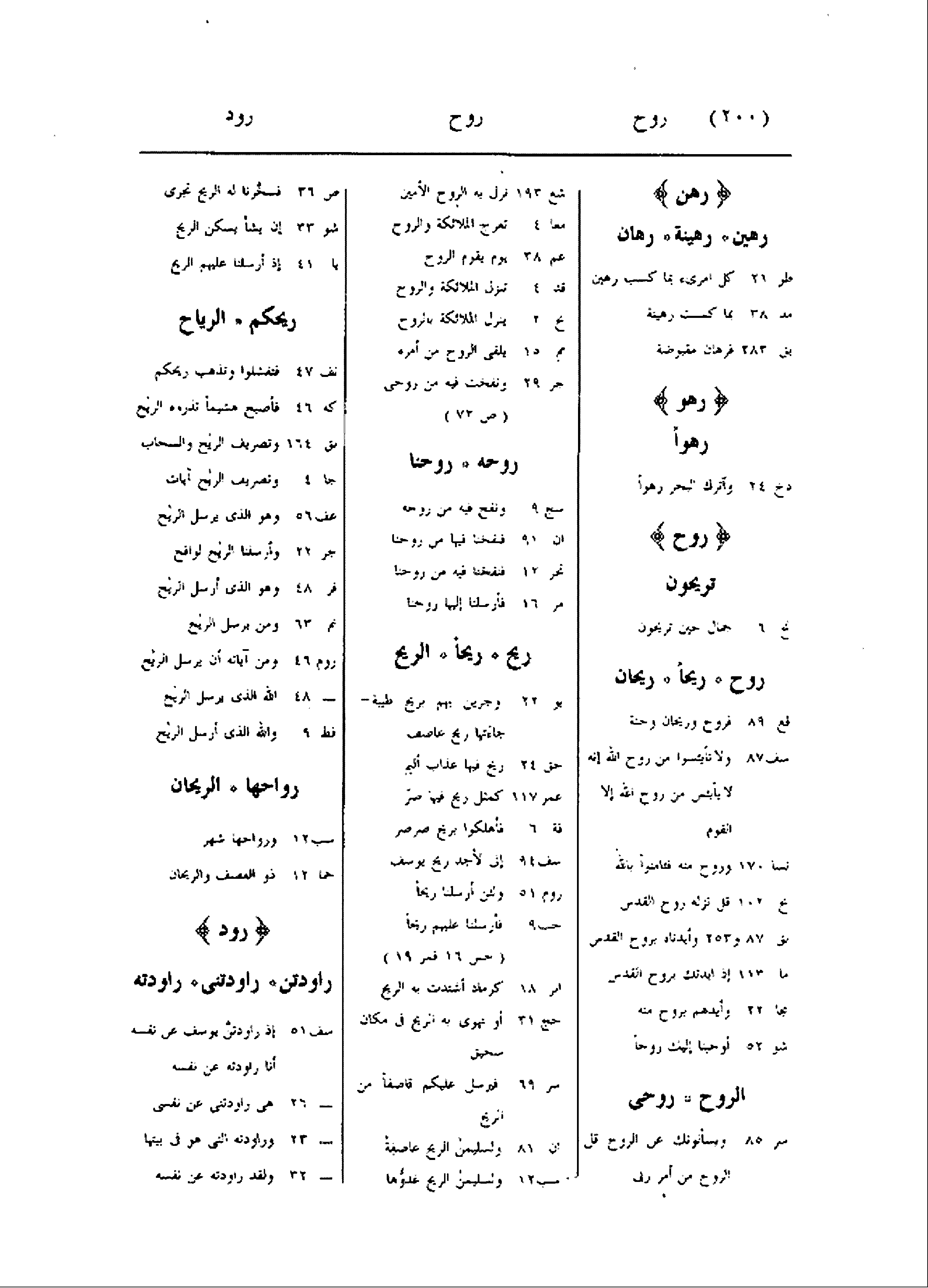 من روحه ان 91 فنفخنا فيها من روحنا تحر 12 فنفخنا فيه من روحنا مر 16 فأرسلنا إليها روحنا ريح ريحا الريح يو 22 وجرين بهم بريح طيبة- جاءتها ريح عاصف حق 24 ريح فيها عذاب أليم عمر 117 كمثل ريح فيها صرّ قة 6 فأهلكوا بريح صرصر سف 94 إنى لأجد ريح يوسف روم 51 ولئن أرسلنا ريحا حب 9 فأرسلنا عليهم ريحا (حس 16 قمر 19) ابر 18 كرماد أشتدت به الريح حج 31 أو تهوى به الريح فى مكان سحيق سر 69 فيرسل عليكم قاصفا من الريح ان 81 ولسليمن الريح عاصفة سب 12 ولسليمن الريح غدوّها ص 36 فسخّرنا له الريح تجرى شو 33 إن يشأ يسكن الريح يا 41 إذ أرسلنا عليهم الريح ريحكم الرياح نف 47 فتفشلوا وتذهب ريحكم كه 46 فأصبح هشيما تذروه الريح بق 164 وتصريف الريح والسحاب جا 4 وتصريف الريح آيات عف 56 وهو الذى يرسل الريح جر 22 وأرسلنا الريح لواقح فر 48 وهو الذى أرسل الريح نم 63 ومن يرسل الريح روم 46 ومن آياته أن يرسل الريح- 48 الله الذى يرسل الريح فط 9 والله الذى أرسل الريح رواحها الريحان سب 12 ورواحها شهر حما 12 ذو العصف والريحان رود راودتن راودتنى راودته سف 51 إذ راودتنّ يوسف عن نفسه أنا روادته عن نفسه- 26 هى راودتنى عن نفسى- 23 وراودته التى هو فى بيتها- 32 ولقد راودته عن نفسه