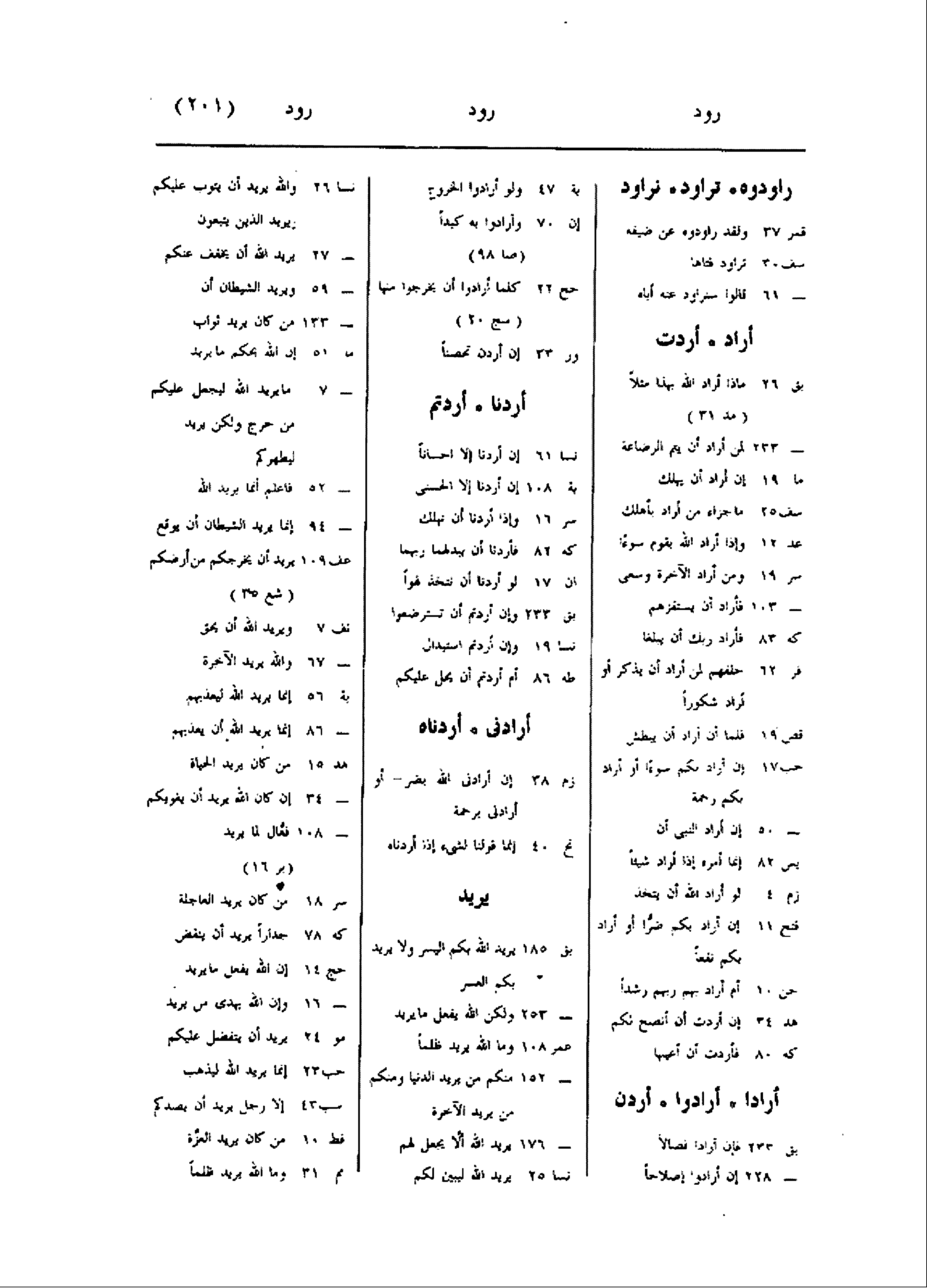 راودوه تراود نراود قمر 37 ولقد راودوه عن ضيفه سف 30 تراود فتاها- 61 قالوا سنراود عنه أباه أراد أردت بق 26ماذا أراد الله بهذا مثلا (مد 31) - 233 لمن أراد أن يتم الرضاعة ما 19 إن أراد أن يهلك سف 25 ما جزاء من أراد بأهلك عد 12 وإذا أراد الله بقوم سوءا سر 19 ومن أراد الآخرة وسعى- 103 فأراد أن يستفزهم كه 83 فأراد ربك أن يبلغا فر 62 خلفهم لمن أراد أن يذكر أو أراد شكورا قص 19 فلما أن أراد أن يبطش حب 17 إن أراد بكم سوءا أو أراد بكم رحمة- 50 إن أراد النبى أن يس 82 إنّما أمره إذا أراد شيئا زم 4 لو أراد الله أن يتخذ فتح 11 إن أراد بكم ضرّا أو أراد بكم نفعا جن 10 أم أراد بهم ربهم رشدا هد 34 إن أردت أن أنصح لكم كه 80 فأردت أن أعيبها أرادا أرادوا أردن بق 233 فإن أراد فصالا- 228 إن أرادوا إصلاحا بة 47 ولو أرادوا الخروج إن 70 وأرادوا به كيدا (صا 98) حج 22 كلما أرادوا أن يخرجوا منها (سج 20) ور 33 إن أردن تحصنا أردنا أردتم نسا 61 إن أردنا إلا احسانا بة 108 إن أردنا إلا الحسنى سر 16 وإذا أردنا أن نهلك كه 82 فأردنا أن يبدلهما ربهما ان 17 لو أردنا أن نتخذ لهوا بق 233 وإن أردتم أن تسترضعوا نسا 19 وإن أردتم استبدال طه 86 أم أردتم أن يحل عليكم أرادنى أردناه زم 38 إن أرادنى الله بضر- أو أرادنى برحمة نح 40 إنما قولنا لشىء إذا أردناه يريد بق 185 يريد الله بكم اليسر ولا يريد بكم العسر- 253 ولكن الله يفعل ما يريد عمر 108 وما الله يريد ظلما- 152 منكم من يريد الدنيا ومنكم من يريد الآخرة- 176 يريد الله ألّا يجعل لهم نسا 25 يريد الله ليبين لكم نسا 26 والله يريد أن يتوب عليكم ويريد الذين يتبعون- 27 يريد الله أن يخفف عنكم- 59 ويريد الشيطان أن- 133 من كان يريد ثواب ما 51 إن الله يحكم ما يريد- 7 ما يريد الله ليجعل عليكم من حرج ولكن يريد ليطهركم- 52 فاعلم أنما يريد الله- 94 إنما يريد الشيطان أن يوقع عف 109 يريد أن يخرجكم من أرضكم (شع 35) نف 7 ويريد الله أن يحق- 67 والله يريد الآخرة بة 56 إنما يريد الله ليعذبهم- 86 إنما يريد الله أن يعذبهم هد 15 من كان يريد الحياة- 34 إن كان الله يريد أن يغويكم- 108 فعّال لما يريد (بر 16) سر 18 من كان يريد العاجلة كه 78 جدارا يريد أن ينقض حج 14 إن الله يفعل ما يريد- 16 وإن الله يهدى من يريد مو 24 يريد أن يتفضل عليكم حب 23 إنما يريد الله ليذهب سب 43 إلا رجل يريد أن يصدكم فط 10 من كان يريد العزّة مم 31 وما الله يريد ظلما