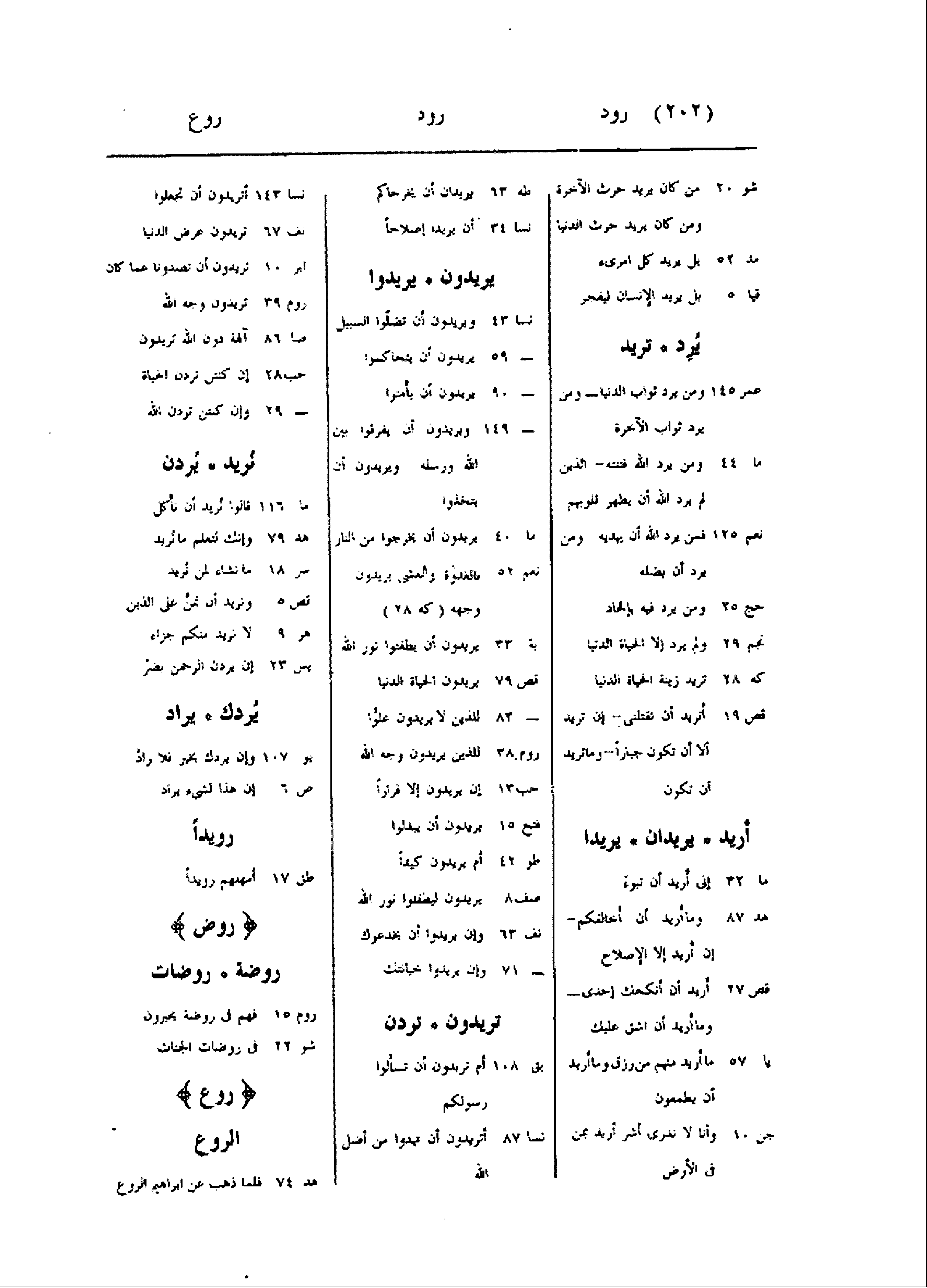 أن تكون أريد يريدان يريدا ما 32 إنى أريد أن تبوء هد 87 وما أريد أن أخالفكم- إن أريد إلا الإصلاح قص 27 أريد أن أنكحك إحدى- وما أريد أن اشق عليك يا 57 ما أريد منهم من رزق وما أريد أن يطمعون جن 10 وأنا لا ندرى أشر أريد بمن فى الأرض طه 63 يريدان أن يخرجاكم نسا 34 أن يريدا إصلاحا يريدون يريدوا نسا 43 ويريدون أن تضلّوا السبيل- 59 يريدون أن يتحاكموا- 90 يريدون أن يأمنوا- 149 ويريدون أن يفرقوا بين الله ورسله- ويريدون أن يتخذوا ما 40 يريدون أن يخرجوا من النار نعم 52 بالغدوة والعشى يريدون وجهه (كه 28) بة 33 يريدون أن يطفئوا نور الله قص 79 يريدون الحياة الدنيا- 83 للذين لا يريدون علوّا روم 38 للذين يريدون وجه الله حب 13 إن يريدون إلا فرارا فتح 15 يريدون أن يبدلوا طو 42 أم يريدون كيدا صف 8 يريدون ليطفئوا نور الله نف 63 وإن يريدوا أن يخدعوك- 71 وإن يريدوا خيانتك تريدون تردن بق 108 أم تريدون أن تسألوا رسولكم نسا 87 أتريدون أن تهدوا من أضل الله نسا 143 أتريدون أن تجعلوا نف 67 تريدون عرض الدنيا ابر 10 تريدون أن تصدونا عما كان روم 39 تريدون وجه الله صا 86 آلهة دون الله تريدون حب 28 إن كنتن تردن الحياة- 29 وإن كنتن تردن الله نريد يردن ما 116 قالوا نريد أن نأكل هد 79 وإنك لتعلم ما نريد سر 18 ما نشاء لمن نريد قص 5 ونريد أن نمنّ على الذين هر 9 لا نريد منكم جزاء يس 23 إن يردن الرحمن بضرّ يردك يراد يو 107 وإن يردك بخير فلا رادّ ص 6 إن هذا لشىء يراد رويدا طق 17 أمهلهم رويدا روض روضة روضات روم 15 فهم فى روضة يحبرون شو 22 فى روضات الجنات روع الروع هد 74 فلما ذهب عن ابراهيم الروع