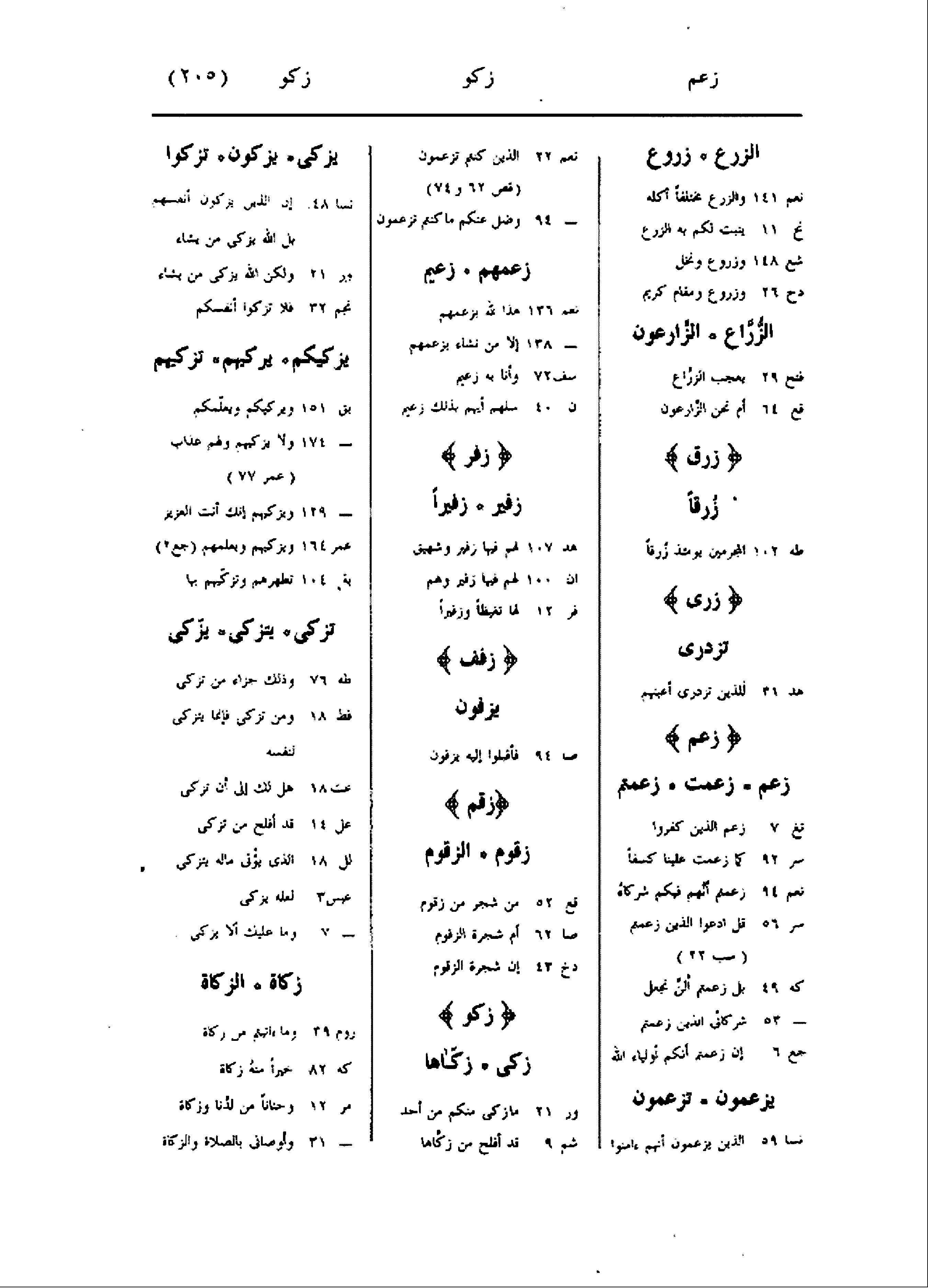 الزرع زروع نعم 141 والزرع مختلفا أكله نح 11 ينبت لكم به الزرع شع 148 وزروع ونخل دخ 26 وزروع ومقام كريم الزّرّاع الزّارعون فتح 29 يعجب الزرّاع قع 64 أم نحن الزّارعون زرق زرقا طه 102 المجرمين يومئذ زرقا زرى تزدرى هد 31 للذين تزدرى أعينهم زعم زعم زعمت زعمتم تغ 7 زعم الذين كفروا سر 92 كما زعمت علينا كسفا نعم 94 زعمتم أنّهم فيكم شركاء سر 56 قل ادعوا الذين زعمتم (سب 22) كه 49 بل زعمتم ألنّ نجعل- 53 شركائى الذين زعمتم جع 6 إن زعمتم أنكم أولياء الله يزعمون تزعمون نسا 59 الذين يزعمون أنهم ءامنوا نعم 22 الذين كنتم تزعمون (قص 62 و 74) - 94 وضل عنكم ما كنتم تزعمون زعمهم زعيم نعم 136 هذا لله بزعمهم- 138 إلا من نشاء بزعمهم سف 72 وأنا به زعيم ن 40 سلهم أيهم بذلك زعيم زفر زفير زفيرا هد 107 لهم فيها زفير وشهيق ان 100 لهم فيها زفير وهم فر 12 لها تغيظا وزفيرا زفف يزفون صا 94 فأقبلوا إليه يزفون زقم زقوم الزقوم قع 52 من شجر من زقوم صا 62 أم شجرة الزقوم دخ 43 إن شجرة الزقوم زكو زكى زكّاها ور 21 ما زكى منكم من أحد شم 9 قد أفلح من زكّاها يزكى يزكون تزكوا نسا 48 إن الذين يزكون أنفسهم بل الله يزكى من يشاء ور 21 ولكن الله يزكى من يشاء نجم 32 فلا تزكوا أنفسكم يزكيكم يركيهم تزكيهم بق 151 ويزكيكم ويعلّمكم- 174 ولا يزكيهم ولهم عذاب (عمر 77) - 129 ويزكيهم إنك أنت العزيز عمر 164 ويزكيهم ويعلمهم (جع 2) بة 104 تطهرهم وتزكّيهم بها تزكى يتزكى يزّكى طه 76 وذلك جزاء من تزكى فط 18 ومن تزكى فإنما يتزكى لنفسه عت 18 هل لك إلى أن تزكى عل 14 قد أفلح من تزكى لل 18 الذى يؤتى ماله يتزكى عبس 3 لعله يزكى- 7 وما عليك ألا يزكى زكاة الزكاة روم 39 وما ءاتيتم من زكاة كه 82 خيرا منه زكاة مر 12 وحنانا من لدنا وزكاة- 31 وأوصانى بالصلاة والزكاة