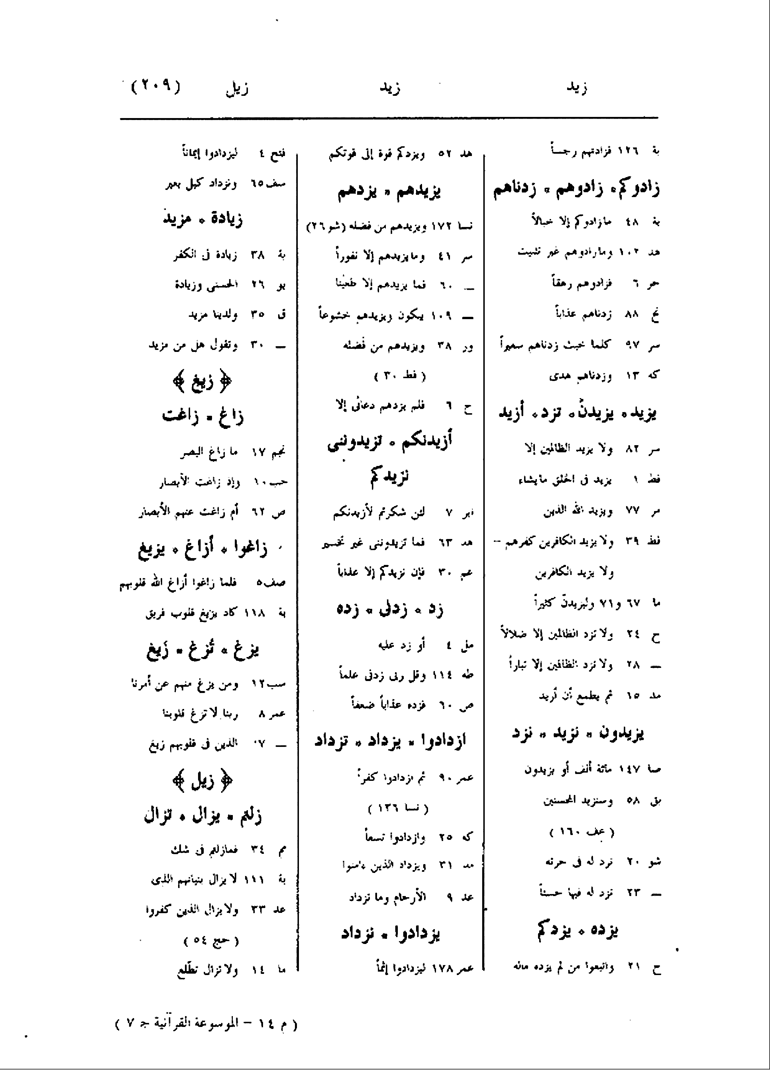 بة 126 فزادتهم رجسا زادوكم زادوهم زدناهم بة 48 ما زادوكم إلا خبالا هد 102 وما زادوهم غير تثبيت حر 6 فزادوهم رهقا نح 88 زدناهم عذابا سر 97 كلما خبث زدناهم سعيرا كه 13 وزدناهم هدى يزيد يزيدنّ تزد أزيد سر 82 ولا يزيد الظالمين إلا فط 1 يزيد فى الخلق ما يشاء مر 77 ويزيد الله الذين فط 39 ولا يزيد الكافرين كفرهم- ولا يزيد الكافرين ما 67 و 71 وليزيدنّ كثيرا ح 24 ولا تزد الظالمين إلا ضلالا- 28 ولا تزد الظالمين إلا تبارا مد 15 ثم يطمع أن أزيد يزيدون نزيد نزد صا 147 مائة ألف أو يزيدون بق 58 وسنزيد المحسنين (عف 160) شو 20 نزد له فى حرثه- 23 نزد له فيها حسنا يزده يزدكم ح 21 واتبعوا من لم يزده ماله هد 52 ويزدكم قوة إلى قوتكم يزيدهم يزدهم نسا 172 ويزيدهم من فضله (شو 26) سر 41 وما يزيدهم إلا نفورا- 60 فما يزيدهم إلا طغيانا- 109 يبكون ويزيدهم خشوعا ور 38 ويزيدهم من فضله (فط 30) ح 6 فلم يزدهم دعائى إلا أزيدنكم تزيدوننى نزيدكم ابر 7 لئن شكرتم لأزيدنكم هد 63 فما تزيدوننى غير تخسير عم 30 فإن نزيدكم إلا عذابا زد زدنى زده مل 4 أو زد عليه طه 114 وقل ربى زدنى علما ص 60 فزده عذابا ضعفا ازدادوا يزداد تزداد عمر 90 ثم ازدادوا كفرا (نسا 136) كه 25 وازدادوا تسعا مد 31 ويزداد الذين ءامنوا عد 9 الأرحام وما تزداد يزدادوا نزداد عمر 178 ليزدادوا إثما فتح 4 ليزدادوا إيمانا سف 65 ونزداد كيل بعير زيادة مزيد بة 38 زيادة فى الكفر يو 26 الحسنى وزيادة ق 35 ولدينا مزيد- 30 وتقول هل من مزيد زيغ زاغ زاغت نجم 17 ما زاغ البصر حب 10 وإذا زاغت الأبصار ص 62 أم زاغت عنهم الأبصار زاغوا أزاغ يزيغ صف 5 فلما زاغوا أزاغ الله قلوبهم بة 118 كاد يزيغ قلوب فريق يزغ تزغ زيغ سب 12 ومن يزغ منهم عن أمرنا عمر 8 ربنا لا تزغ قلوبنا- 7 الذين فى قلوبهم زيغ زيل زلتم يزال تزال مم 34 فما زلتم فى شك بة 111 لا يزال بنيانهم الذى عد 33 ولا يزال الذين كفروا (حج 54) ما 14 ولا تزال تطّلع