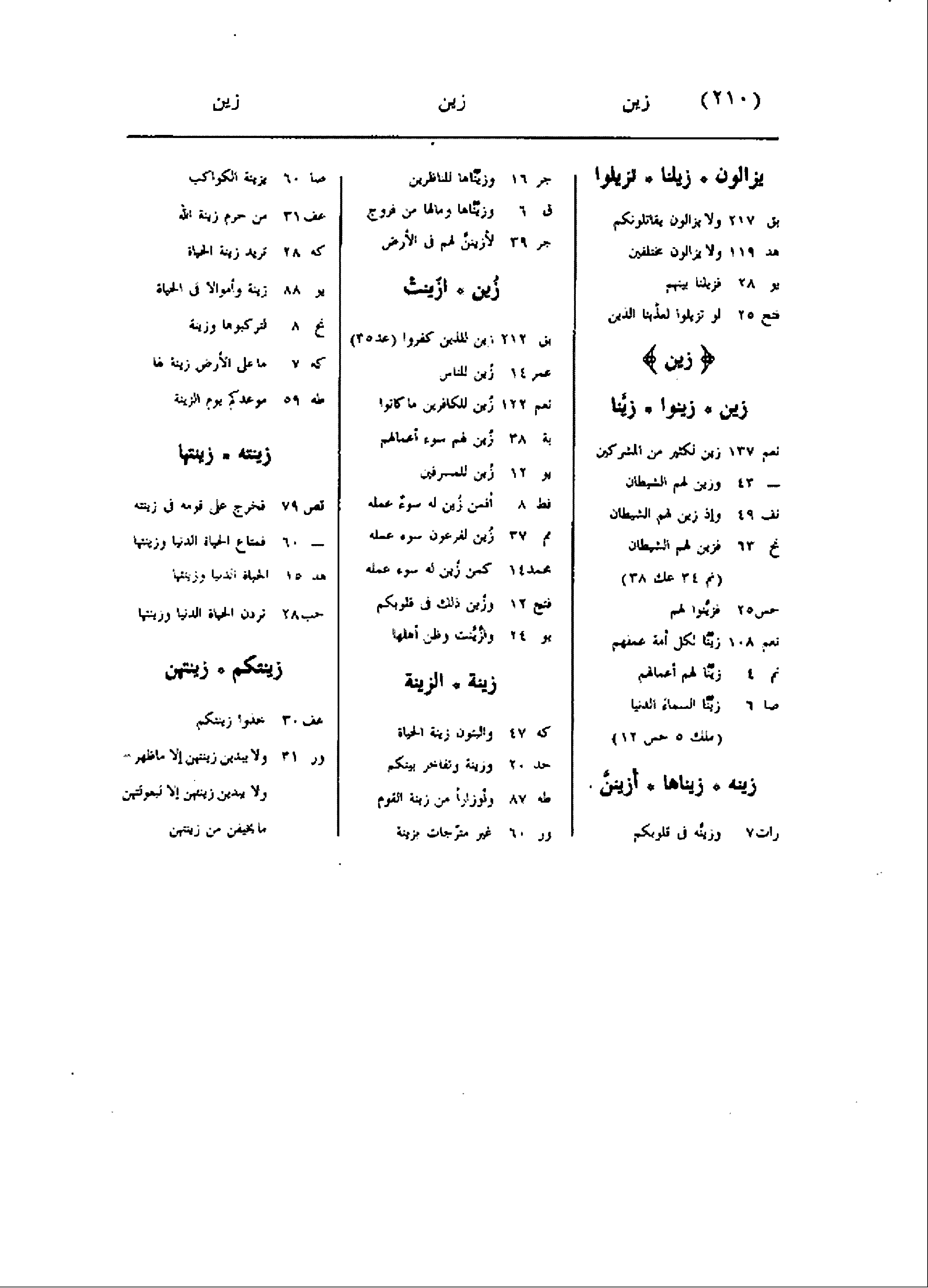 يزالون زيلنا تزيلوا بق 217 ولا يزالون يقاتلونكم هد 119 ولا يزالون مختلفين يو 28 فزيلنا بينهم فتح 25 لو تزيلوا لعذّبنا الذين زين زين زينوا زيّنا نعم 137 زين لكثير من المشركين- 43 وزين لهم الشيطان نف 49 وإذ زين لهم الشيطان نح 63 فزين لهم الشيطان (نم 34 عك 38) حس 25 فزيّنوا لهم نعم 108 زيّنا لكل أمة عملهم نم 4 زيّنا لهم أعمالهم صا 6 زيّنا السماء الدنيا (ملك 5 حس 12) زينه زيناها أزيننّ رات 7 وزيّنه فى قلوبكم جر 16 وزيّناها للناظرين ق 6 وزيّناها وما لها من فروج جر 39 لأزيننّ لهم فى الأرض زين ازّينت بق 212 زين للذين كفروا (عد 35) عمر 14 زين للناس نعم 122 زين للكافرين ما كانوا بة 38 زين لهم سوء أعمالهم يو 12 زين للمسرفين فط 8 أفمن زين له سوء عمله مم 37 زين لفرعون سوء عمله محمد 14 كمن زين له سوء عمله فتح 12 وزين ذلك فى قلوبكم يو 24 وازّيّنت وظن أهلها زينة الزينة كه 47 والبنون زينة الحياة حد 20 وزينة وتفاخر بينكم طه 87 وأوزارا من زينة القوم ور 60 غير مترّجات بزينة صا 60 بزينة الكواكب عف 31 من حرم زينة الله كه 28 تريد زينة الحياة يو 88 زينة وأموالا فى الحياة نح 8 لتركبوها وزينة كه 7 ما على الأرض زينة لها طه 59 موعدكم يوم الزينة زينته زينتها قص 79 فخرج على قومه فى زينته- 60 فمتاع الحياة الدنيا وزينتها هد 15 الحياة الدنيا وزينتها حب 28 تردن الحياة الدنيا وزينتها زينتكم زينتهن عف 30 خذوا زينتكم ور 31 ولا يبدين زينتهن إلا ما ظهر- ولا يبدين زينتهن إلا لبعولتهن ما يخيفن من زينتهن