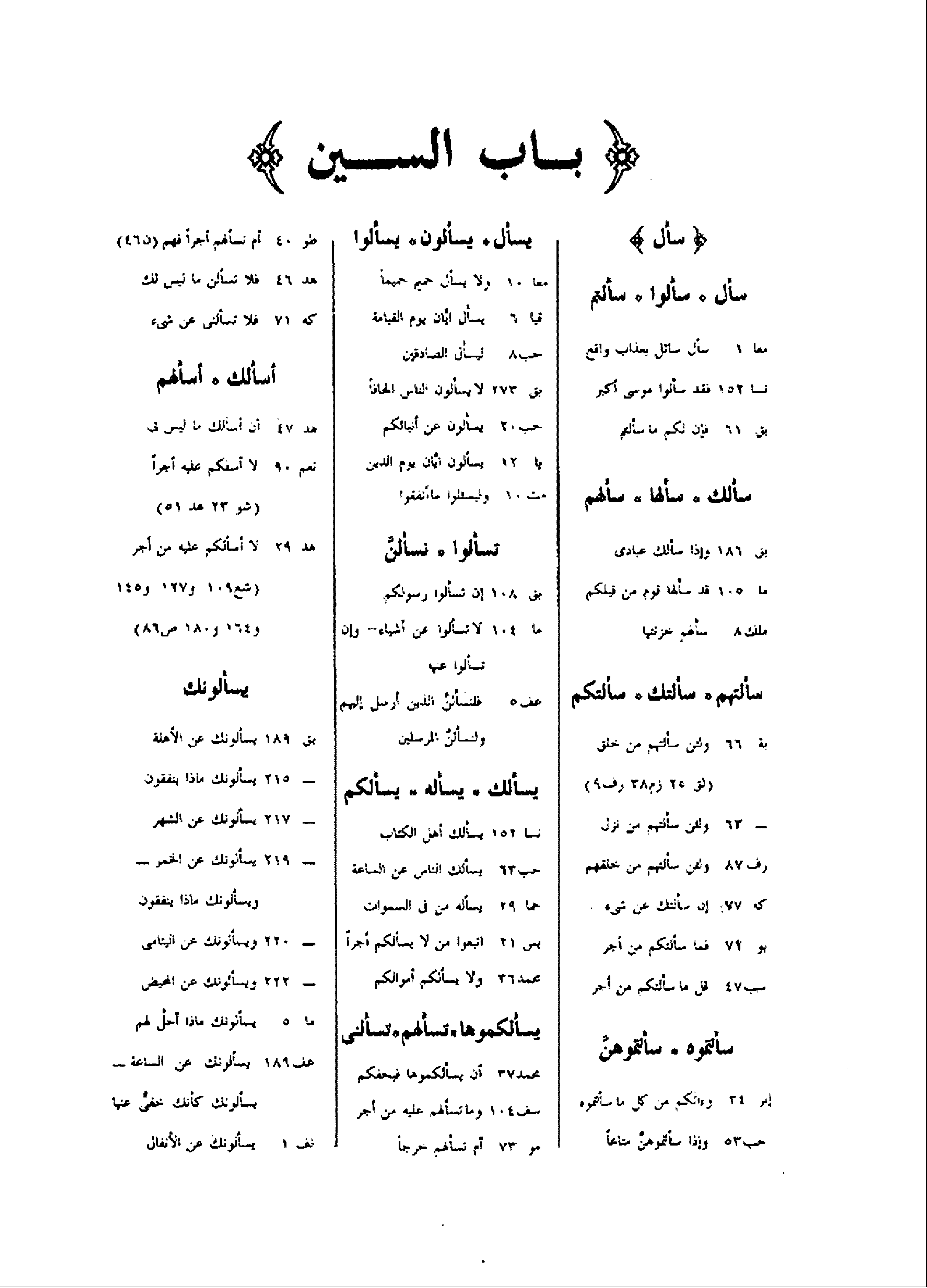 سأل سأل سألوا سألتم معا 1 سأل سائل بعذاب واقع نسا 152 فقد سألوا موسى أكبر بق 61 فإن لكم ما سألتم سألك سألها سألهم بق 186 وإذا سألك عبادى ما 105 قد سألها قوم من قبلكم ملك 8 سألهم خزنتها سألتهم سألتك سألتكم بة 66 ولئن سألتهم من خلق (لق 25 زم 38 رف 9) - 63 ولئن سألتهم من نزل رف 87 ولئن سألتهم من خلقهم كه 77 إن سألتك عن شىء يو 72 فما سألتكم من أجر سب 47 قل ما سألتكم من أجر سألتموه سألتموهنّ إبر 34 وءاتكم من كل ما سألتموه حب 53 وإذا سألتموهنّ متاعا يسأل يسألون يسألوا معا 10 ولا يسأل حميم حميما قيا 6 يسأل ايّان يوم القيامة حب 8 ليسأل الصادقين بق 273 لا يسألون الناس الحاقا حب 20 يسألون عن أنبائكم يا 12 يسألون ايّان يوم الدين مت 10 وليسئلوا ما أنفقوا تسألوا نسألنّ بق 108 إن تسألوا رسولكم ما 104 لا تسألوا عن أشياء- وإن تسألوا عنها عف 5 فلنسألنّ الذين أرسل إليهم ولنسألنّ المرسلين يسألك يسأله يسألكم نسا 152 يسألك أهل الكتاب حب 63 يسألك الناس عن الساعة حما 29 يسأله من فى السموات يس 21 اتبعوا من لا يسألكم أجرا محمد 36 ولا يسألكم أموالكم يسألكموها تسألهم تسألنى محمد 37 أن يسألكموها فيحفكم سف 104 وما تسألهم عليه من أجر مو 73 أم تسألهم خرجا طو 40 أم تسألهم أجرا فهم (ن 46) هد 46 فلا تسألن ما ليس لك كه 71 فلا تسألنى عن شىء أسألك أسألهم هد 47 أن أسألك ما ليس بى نعم 90 لا أسألكم عليه أجرا (شو 23 هد 51) هد 29 لا أسألكم عليه من أجر (شع 109 و 127 و 145 و 164 و 180 ص 86) يسألونك بق 189 يسألونك عن الأهلة- 215 يسألونك ماذا ينفقون- 217 يسألونك عن الشهر- 219 يسألونك عن الخمر- ويسألونك ماذا ينفقون- 220 ويسألونك عن اليتامى- 222 ويسألونك عن المحيض ما 5 يسألونك ماذا أحلّ لهم عف 186 يسألونك عن الساعة- يسألونك كأنك خفىّ عنها نف 1 يسألونك عن الأنفال