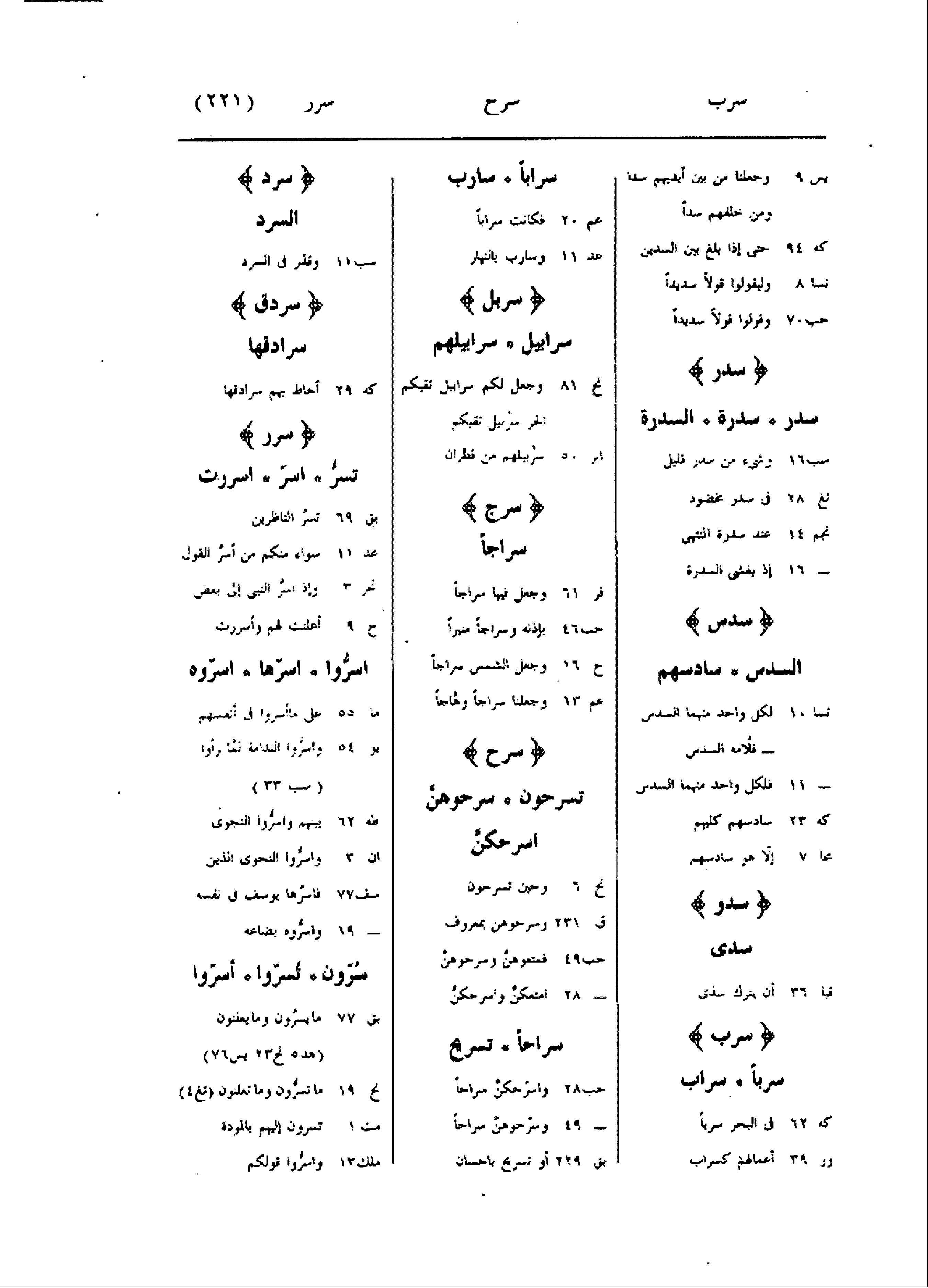 يس 9 وجعلنا من بين أيديهم سدا ومن خلفهم سدا كه 94 حتى إذا بلغ بين السدين نسا 8 وليقولوا قولا سديدا حب 70 وقولوا قولا سديدا سدر سدر سدرة السدرة سب 16 وشىء من سدر قليل تغ 28 فى سدر مخضود نجم 14 عند سدرة المنتهى- 16 إذ يغشى السدرة سدس السدس سادسهم نسا 10 لكل واحد منهما السدس- فلامه السدس- 11 فلكل واحد منهما السدس كه 23 سادسهم كليهم مجا 7 إلّا هو سادسهم سدو سدى قيا 36 أن يترك سدى سرب سربا سراب كه 62 فى البحر سربا ور 39 أعمالهم كسراب سرابا سارب عم 20 فكانت سرابا عد 11 وسارب بالنهار سربل سرابيل سرابيلهم نح 81 وجعل لكم سرابيل تقيكم الحر سربيل تقيكم ابر 50 سرابيلهم من قطران سرج سراجا فر 61 وجعل فيها سراجا حب 46 بإذنه وسراجا منيرا ح 16 وجعل الشمس سراجا عم 13 وجعلنا سراجا وهّاجا سرح تسرحون سرحوهنّ اسرحكنّ نح 6 وحين تسرحون ق 231 وسرحوهن بمعروف حب 49 فمتعوهنّ وسرحوهنّ- 28 امتعكنّ واسرحكنّ سراحا تسريح حب 28 واسرحكنّ سراحا- 49 وسرّحوهنّ سراحا بق 229 أو تسريح باحسان سرد السرد سب 11 وقدّر فى السرد سردق سرادقها كه 29 أحاط بهم سرادقها سرر تسرّ اسرّ اسررت بق 69 تسر الناظرين عد 11 سواء منكم من أسرّ القول تحر 3 وإذ اسرّ النبى إلى بعض ح 9 أعلنت لهم وأسررت اسرّوا اسرّها اسرّوه ما 55 على ما أسروا فى أنفسهم يو 54 واسرّوا الندامة لمّا رأوا (سب 33) طه 62 بينهم واسرّوا النجوى